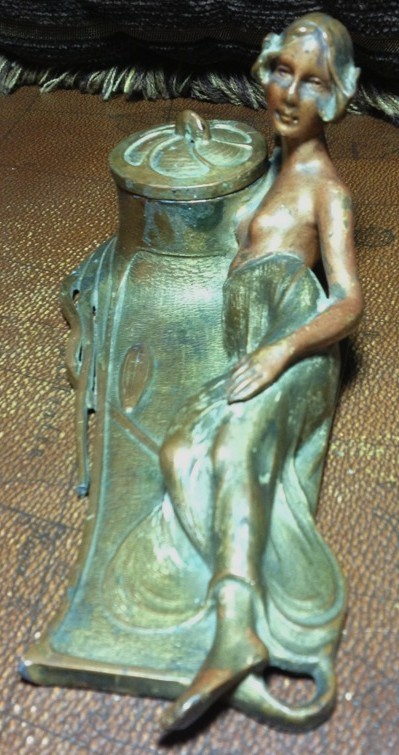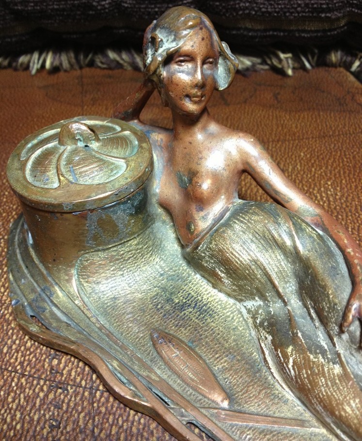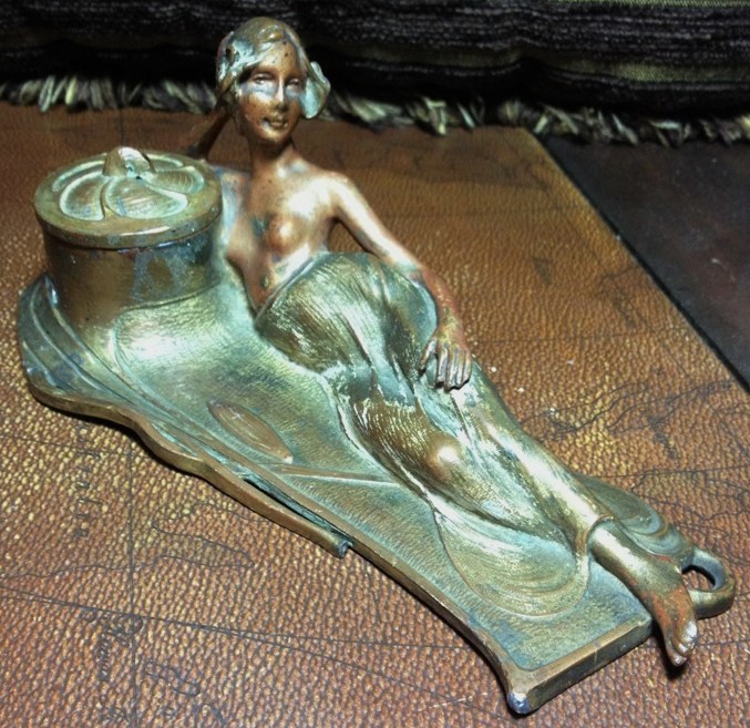 A semi-nude woman rests next to the inkwell with a hinged lid.