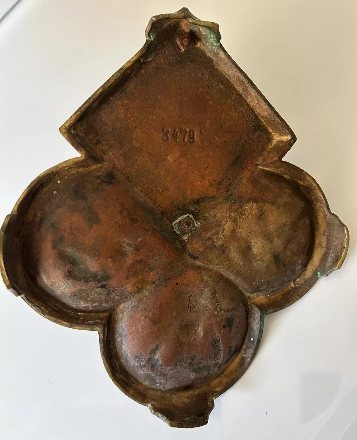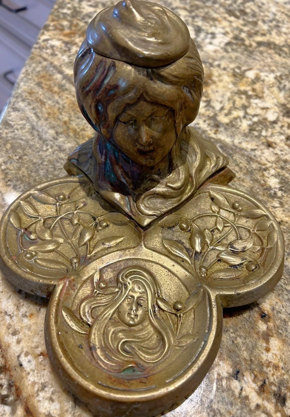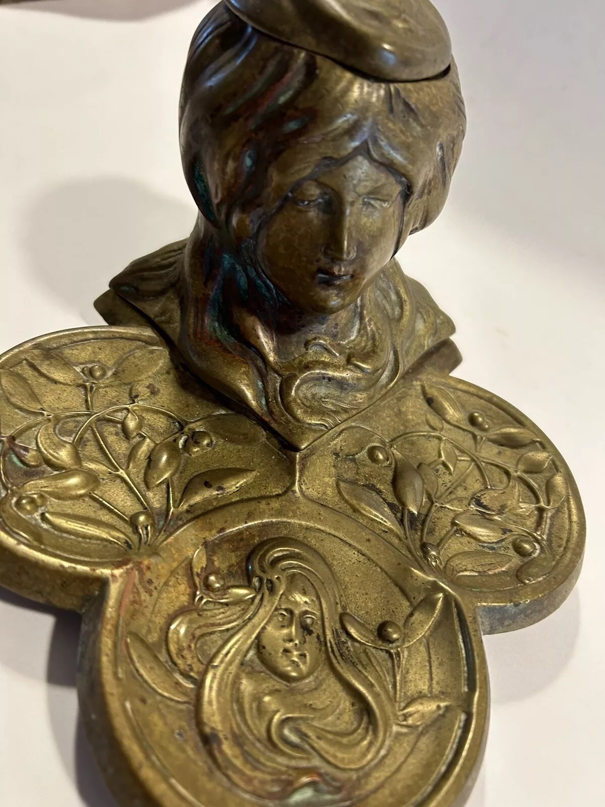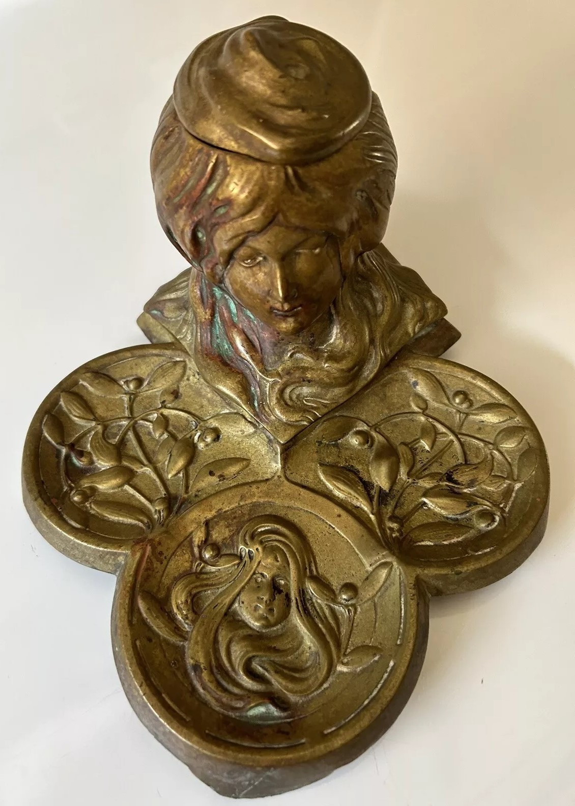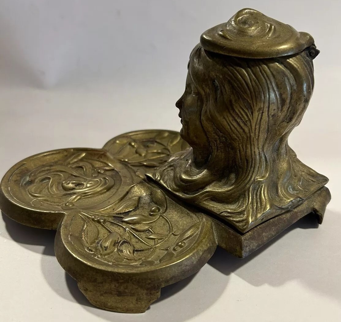 This brass inkstand features a tri-lobed base adorned with stylized floral patterns and the face of a woman. At the center, a woman’s bust emerges, her hair merging with the base design. The top of her hair is hinged and opens to access the inkwell (missing here).