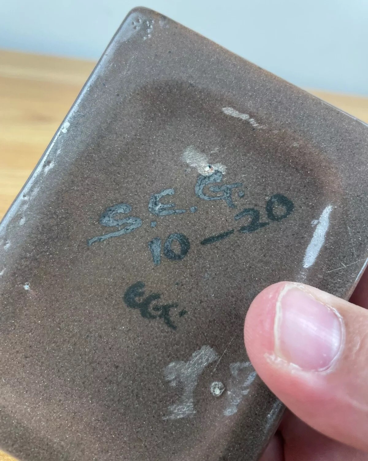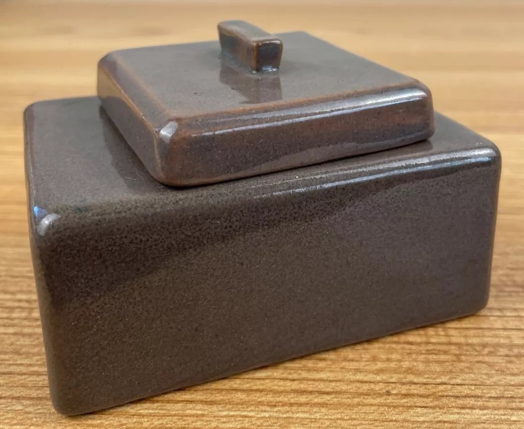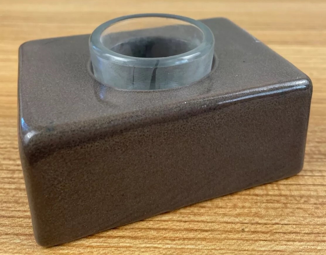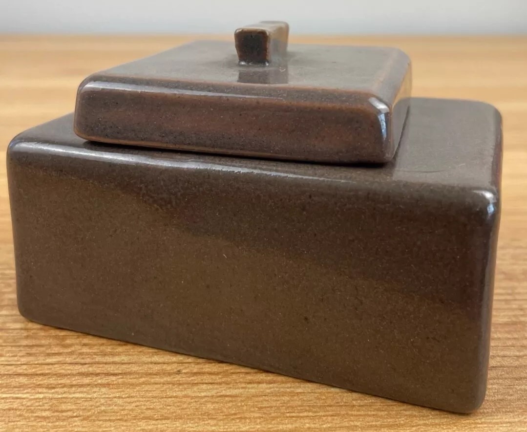 This inkwell is rectangular in shape with a flat lid and a small knob on top. It has a smooth, glossy finish with a gradient of brown tones, darker at the edges and lighter towards the center. The brand “SEG” and the year (1920) are marked on the underside.