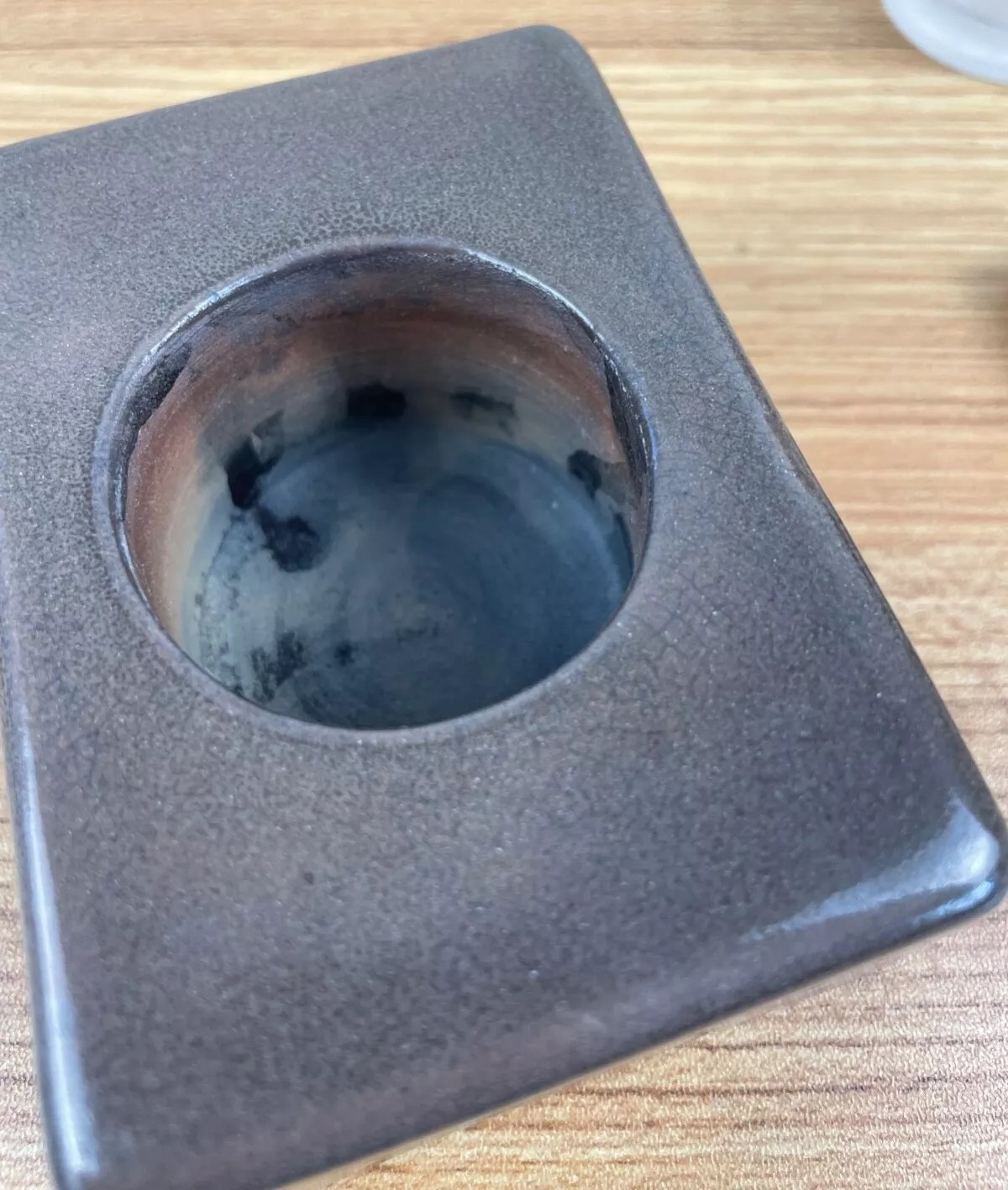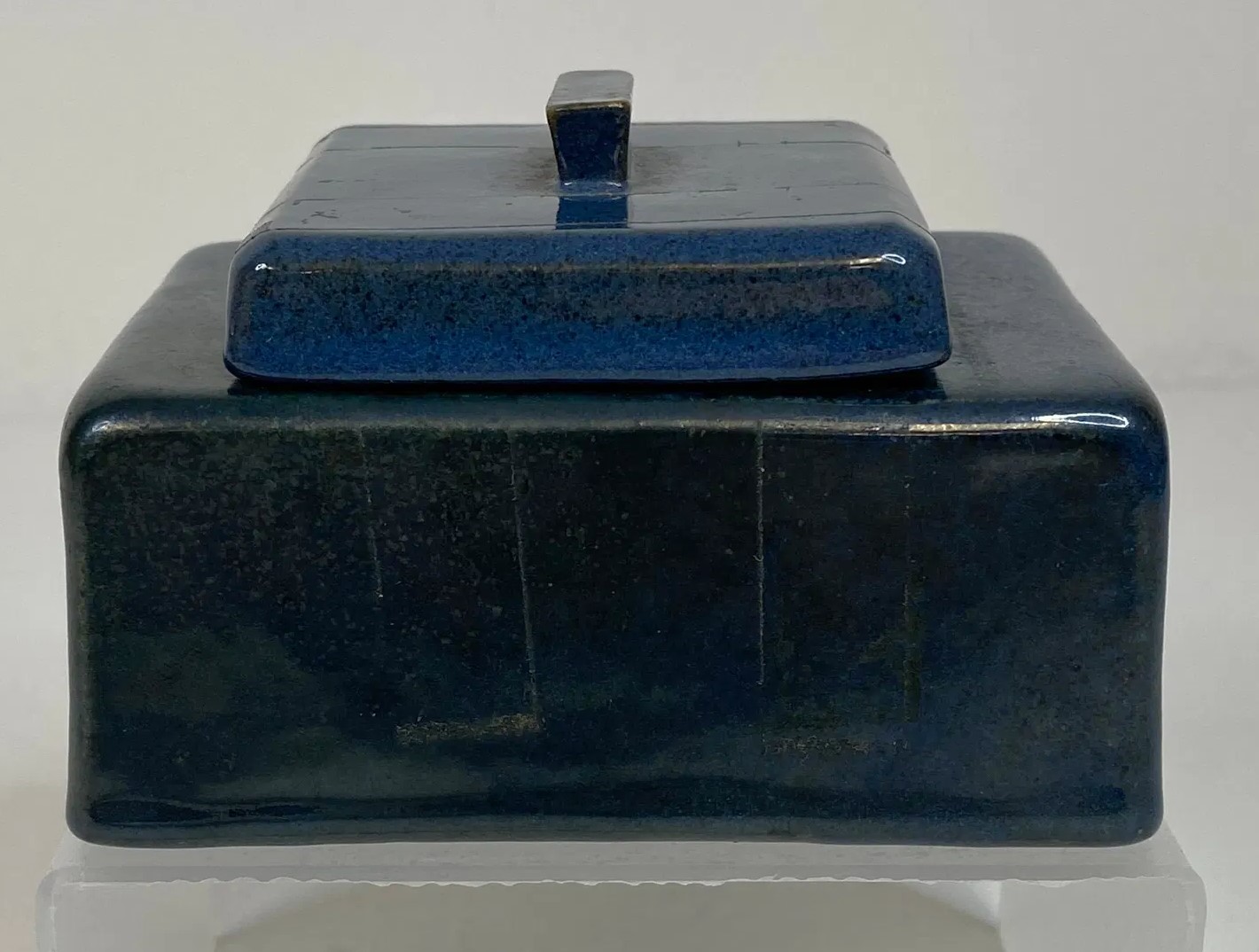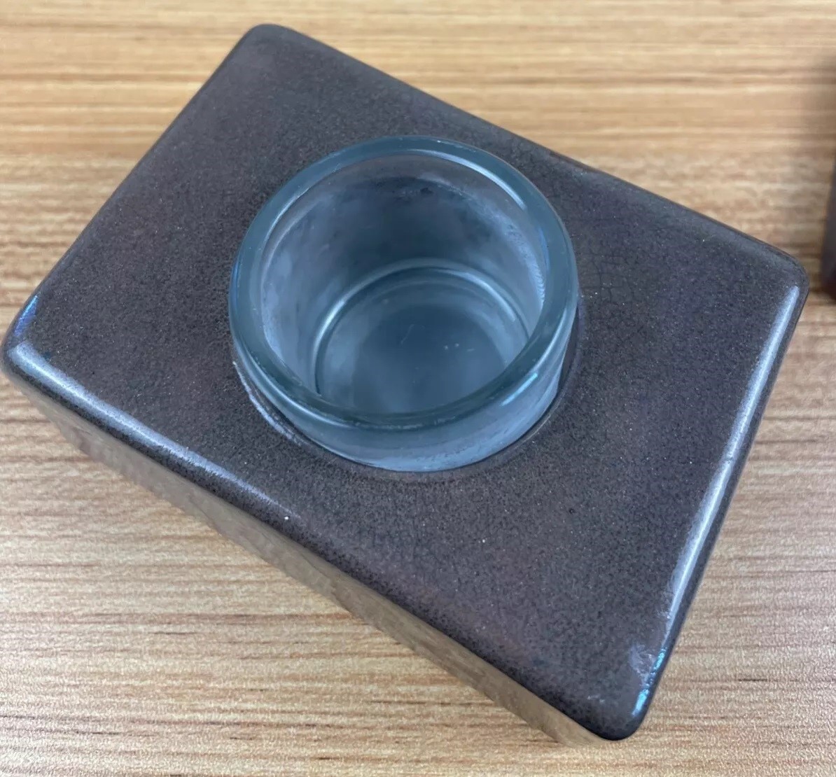 This inkwell is rectangular in shape with a flat lid and a small knob on top. It has a smooth, glossy finish with a gradient of brown tones, darker at the edges and lighter towards the center. The brand “SEG” and the year (1920) are marked on the underside.