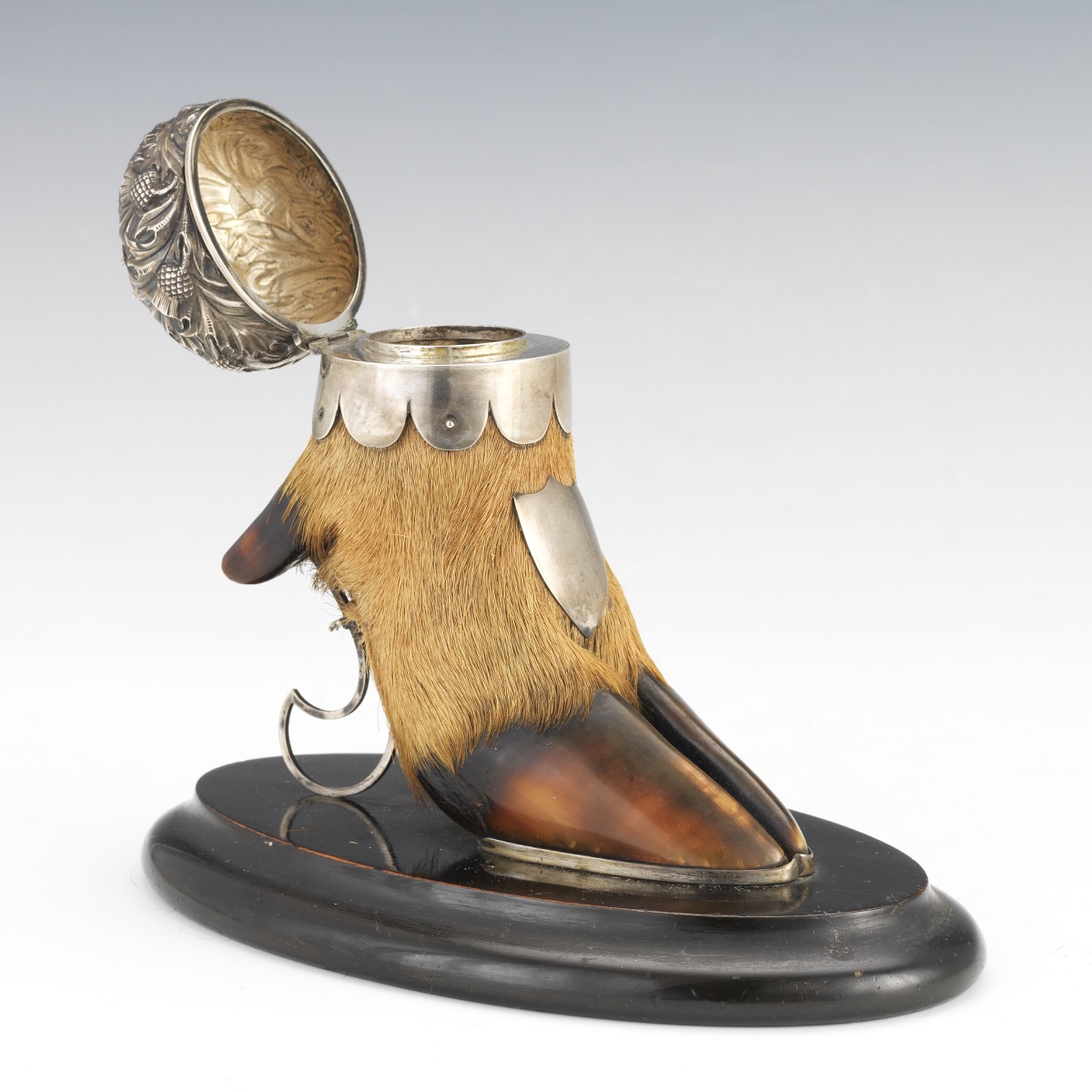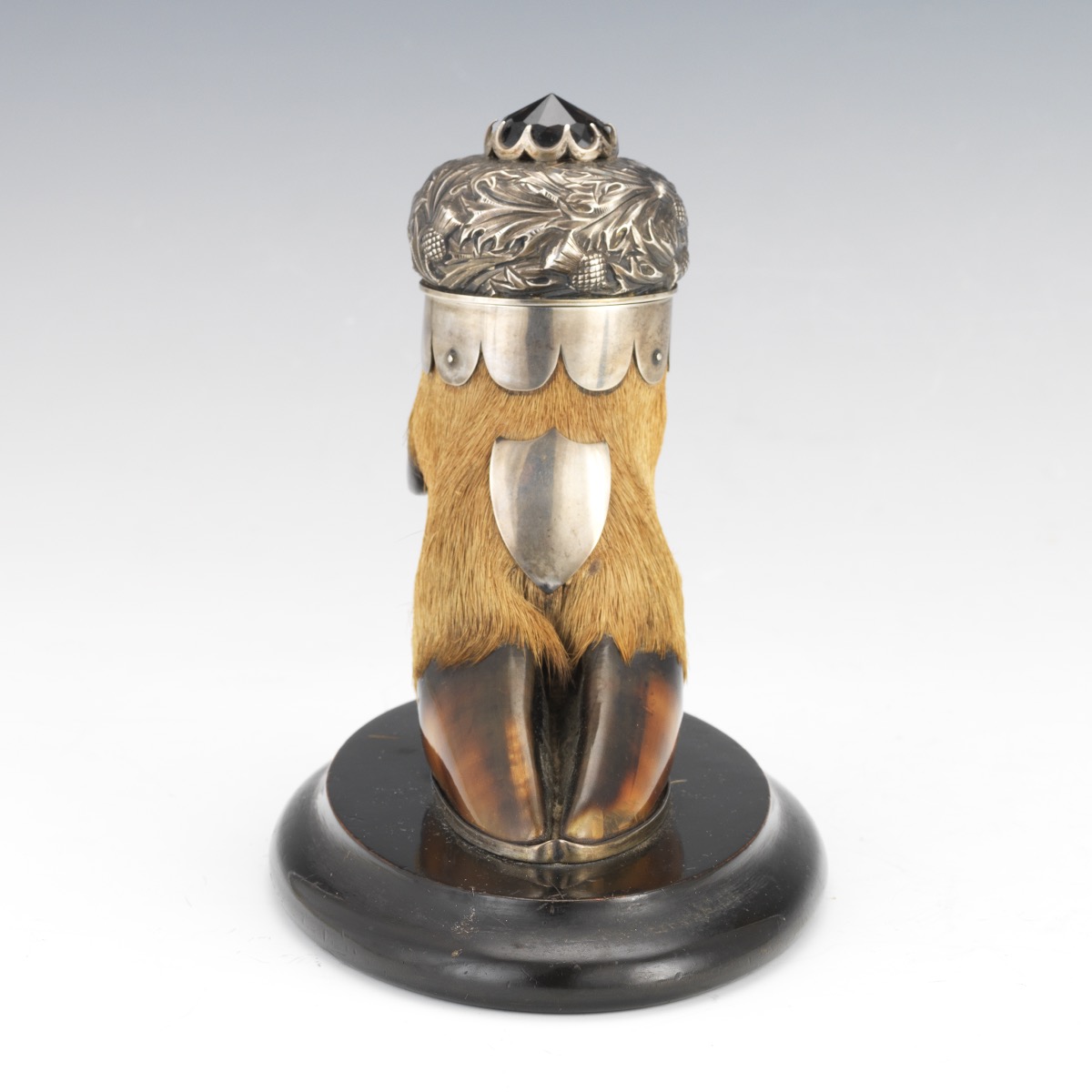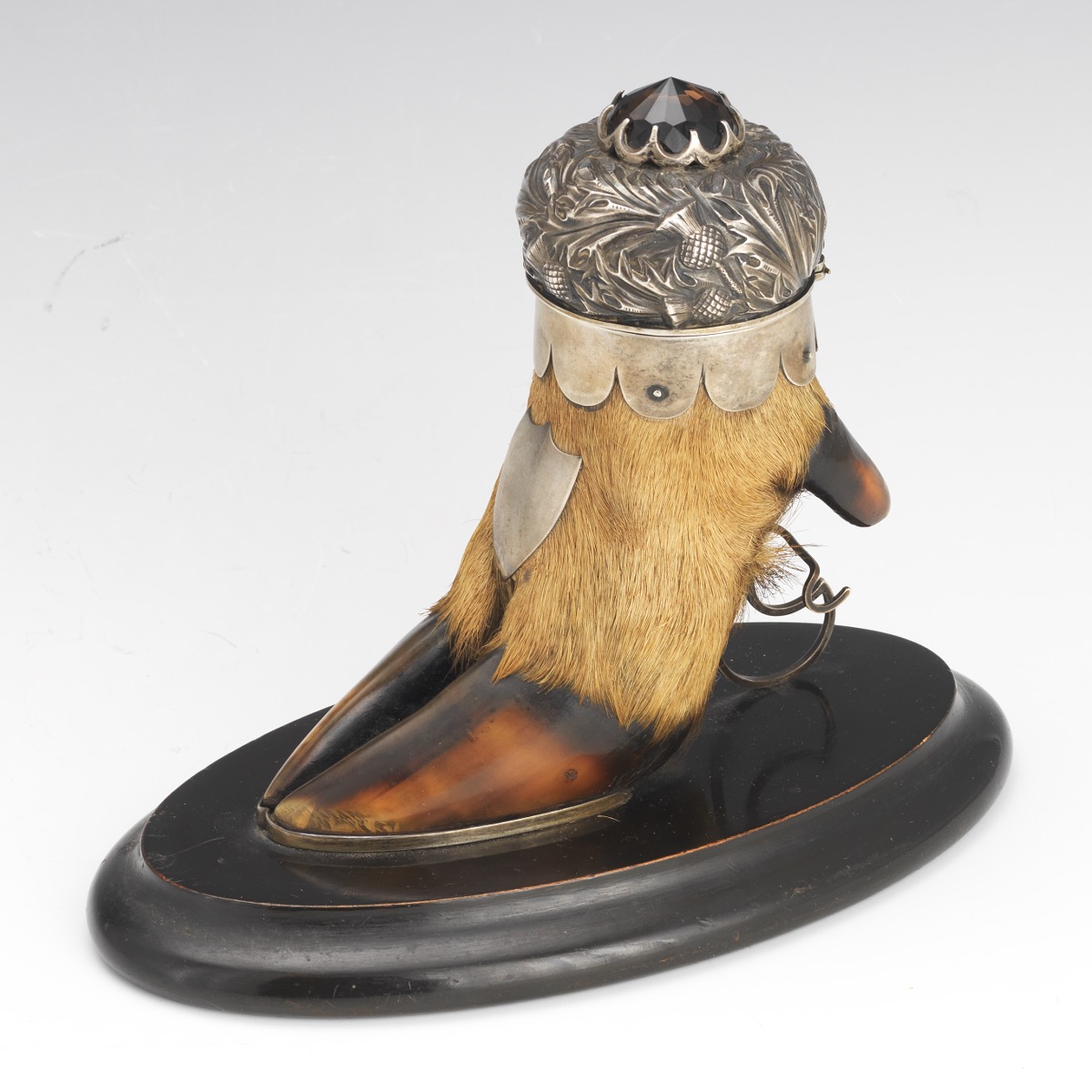 Silversmith Arthur Medlock of Inverness Scottish Highlands created this sterling silver mounted taxidermy hoof inkwell. The deer hoof inkwell, with an applied shield and marked Medlock, has a silver lid with a hammered thistle design and a jeweled finial. Mounted on an oval wood base, a pen rest supports the hoof from behind.