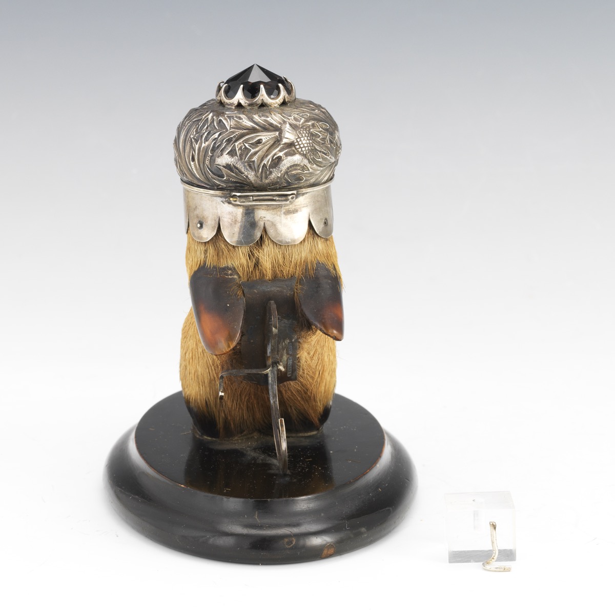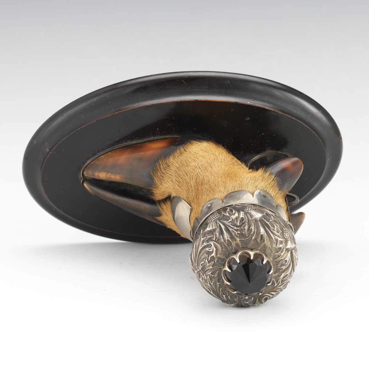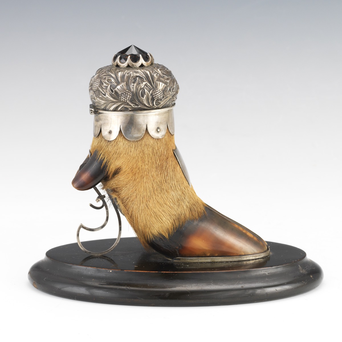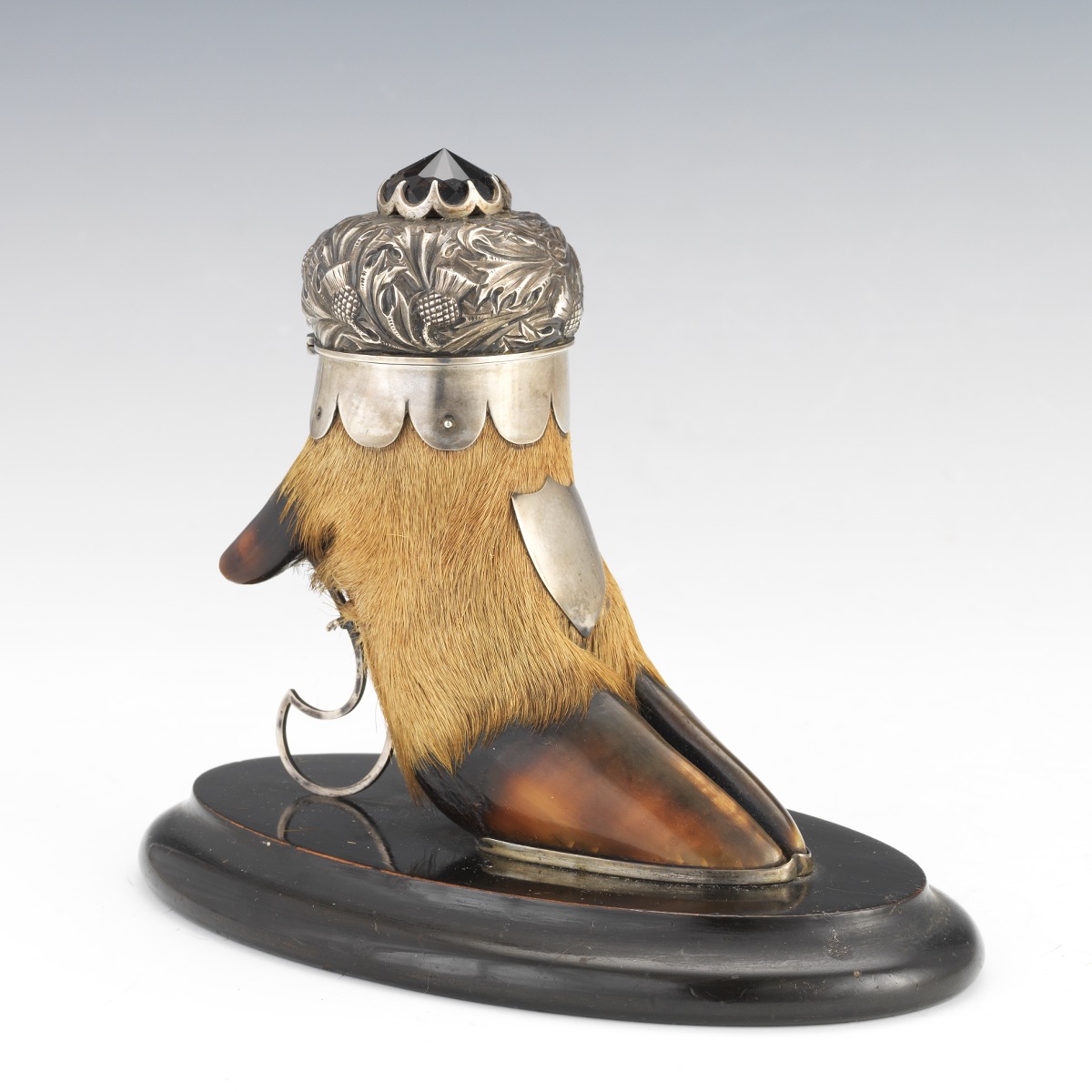 Silversmith Arthur Medlock of Inverness Scottish Highlands created this sterling silver mounted taxidermy hoof inkwell. The deer hoof inkwell, with an applied shield and marked Medlock, has a silver lid with a hammered thistle design and a jeweled finial. Mounted on an oval wood base, a pen rest supports the hoof from behind.