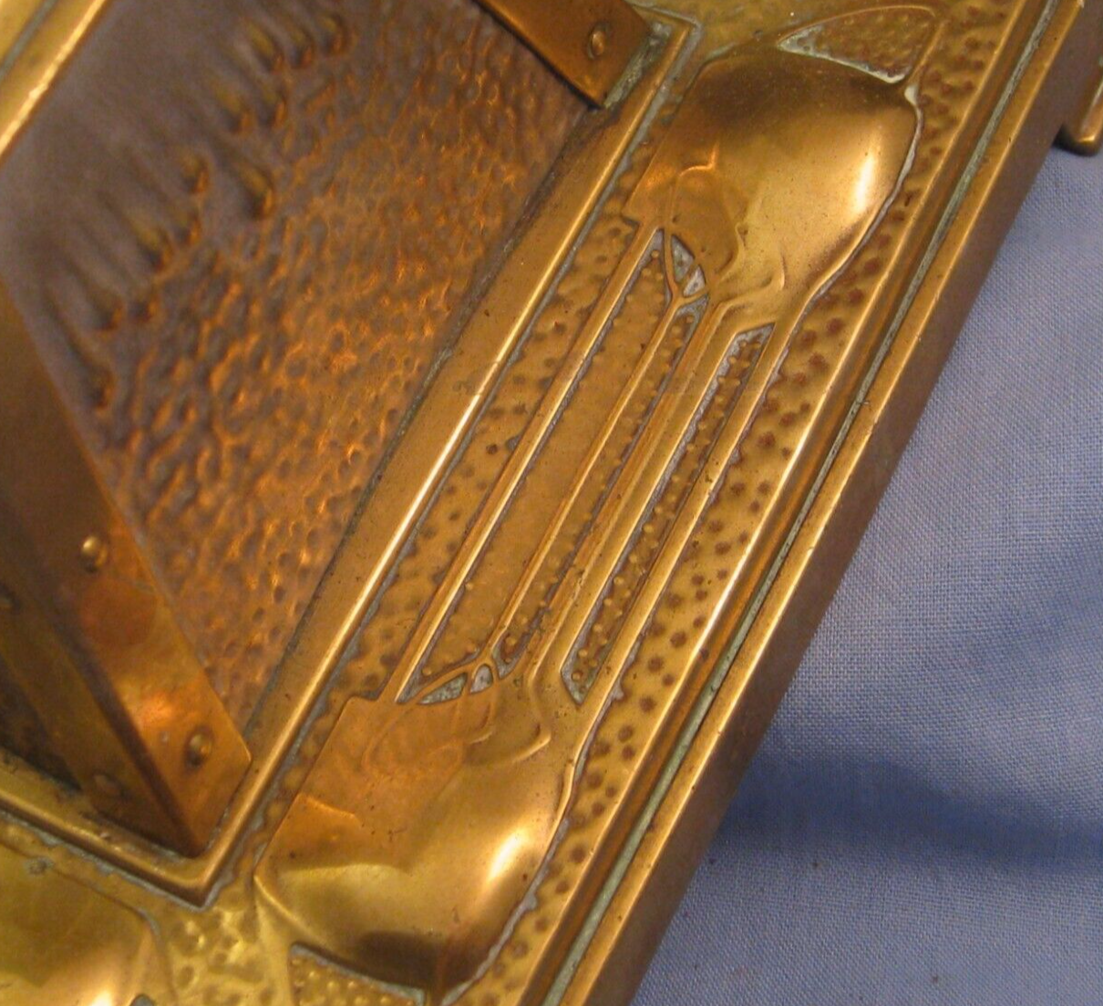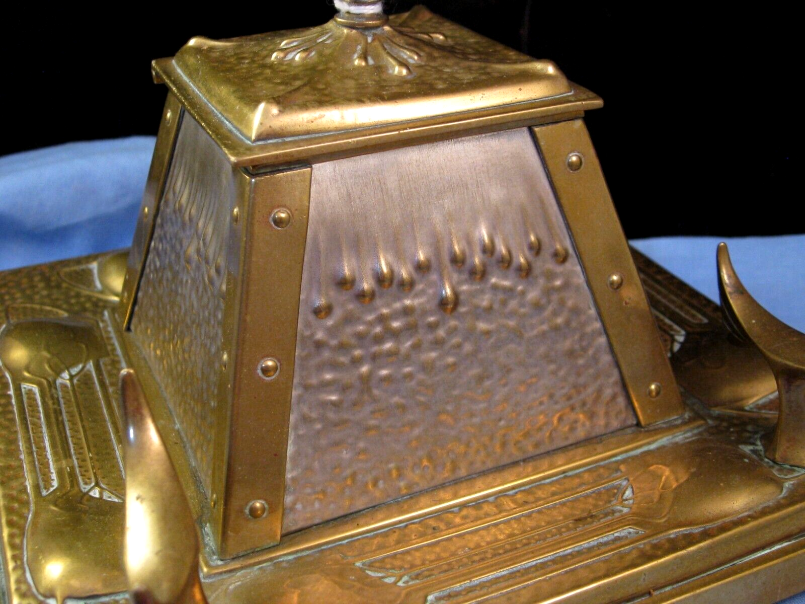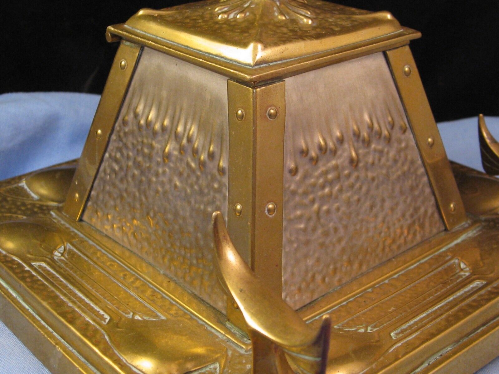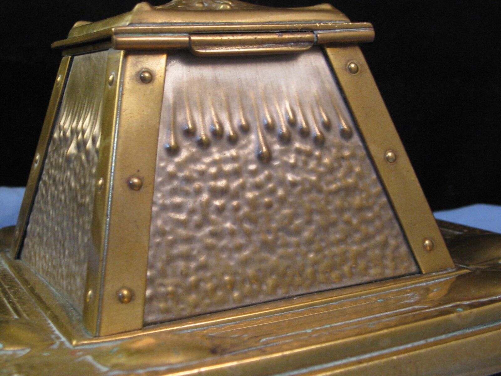 This brass inkstand has an organic, free-flowing design around the base with two stylized ends (fashioned as a whale’s tail) to hold a pen. The body of the inkwell consists of four copper panels with a hammered finish resembling raindrops falling on gravel. The copper panels are held by four corner straps with rivet details. The hinged lid continues the raindrop pattern.