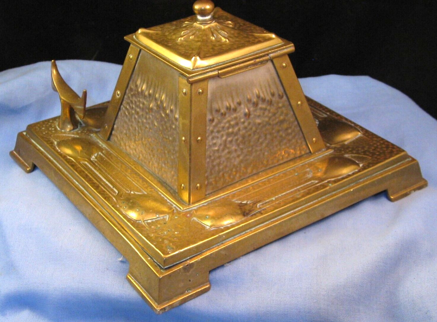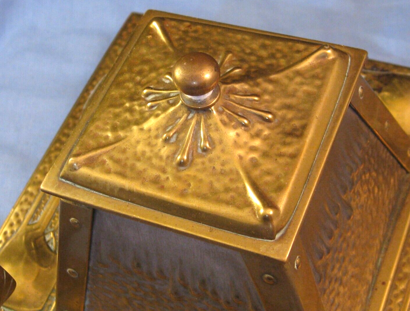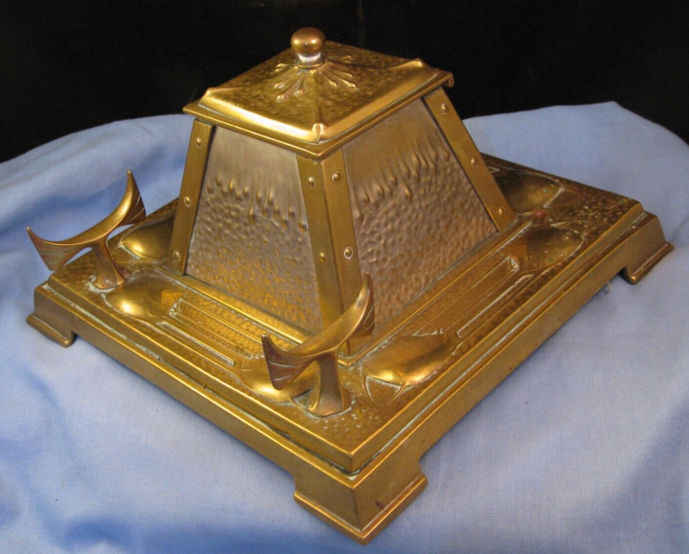This brass inkstand has an organic, free-flowing design around the base with two stylized ends (fashioned as a whale’s tail) to hold a pen. The body of the inkwell consists of four copper panels with a hammered finish resembling raindrops falling on gravel. The copper panels are held by four corner straps with rivet details. The hinged lid continues the raindrop pattern.