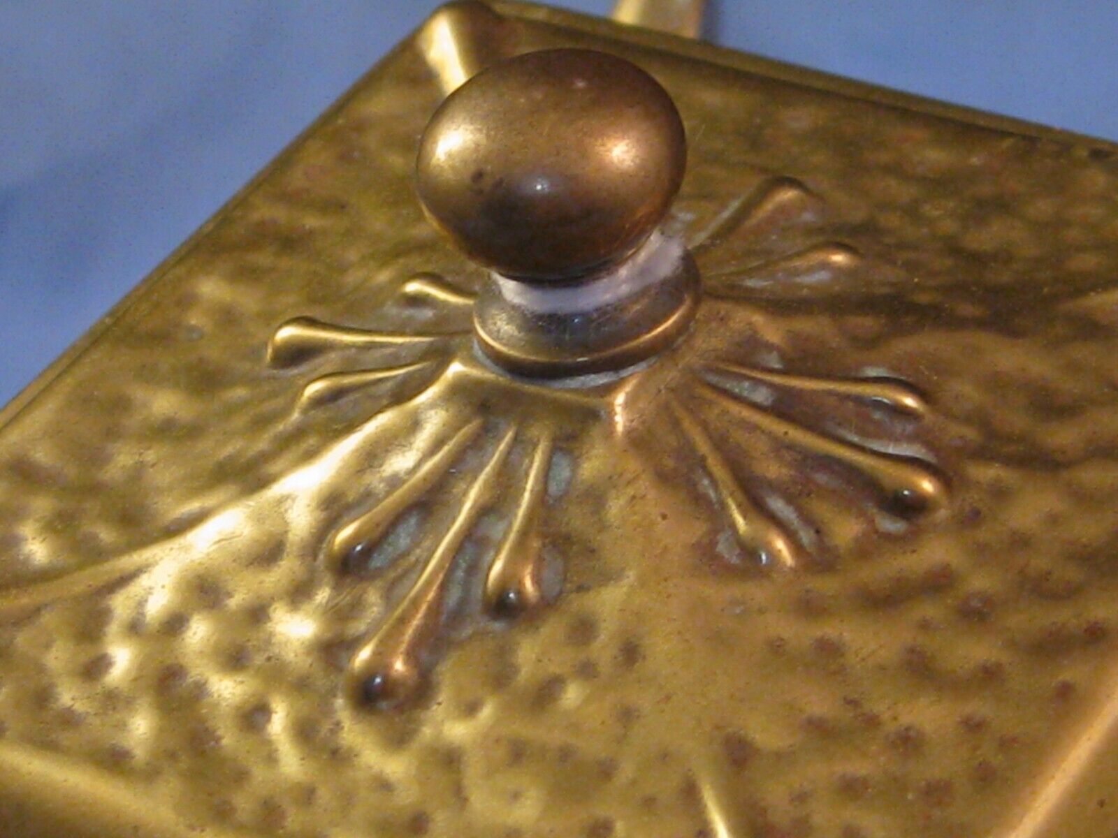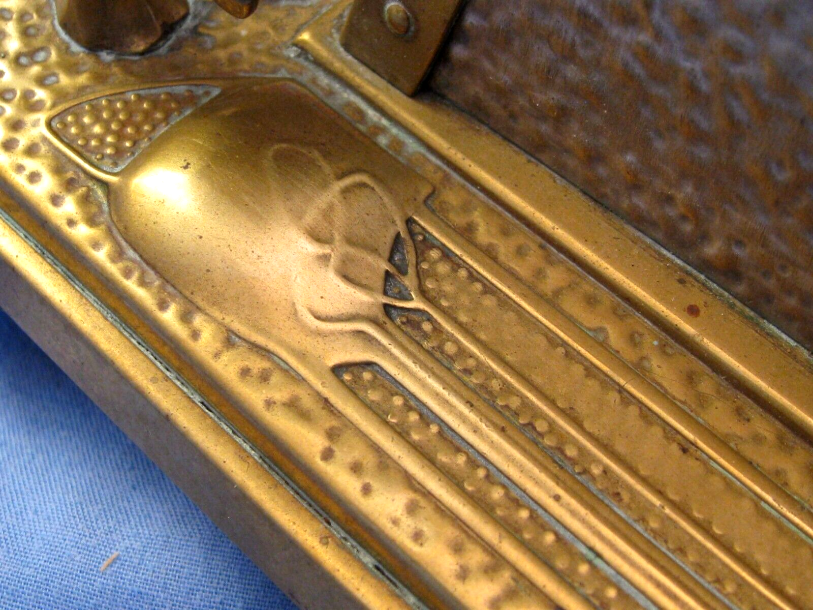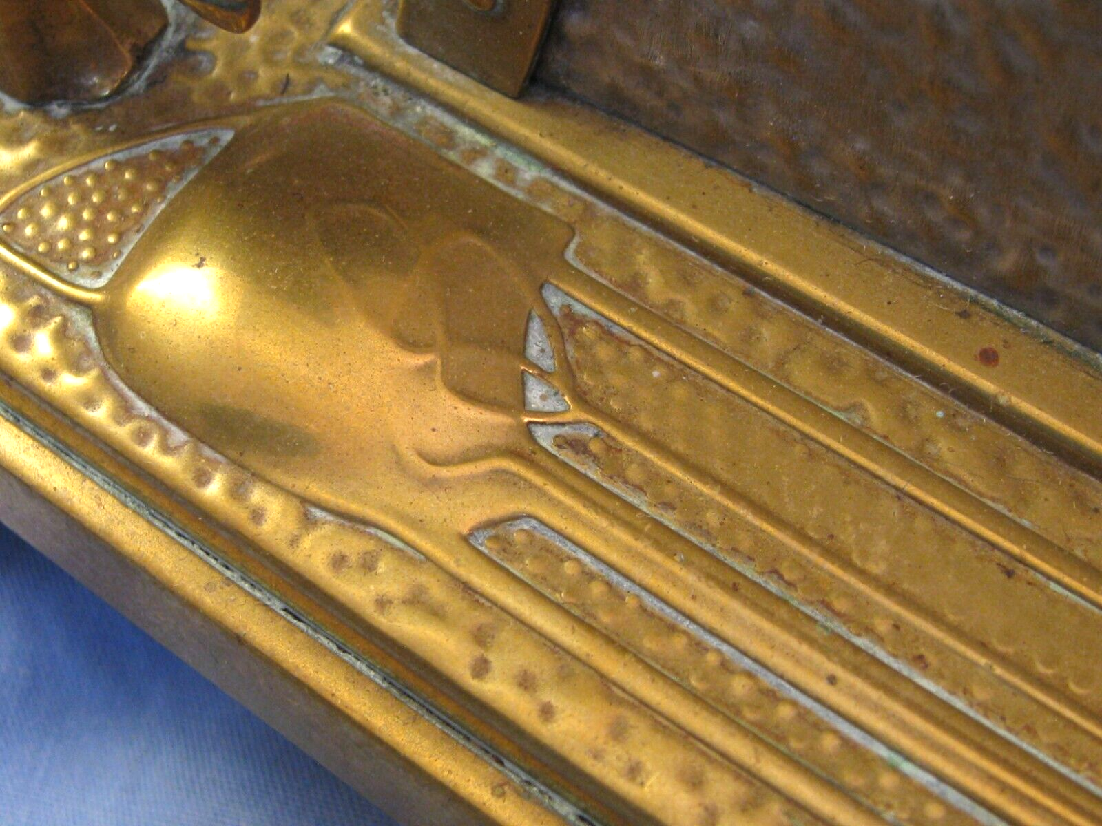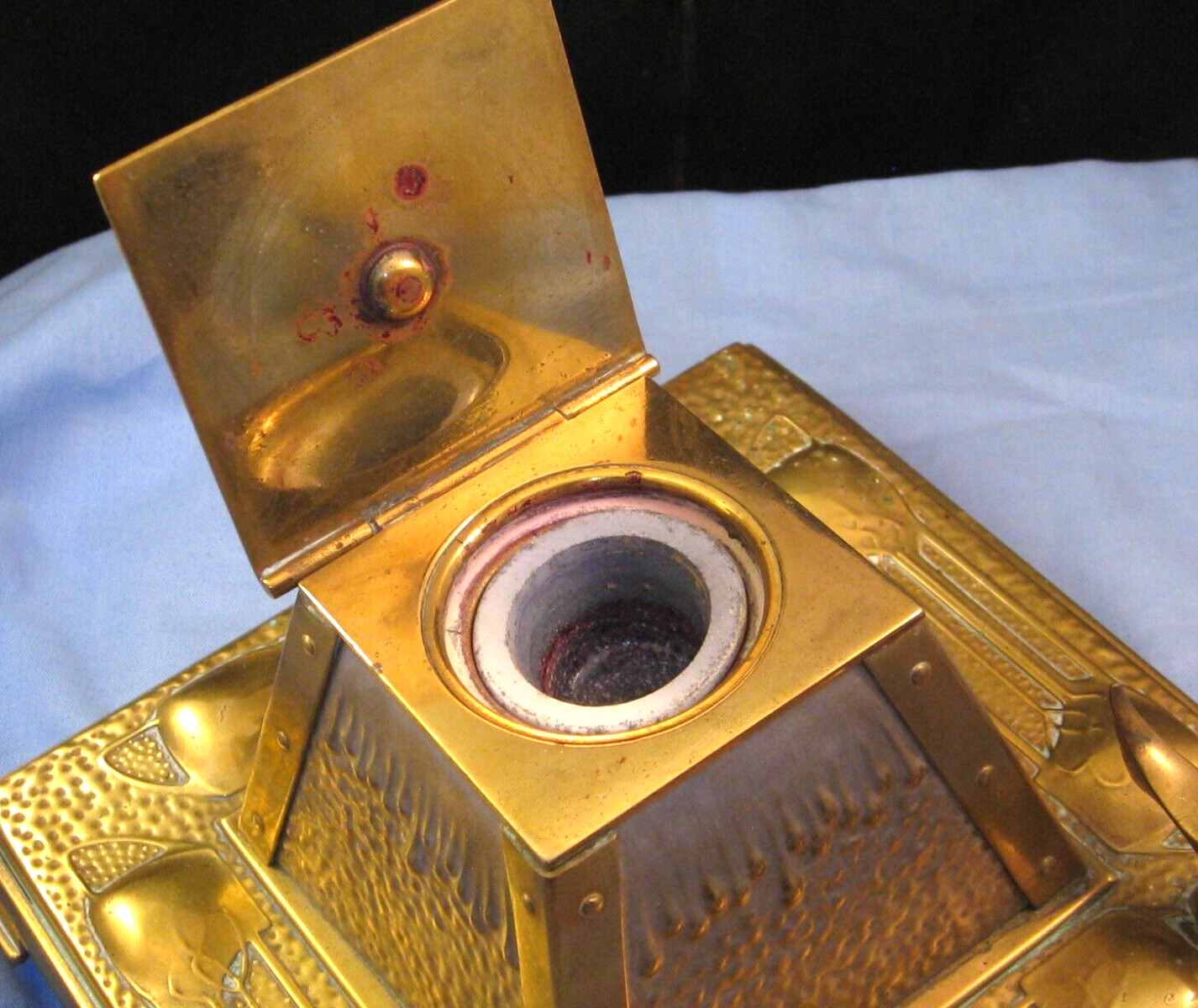This brass inkstand has an organic, free-flowing design around the base with two stylized ends (fashioned as a whale’s tail) to hold a pen. The body of the inkwell consists of four copper panels with a hammered finish resembling raindrops falling on gravel. The copper panels are held by four corner straps with rivet details. The hinged lid continues the raindrop pattern.