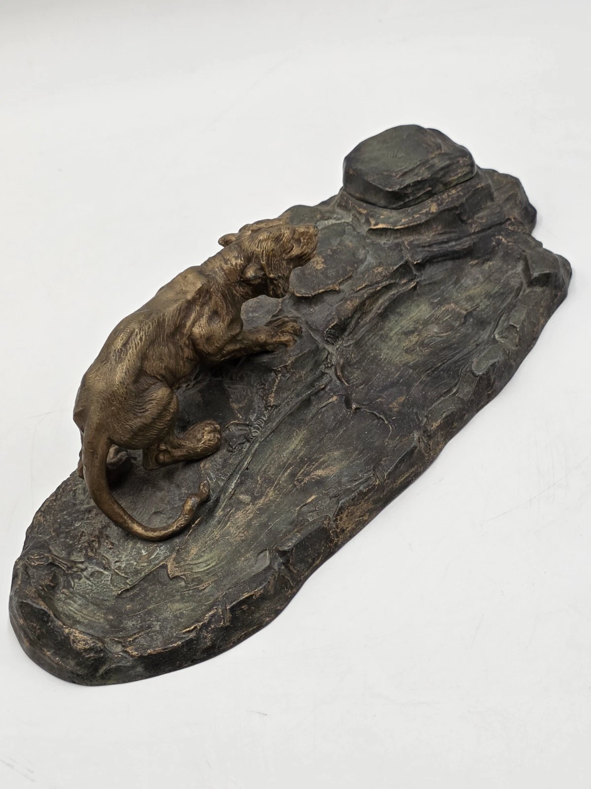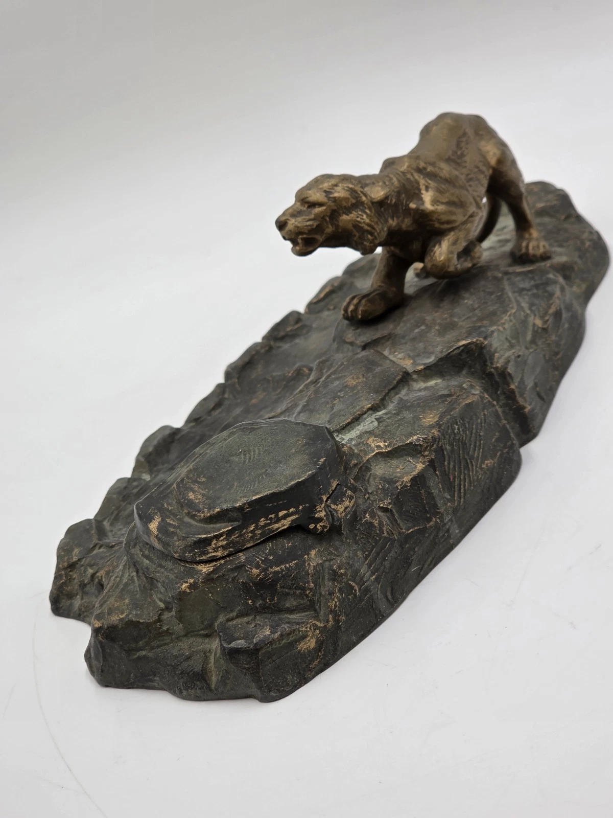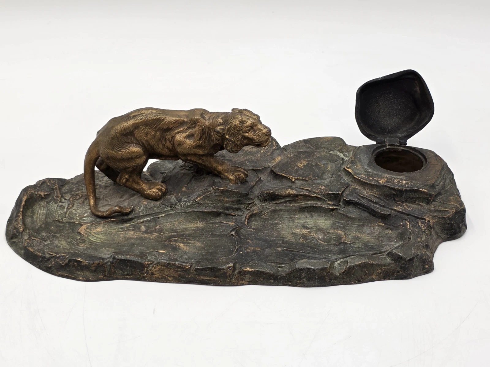 • The Figure: The centerpiece is a powerful, muscular lioness caught in a stalking or crouching pose. The sculptor has paid close attention to anatomy, detailing the ribs, shoulder muscles, and the intensity of the animal’s gaze as it looks toward the inkwell.