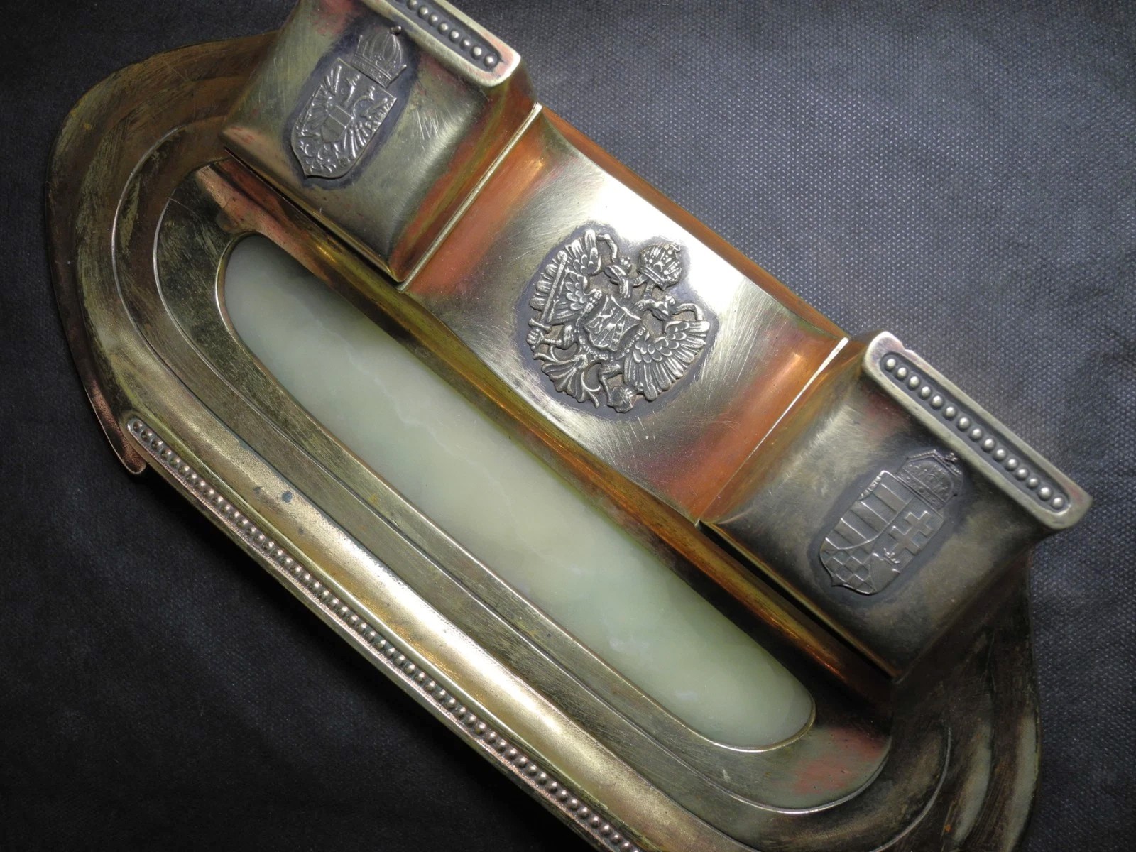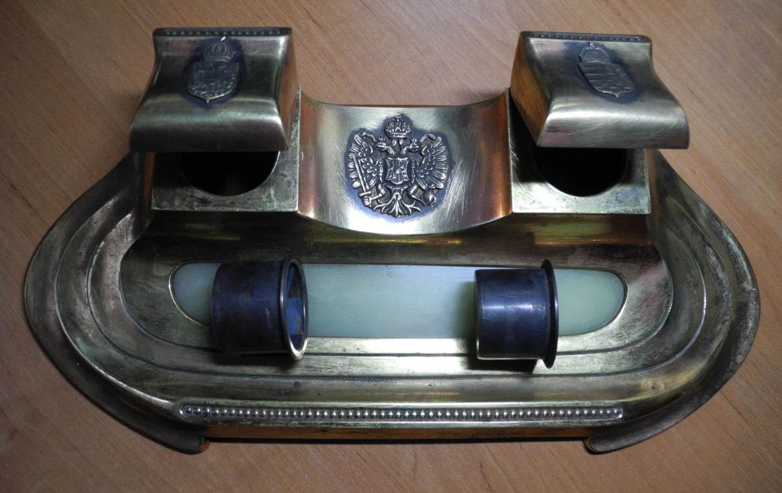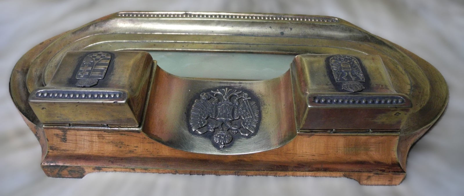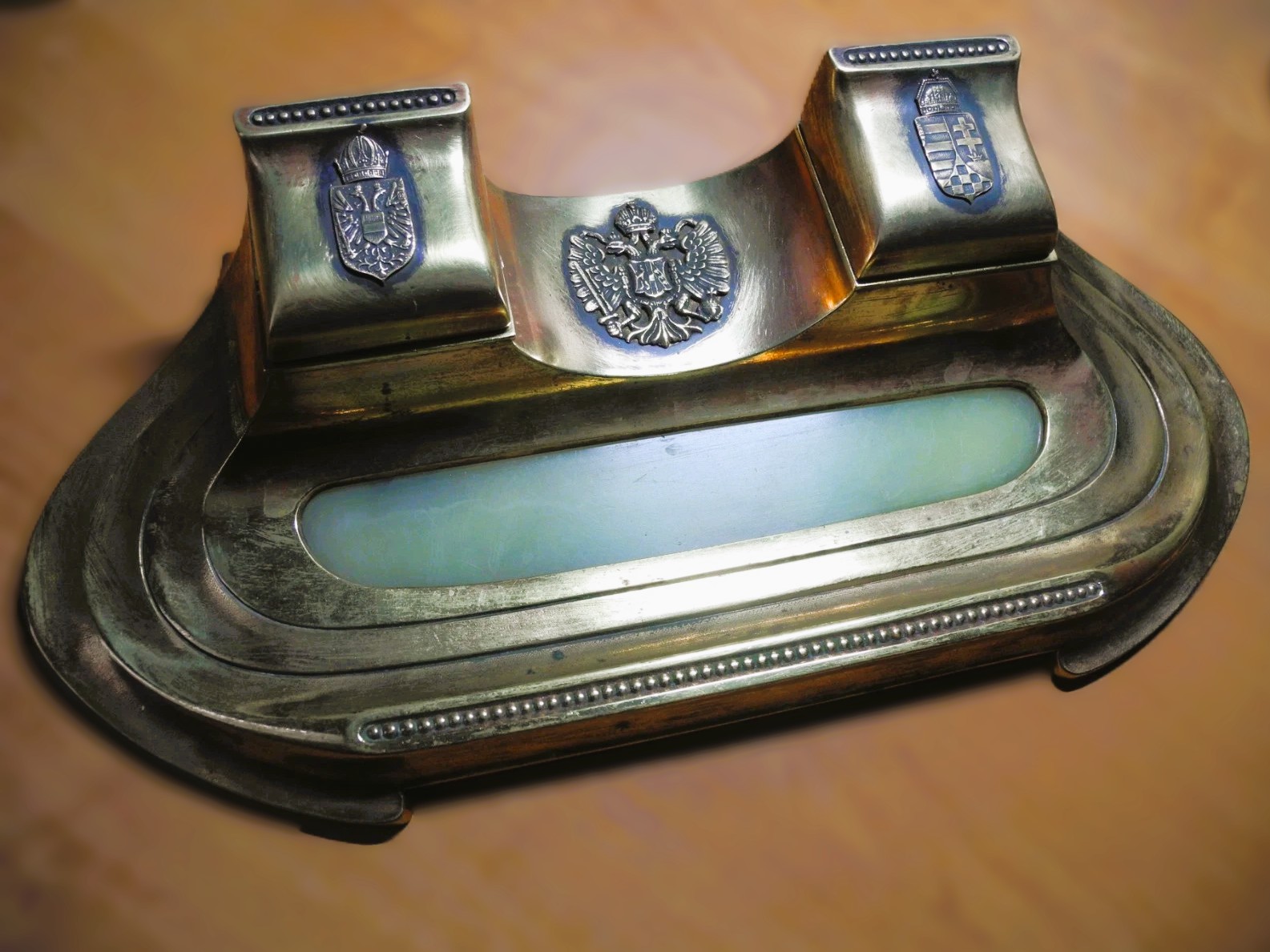 This is an example of an official or military-themed desk set from the Austro-Hungarian Empire. The inkstand is made of brass and has two inkwells covered with hinged lids.