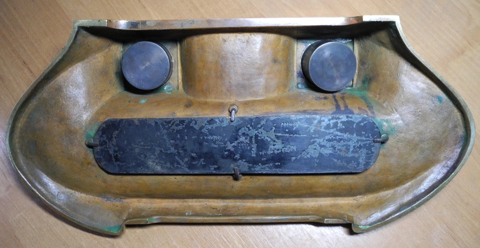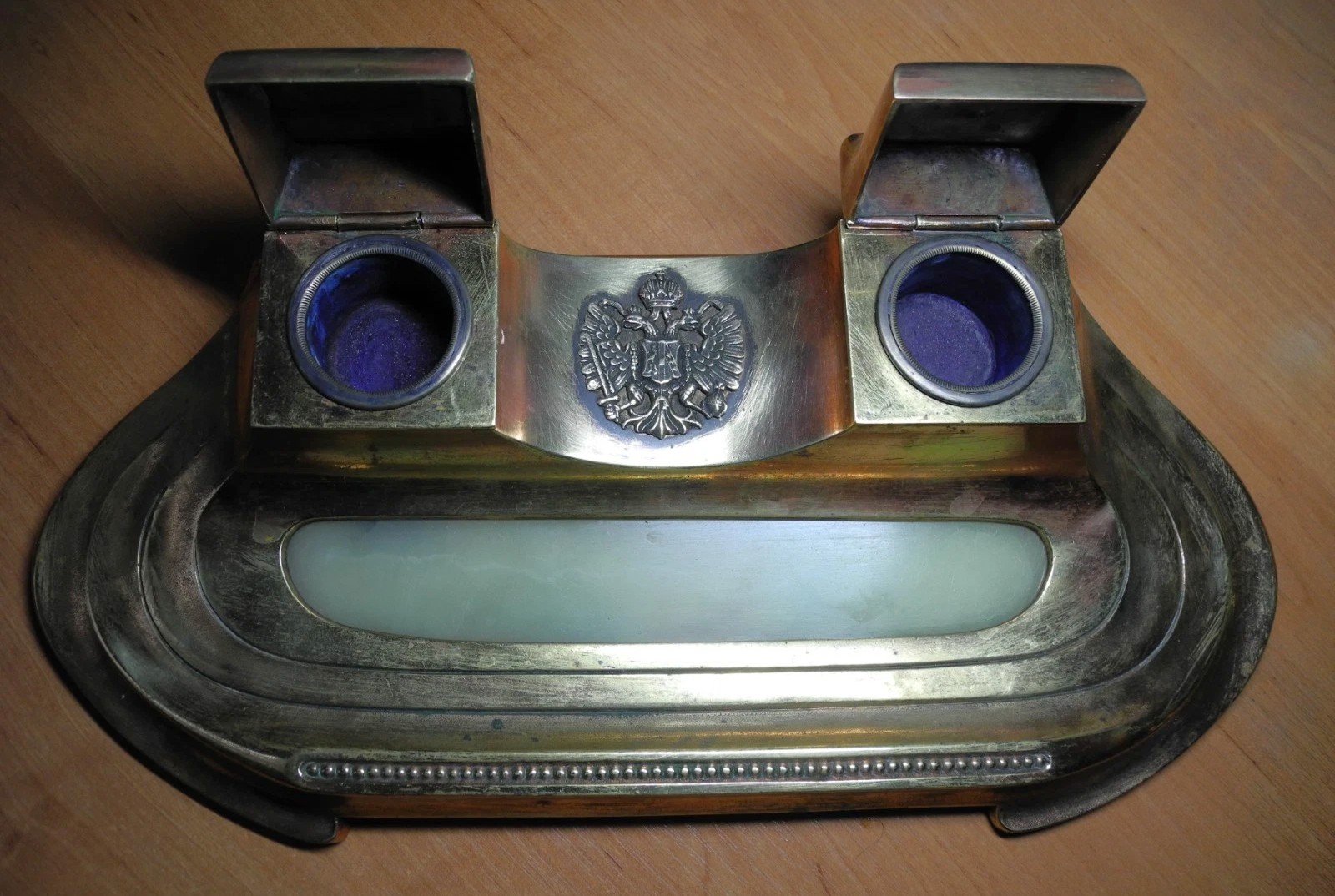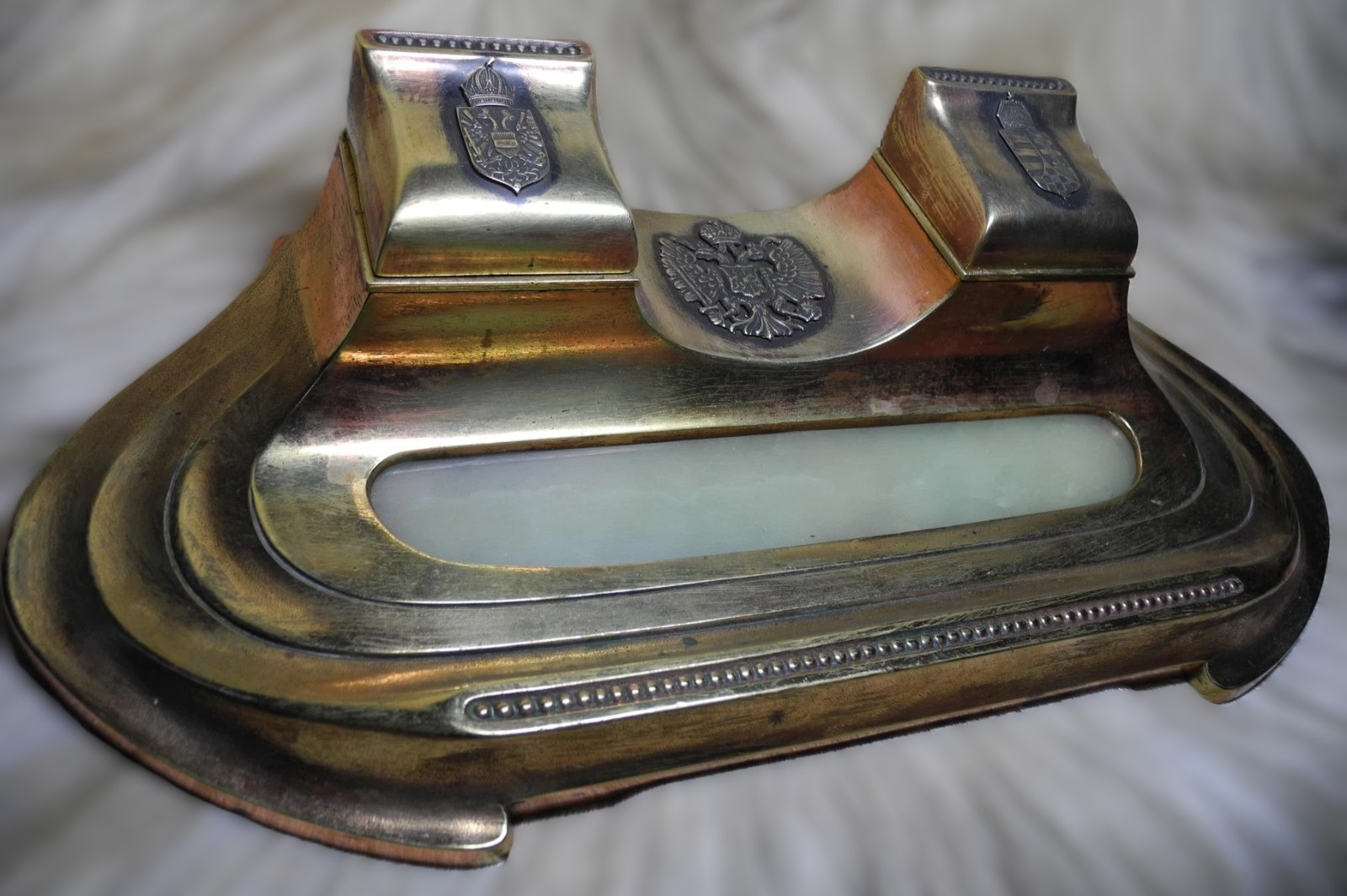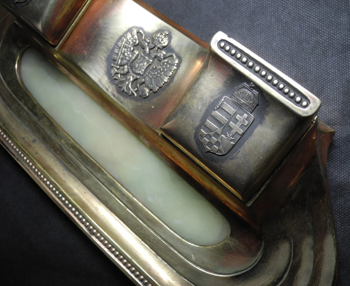 This is an example of an official or military-themed desk set from the Austro-Hungarian Empire. The inkstand is made of brass and has two inkwells covered with hinged lids.