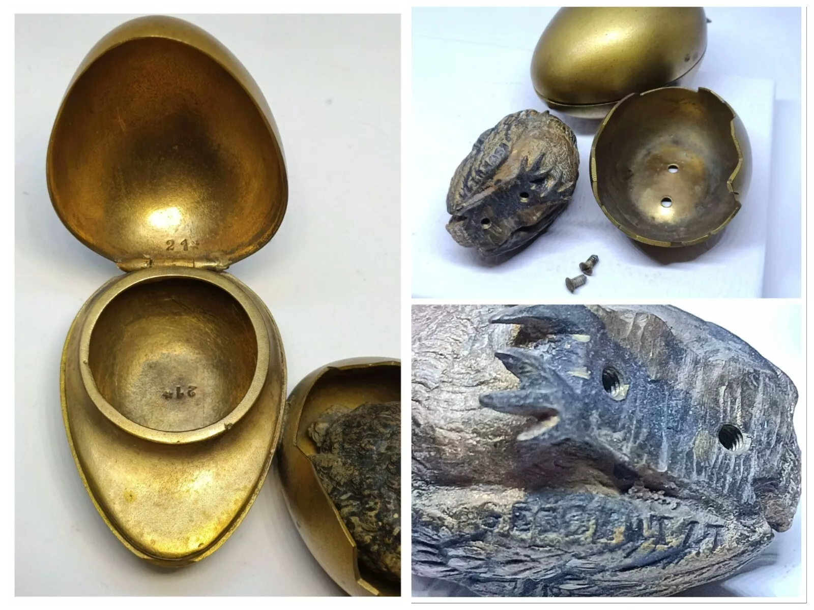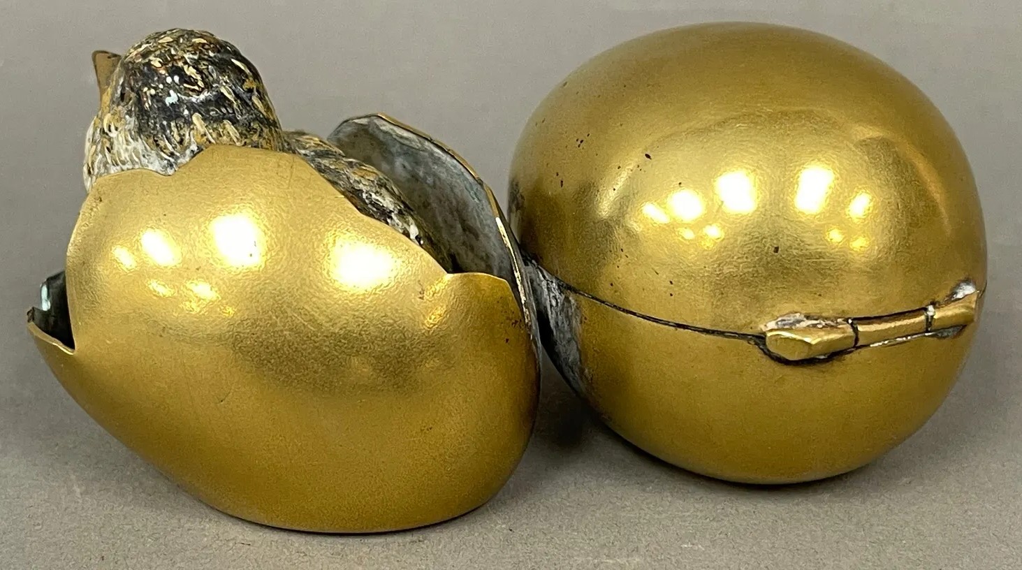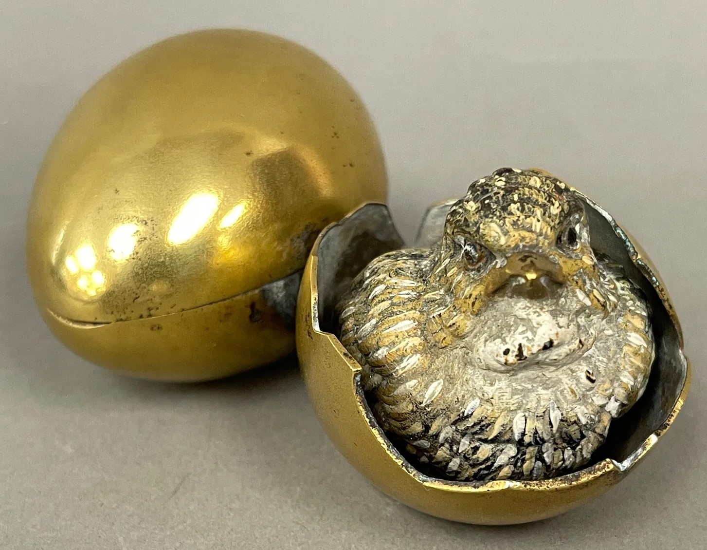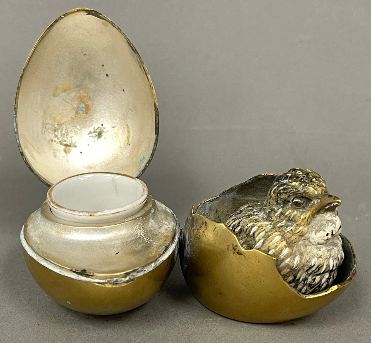 The inkwell is housed within a golden (brass) egg on the left side of the image. This egg is hinged and can be opened to reveal the inkwell inside. To the right, there is a baby bird chick emerging from a cracked egg. This chick is a cold painted Austrian bronze. The underside of the bird is marked “Geschutzt”.