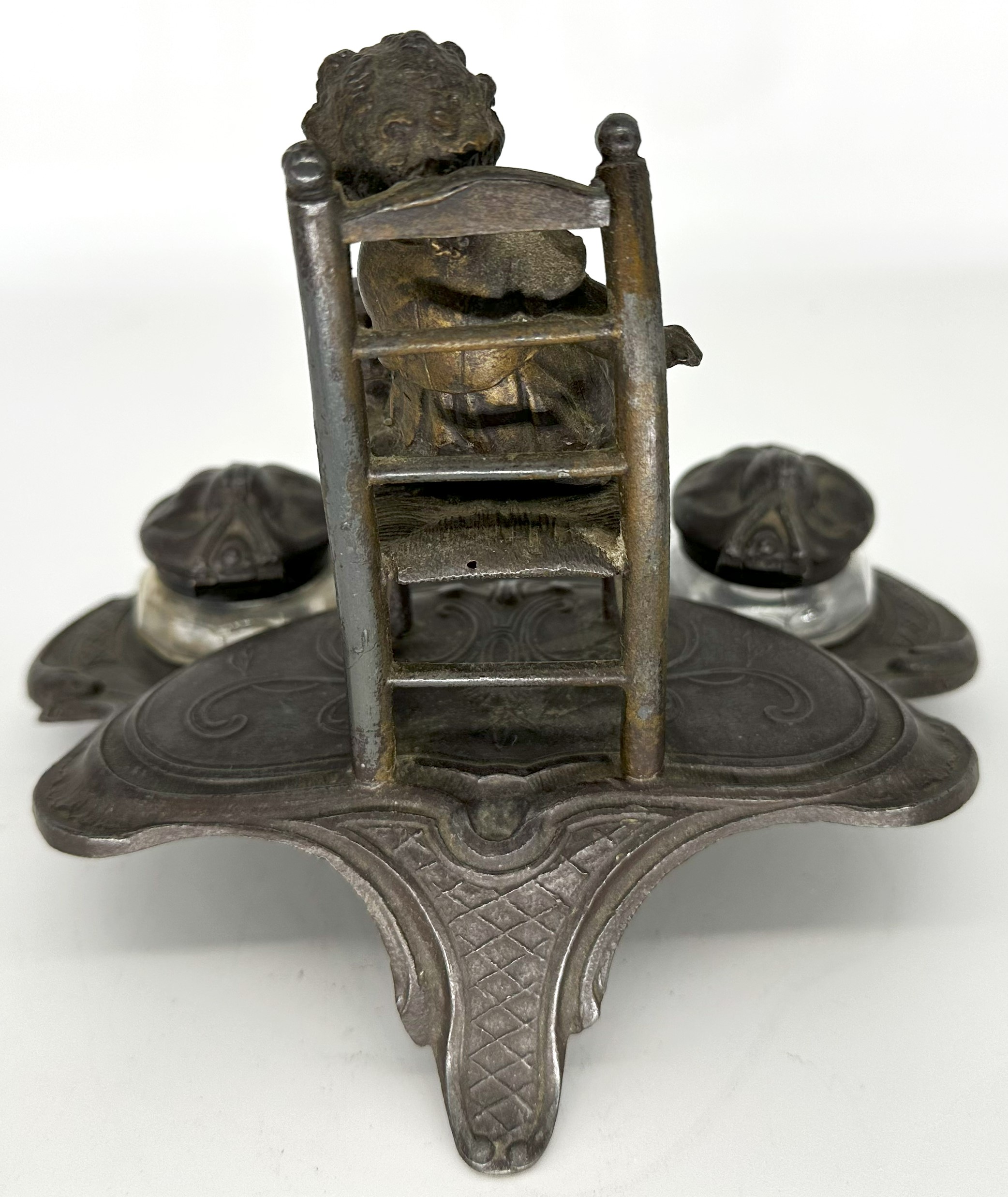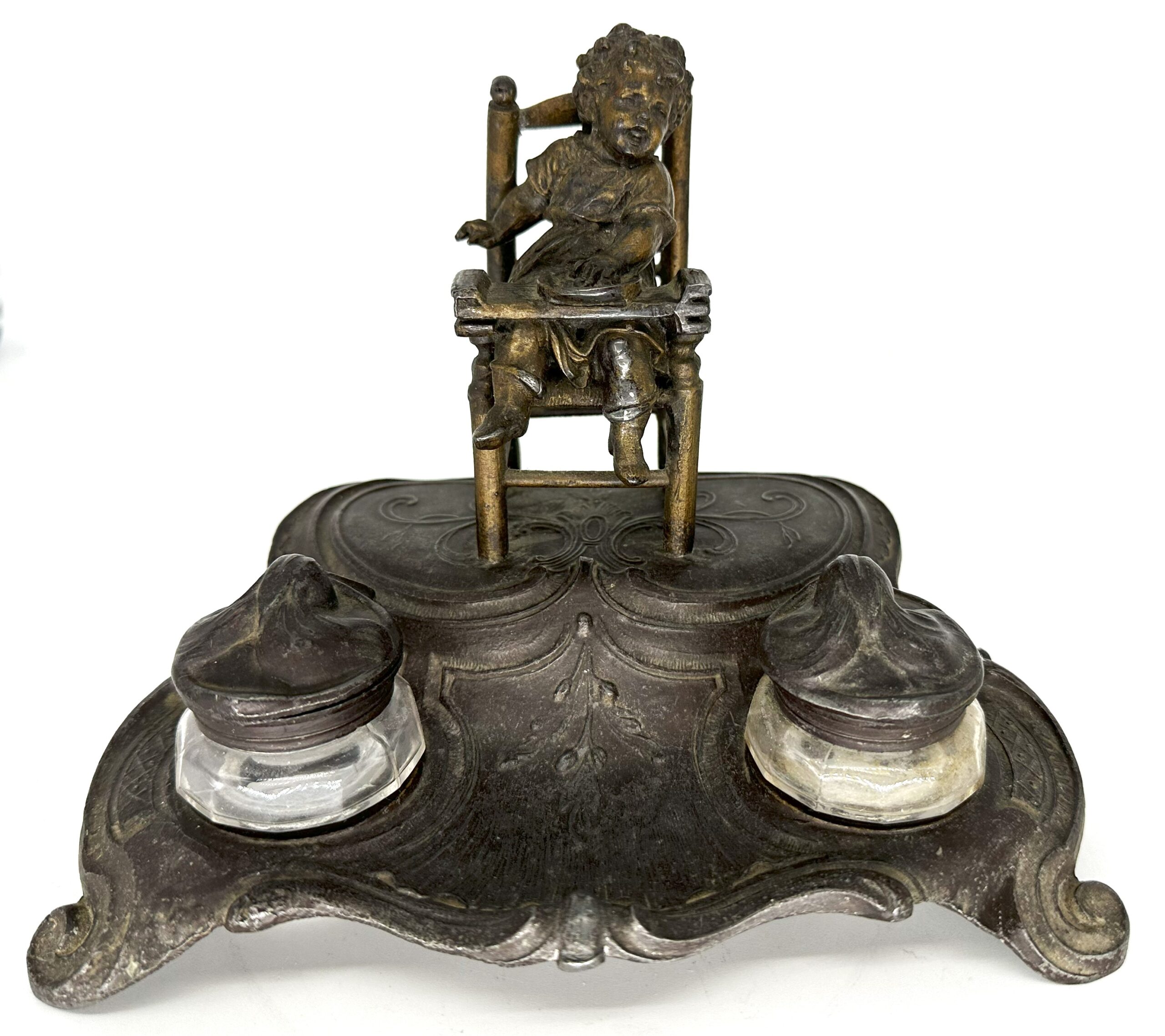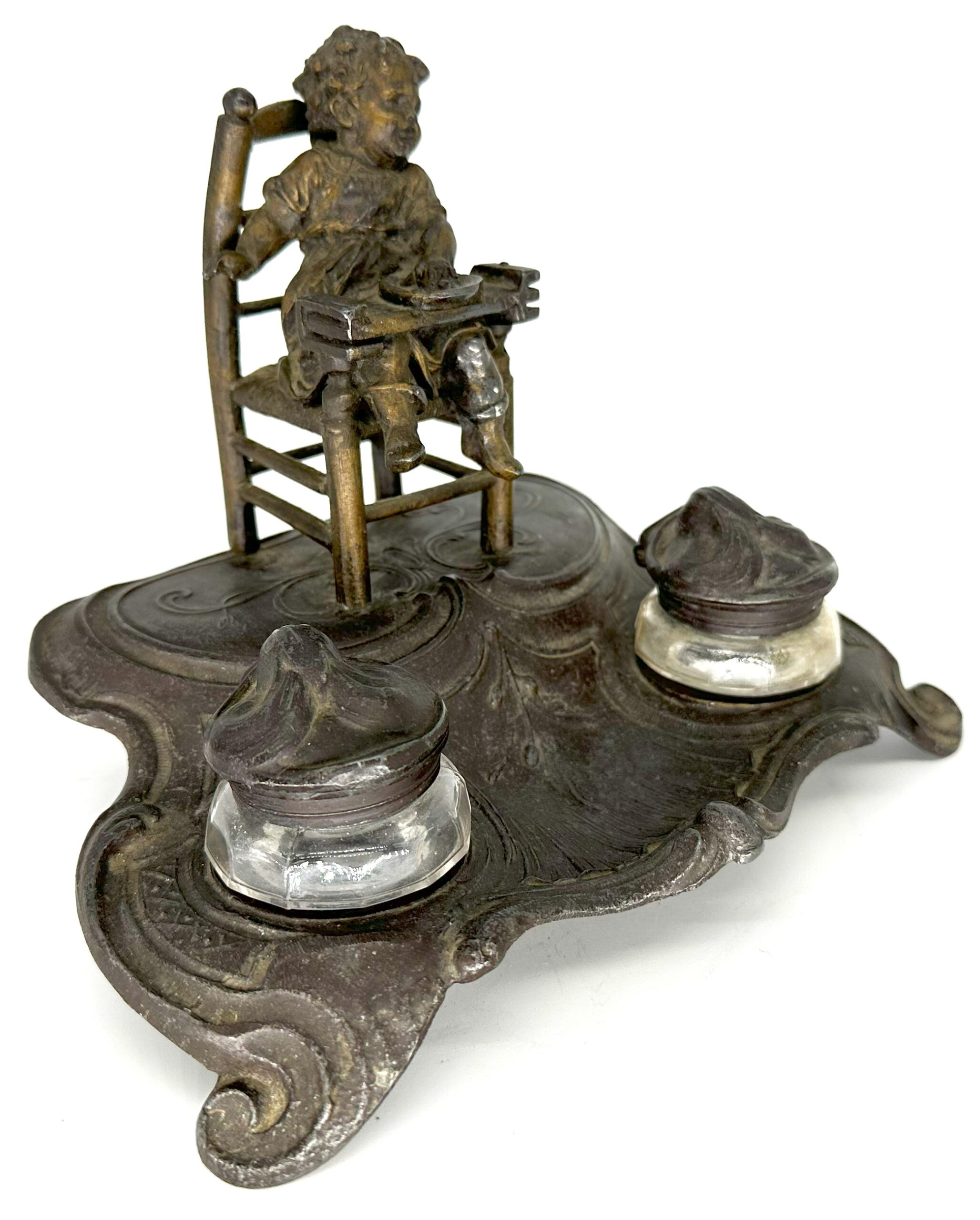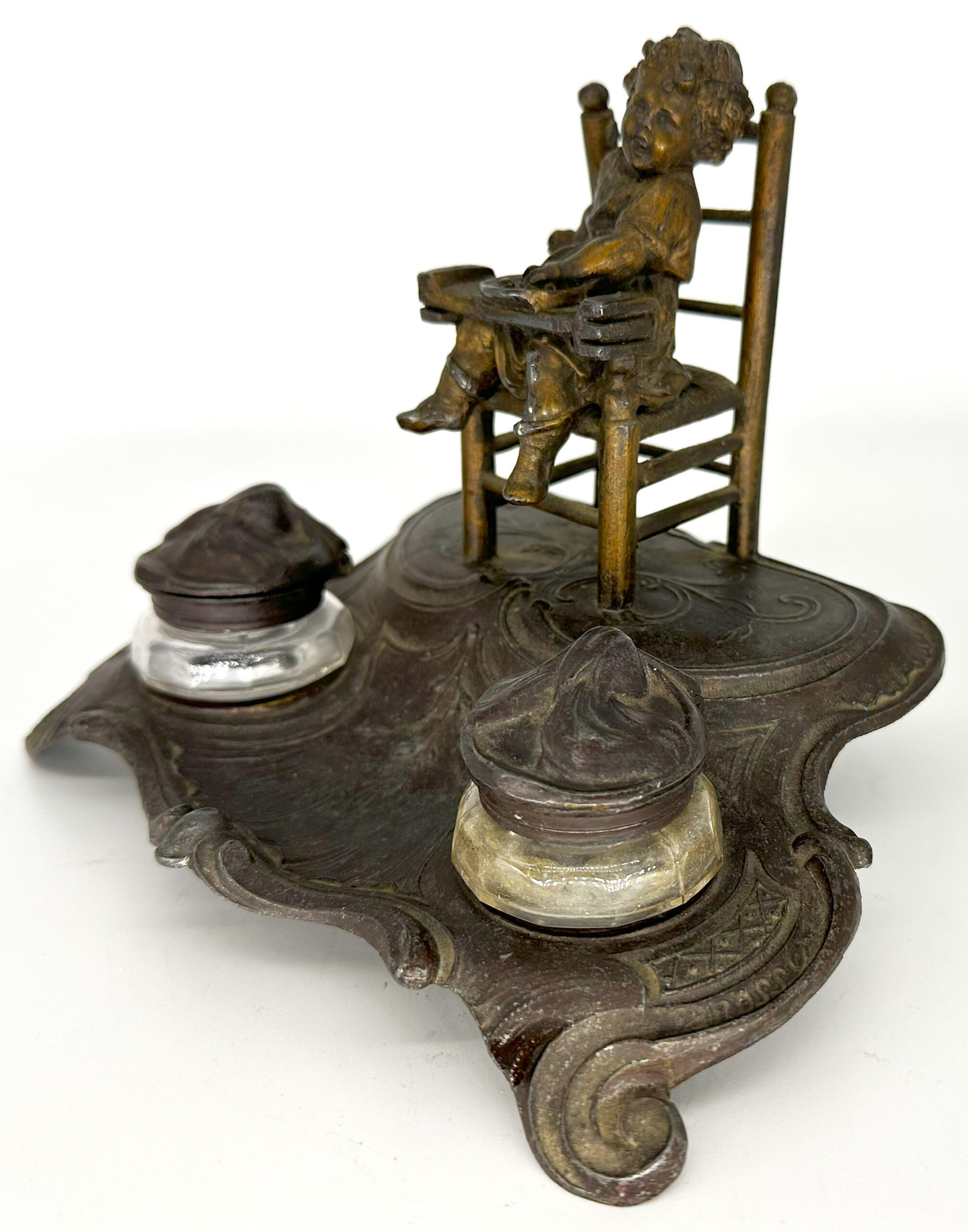 French spelter bronze inkstand showing a little girl sitting in a highchair unhappily picking at her food. The piece is signed “A Bossu” and dates to the 1900’s Art Nouveau period. The inkstand is complete with two stemmed-glass inkwells with hinged lids.