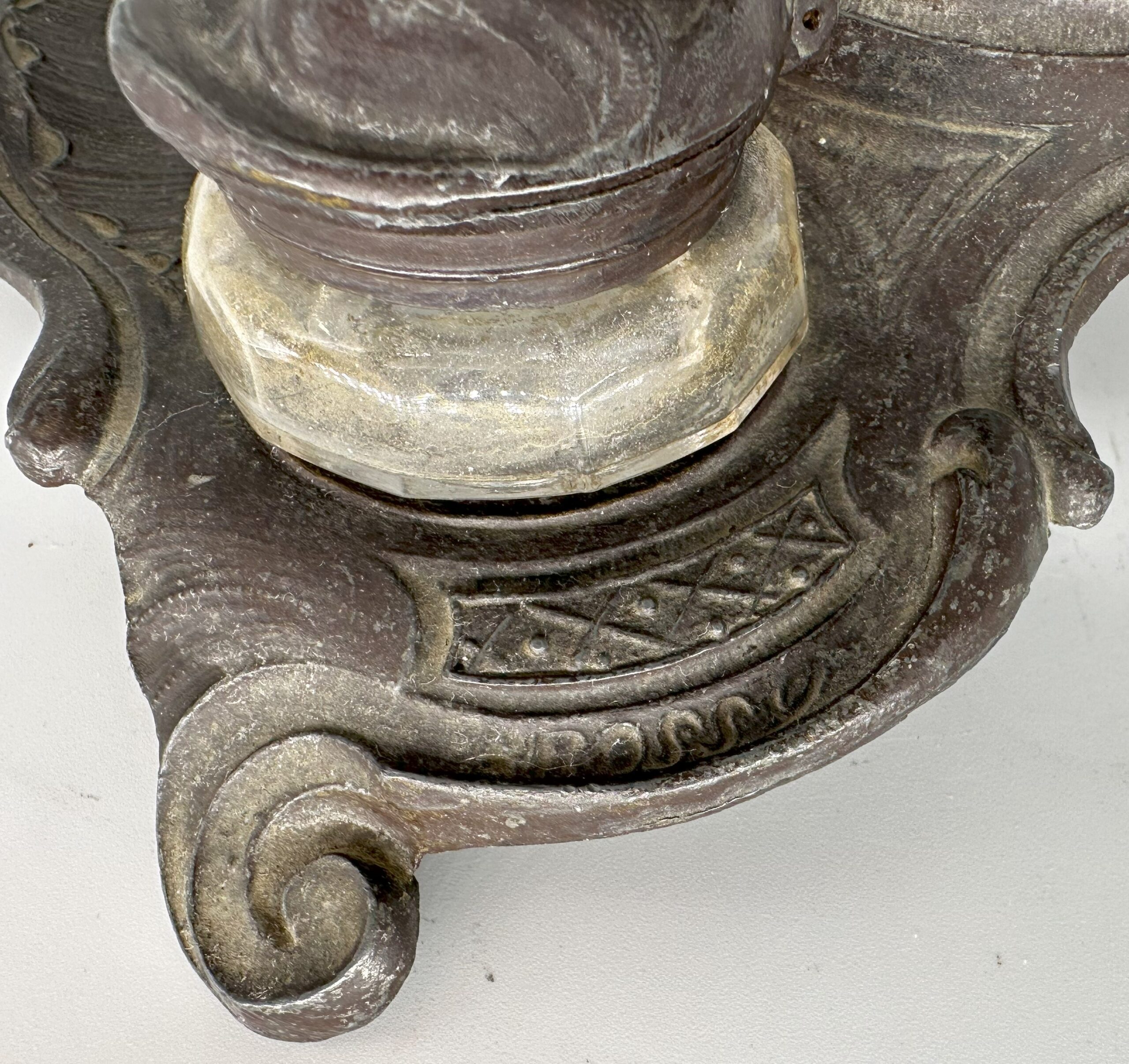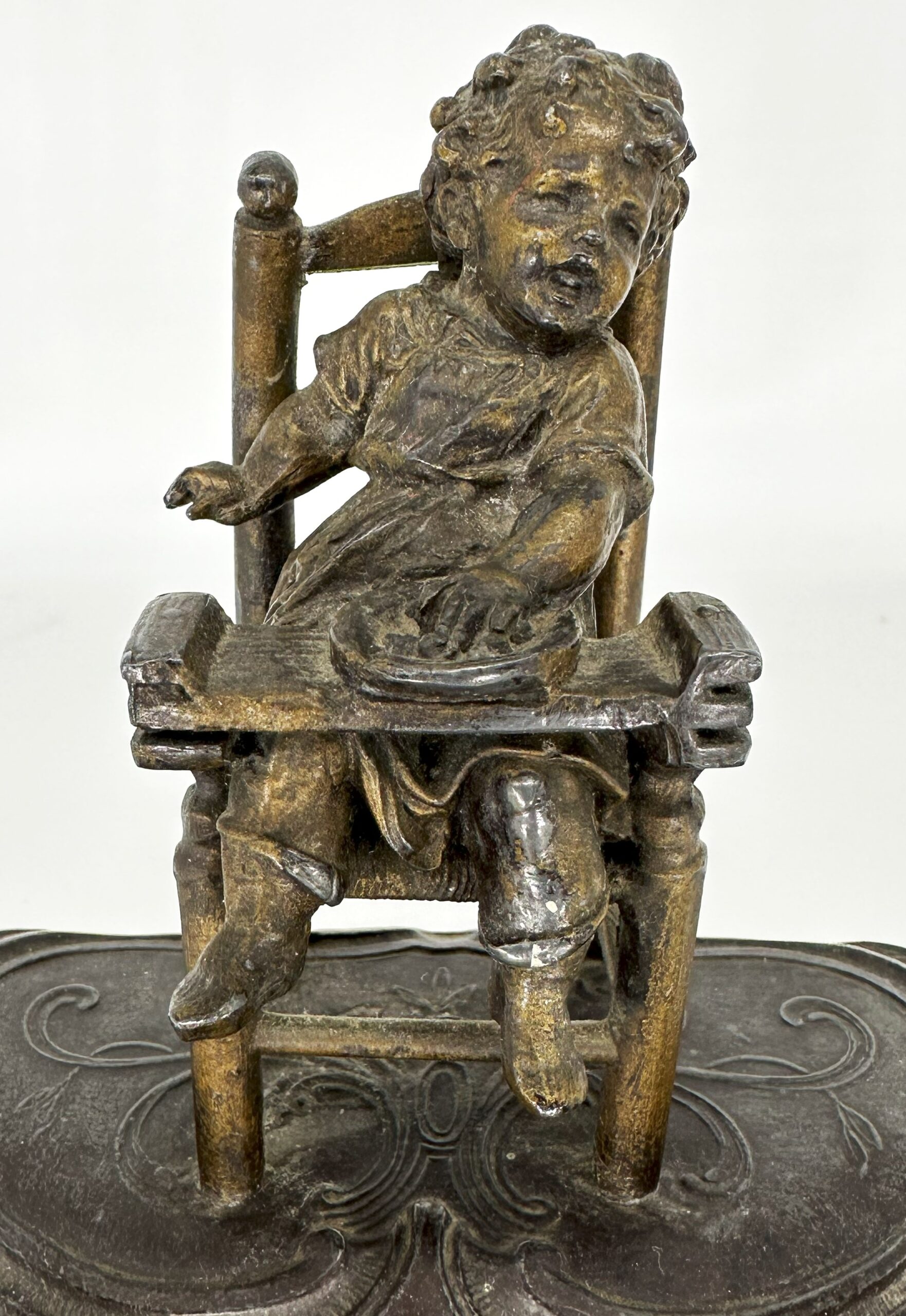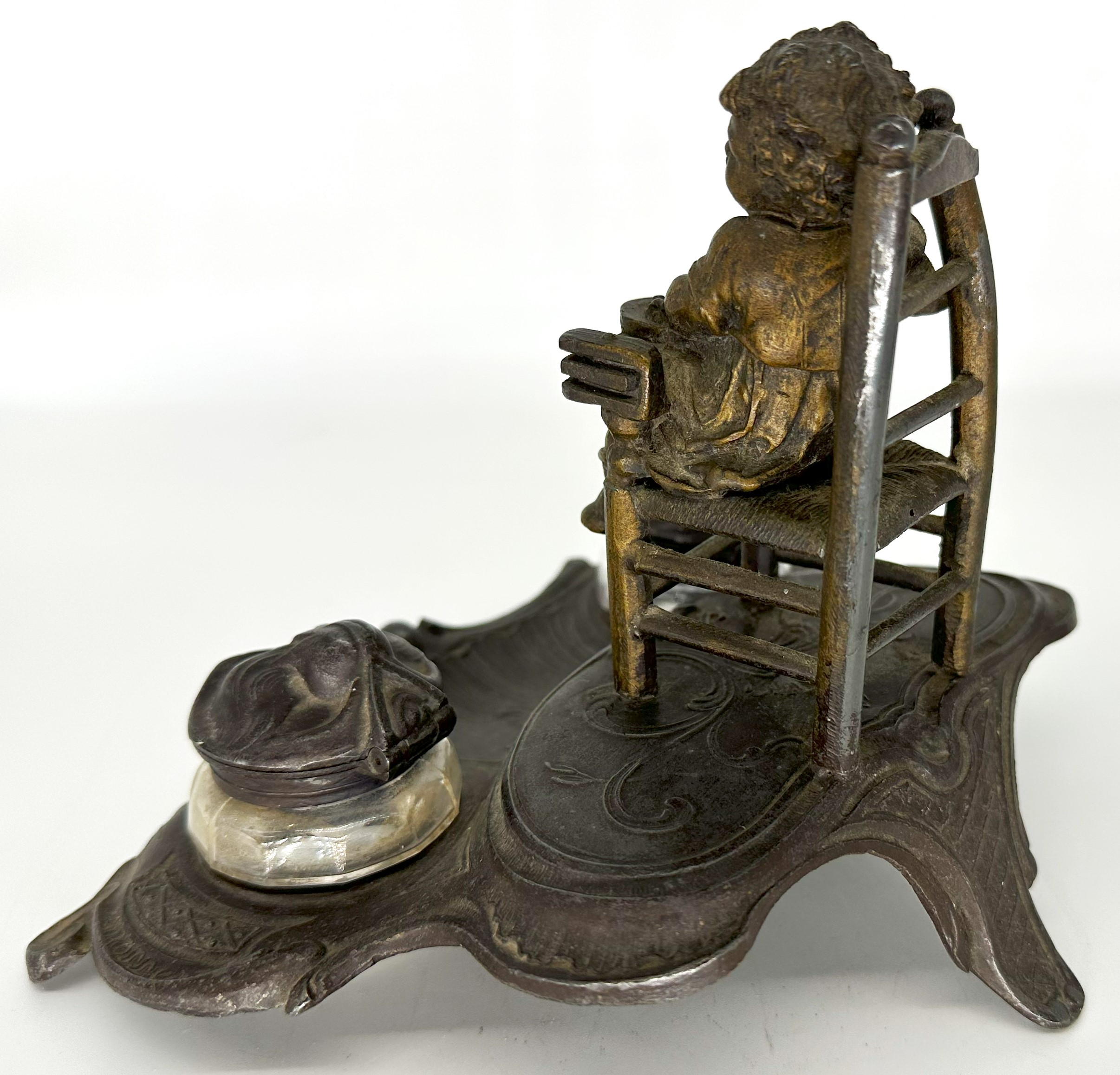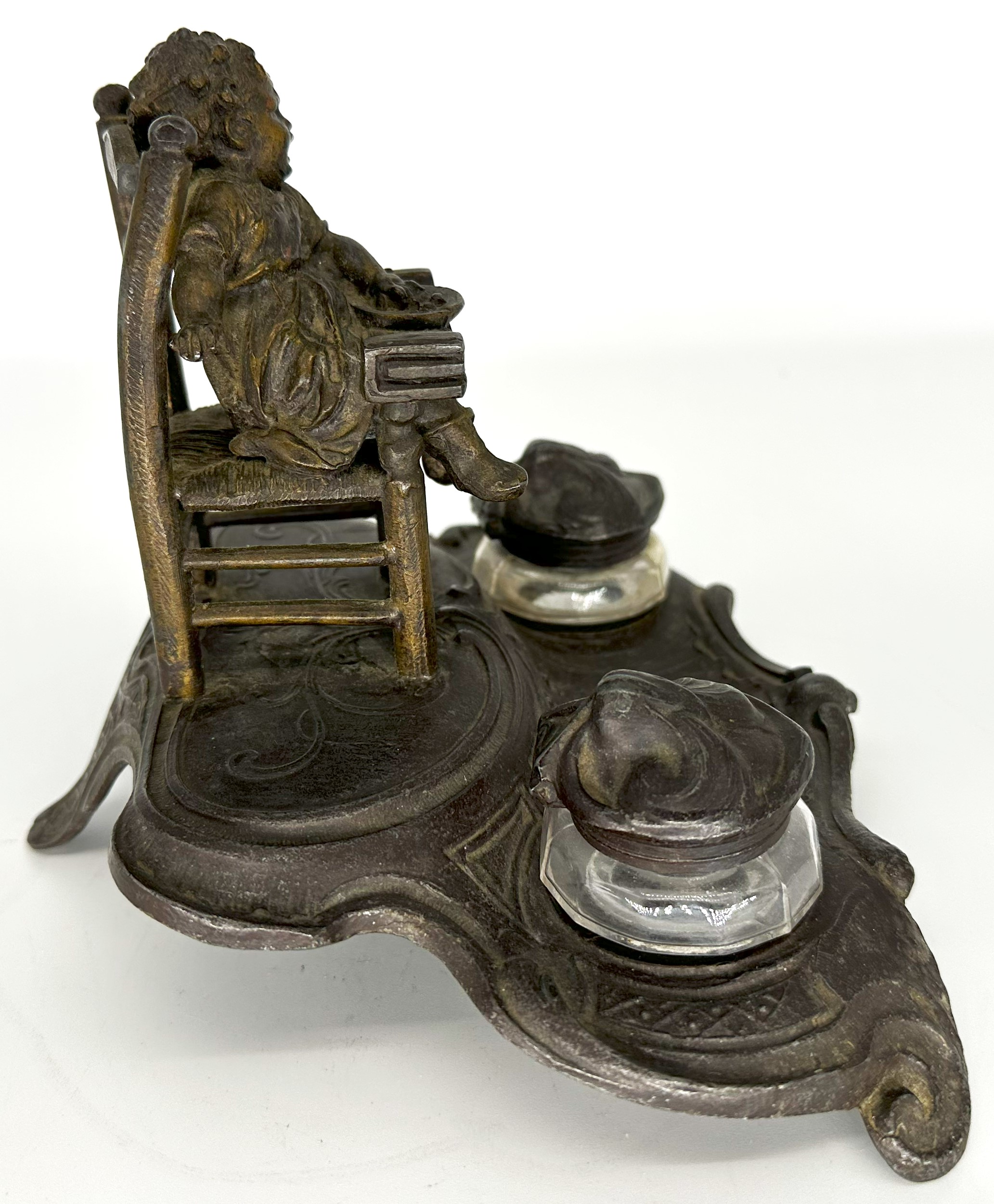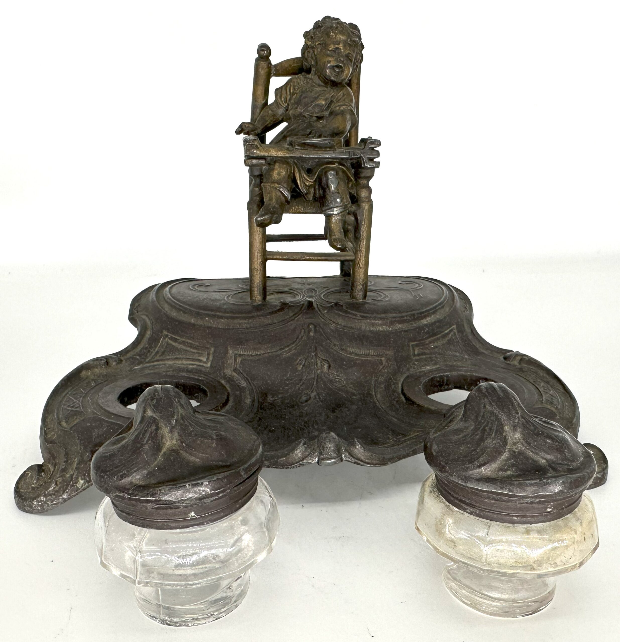 French spelter bronze inkstand showing a little girl sitting in a highchair unhappily picking at her food. The piece is signed “A Bossu” and dates to the 1900’s Art Nouveau period. The inkstand is complete with two stemmed-glass inkwells with hinged lids.