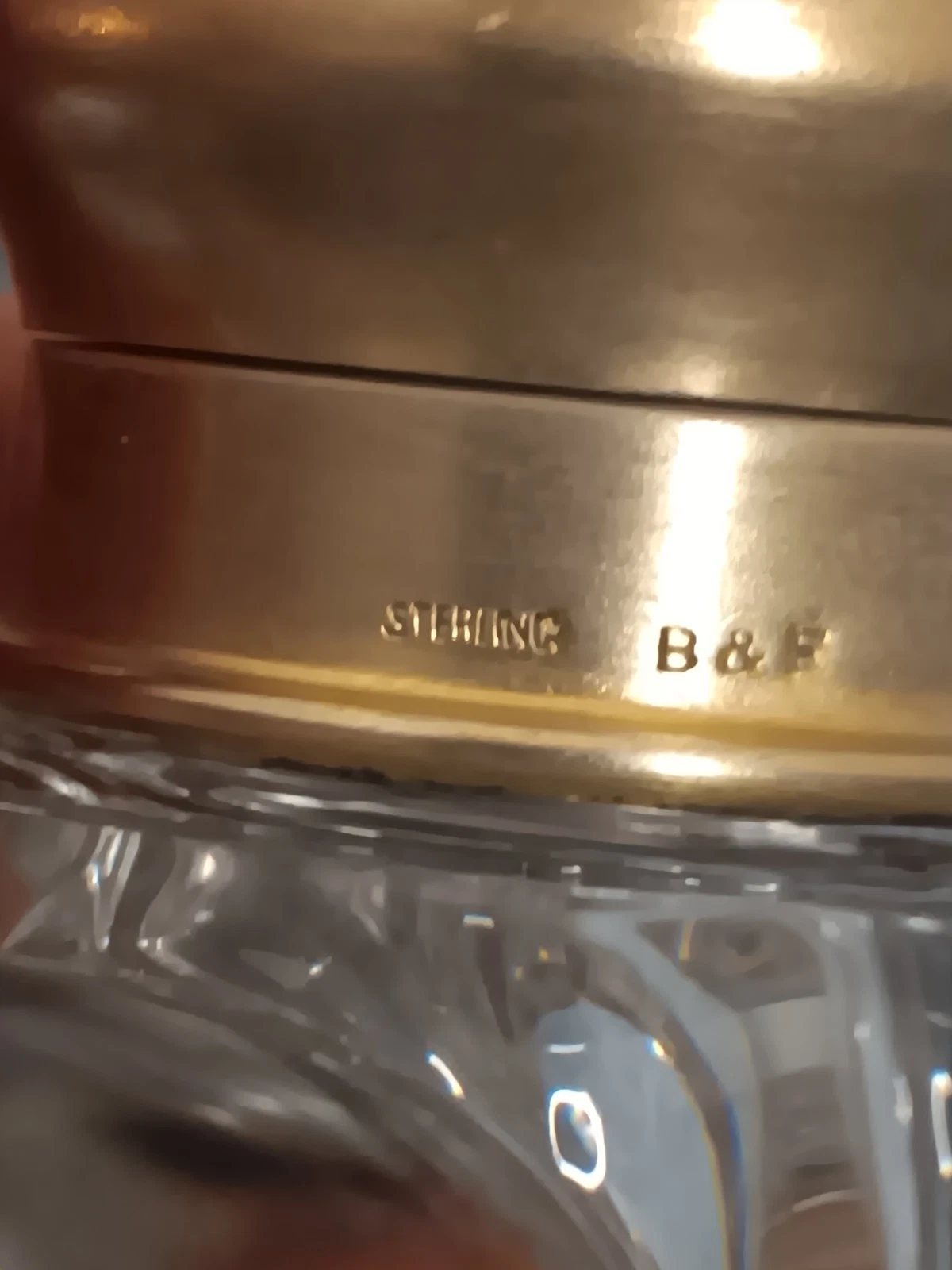 This is a crystal glass inkwell with a hinged sterling silver lid, marked “B & F” for Baden & Foss Inc., a New York City-based company active from the 1940s to the 1970s. The glass body of the inkwell features a classic design with rounded projections on the sides of the glass body, giving it a fluted or scalloped shape.