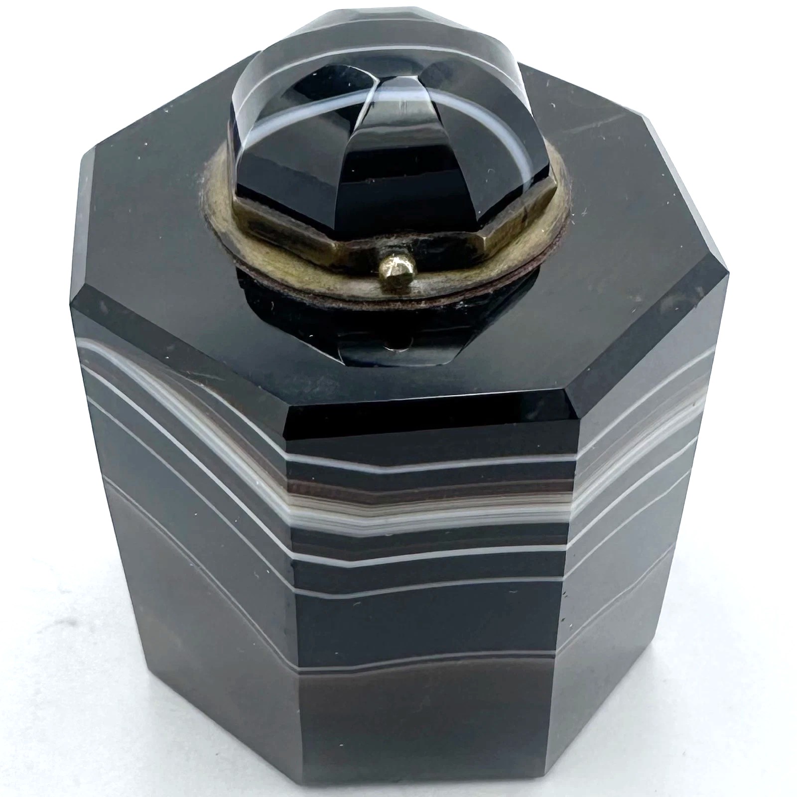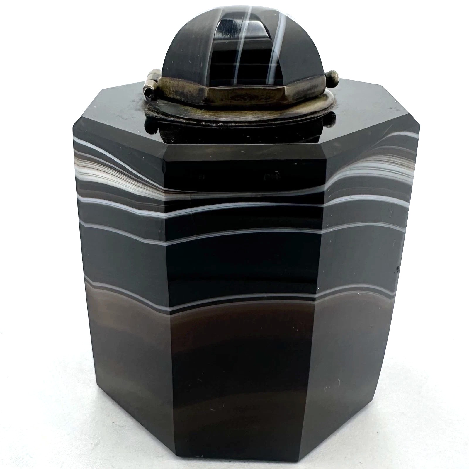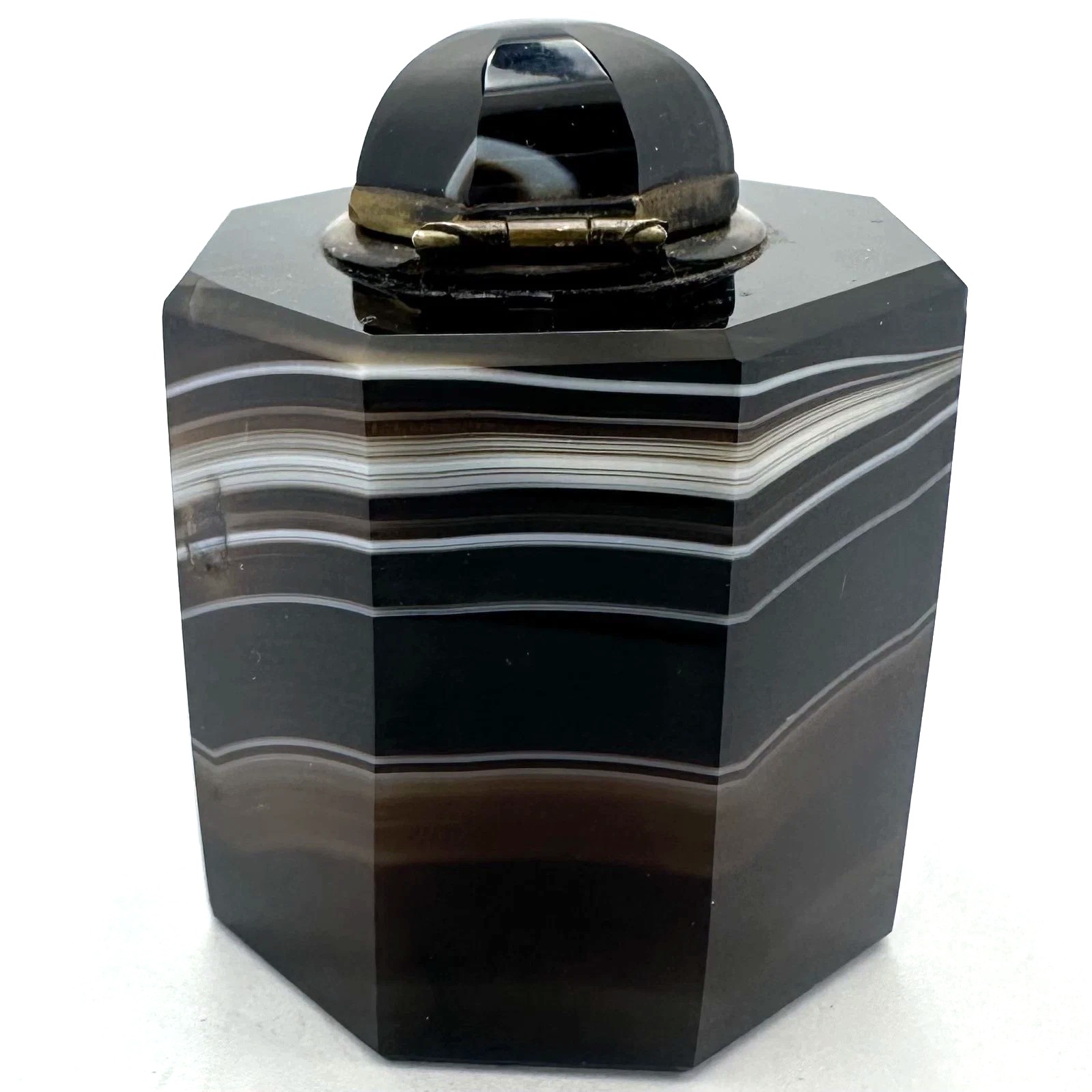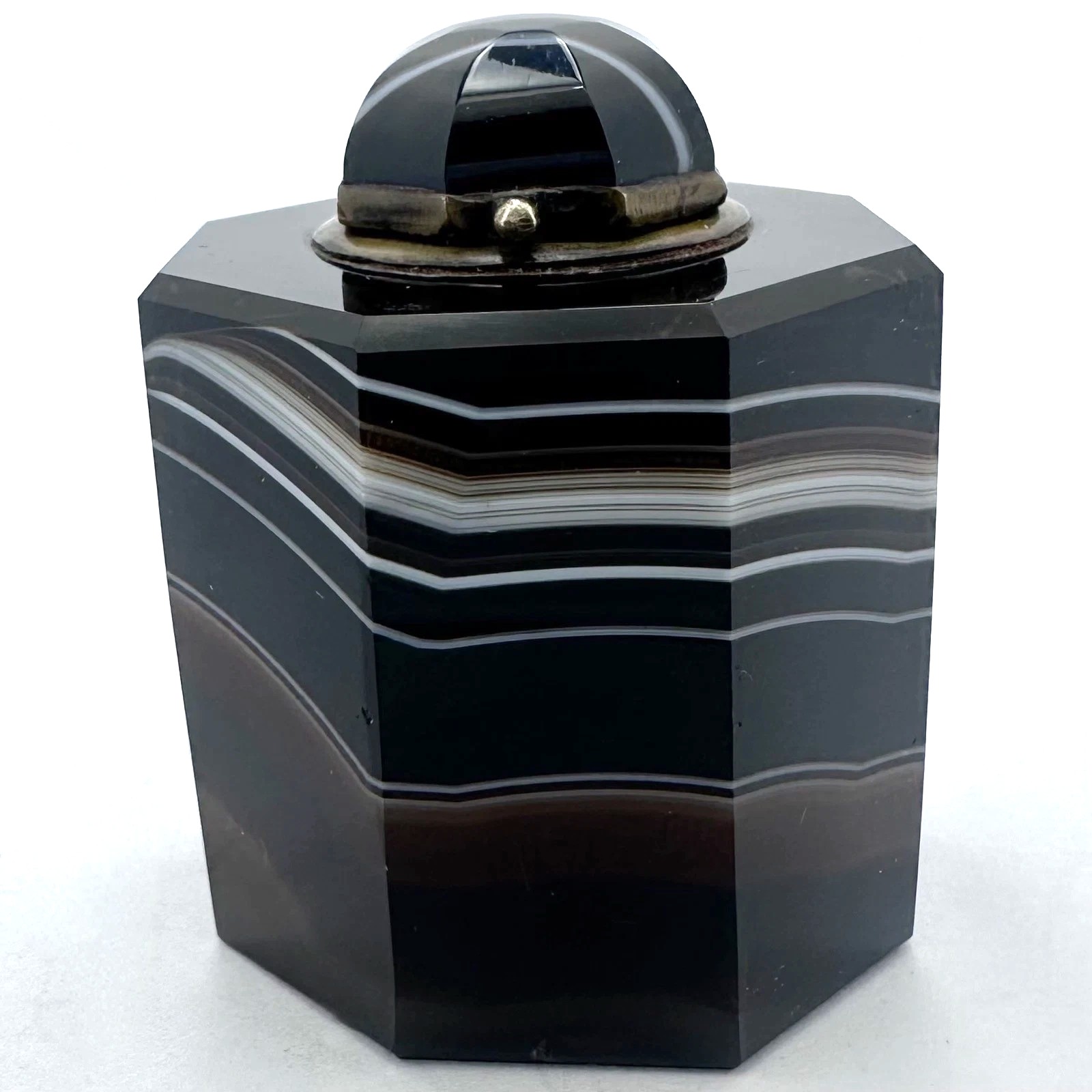 • Form: It has an octagonal (eight-sided) body that tapers slightly from the base to the shoulder. The lid is also faceted and capped with a matching piece of agate, creating a seamless visual flow when closed.