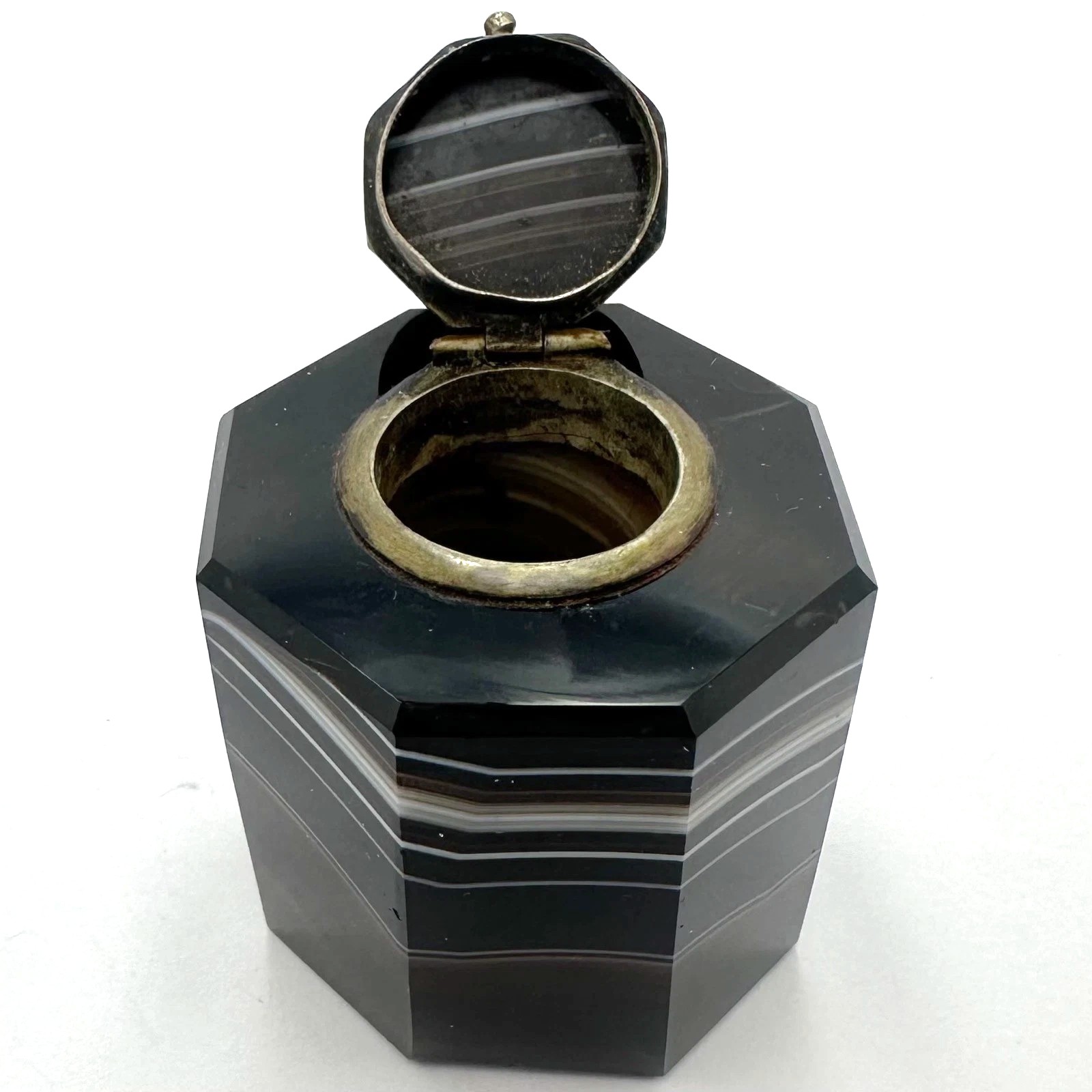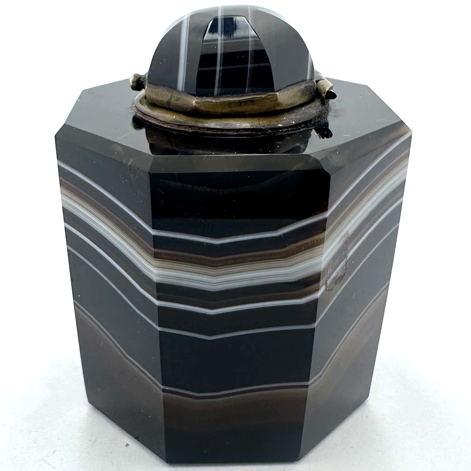 This banded agate inkwell, dating circa 1870–1890, was referred to in the period as “onyx agate” or “Scottish pebble” work. This as a classic example of late 19th-century lapidary skill, where the natural beauty of the stone is the primary “decoration.”