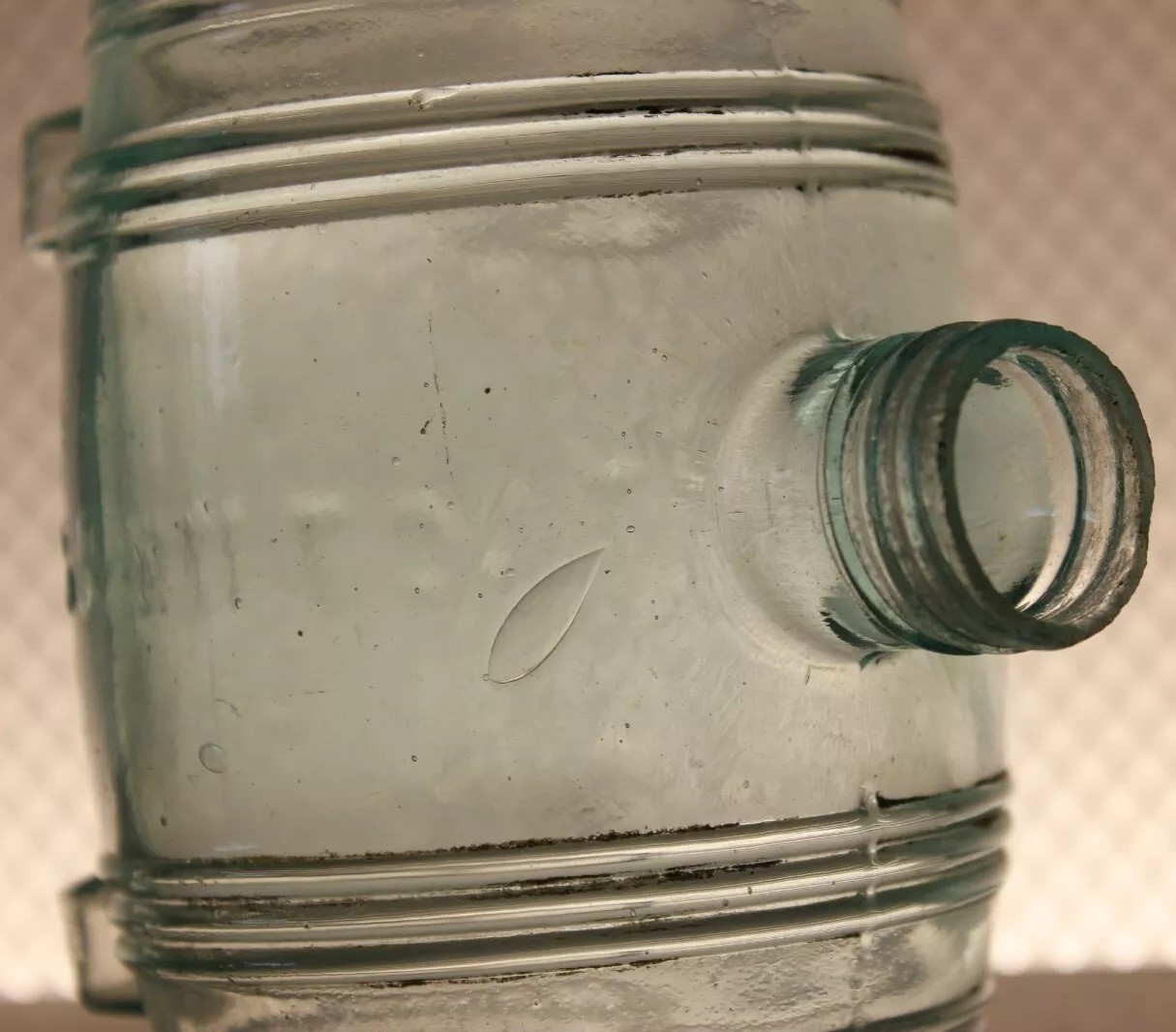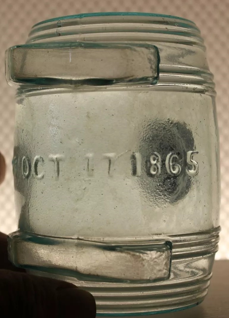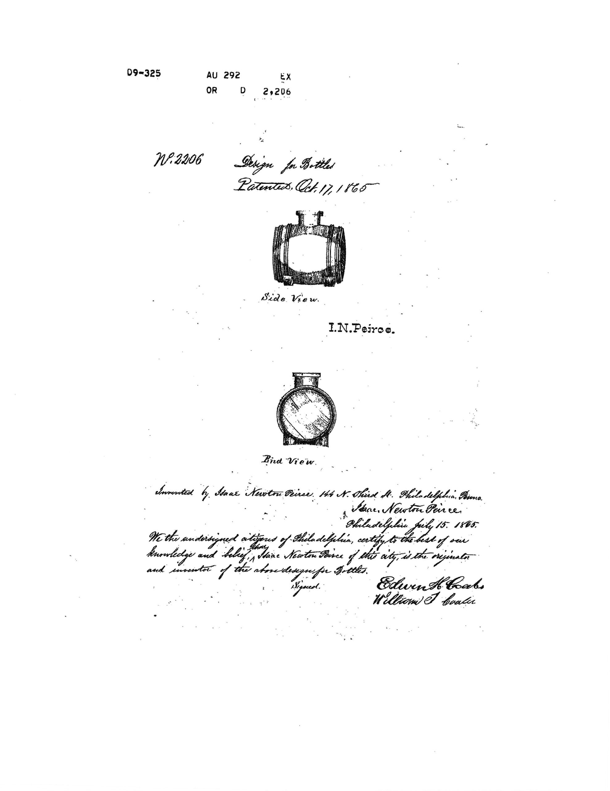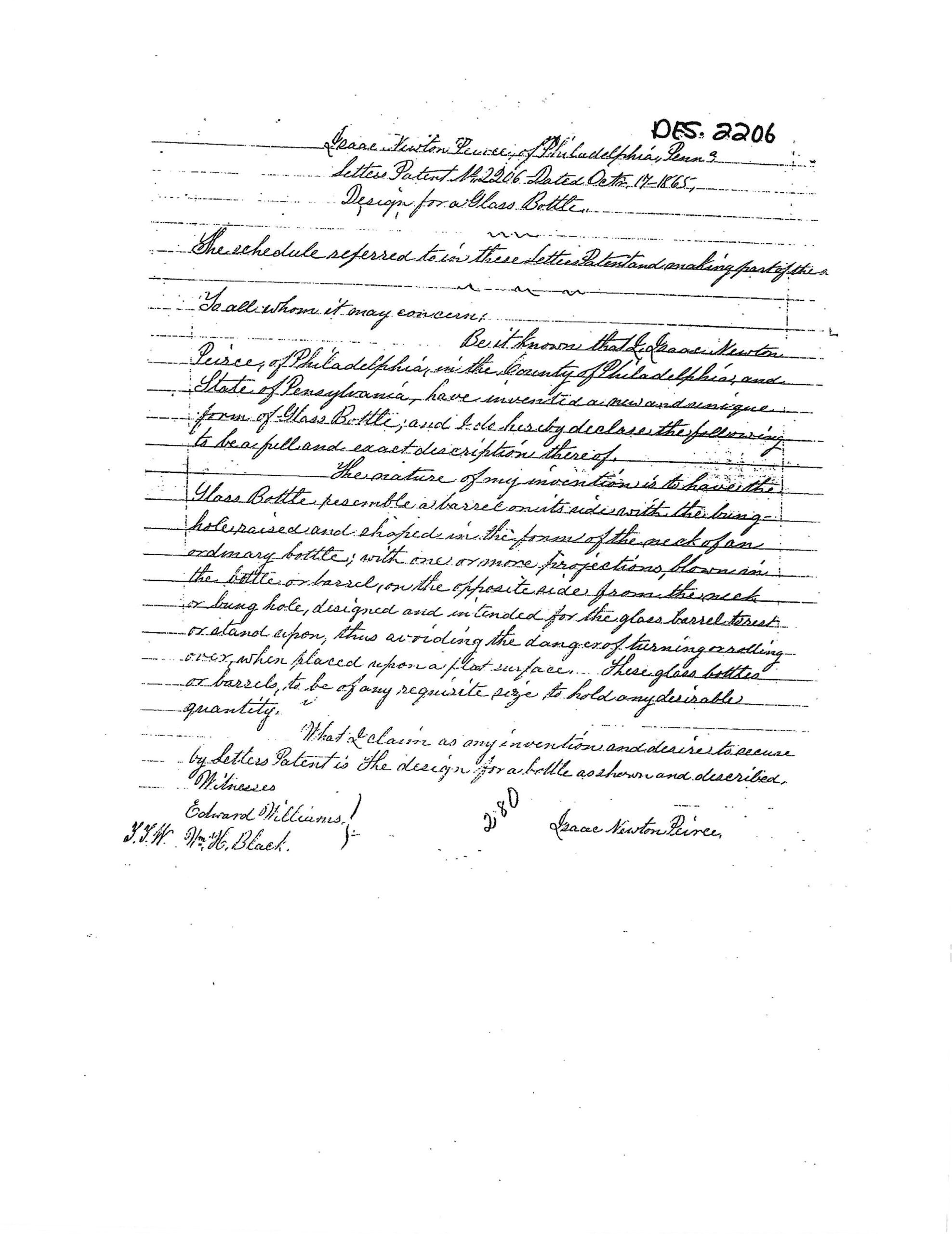 This design was practical for use, providing an easy grip and preventing the bottle from rolling when placed on its side. Isaac Pierce patented this design on October 17, 1865 (US D002206S). The bottle is embossed “PAT OCT 17 1865” on its underside.