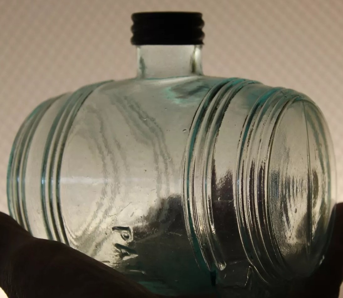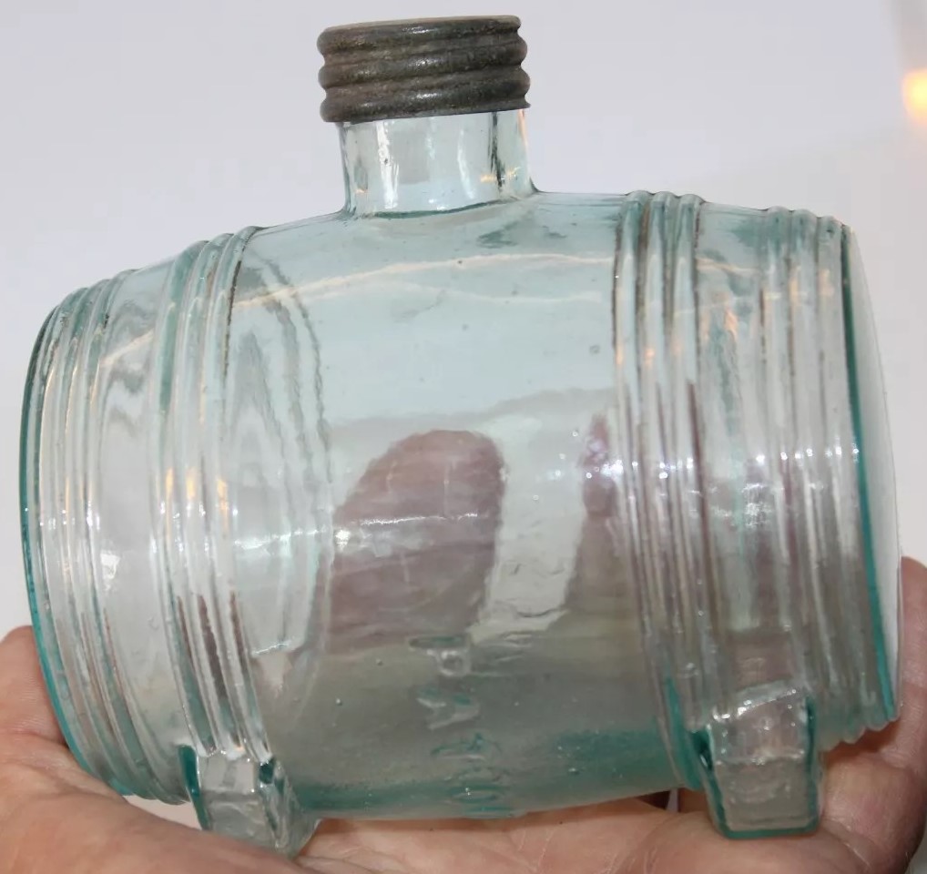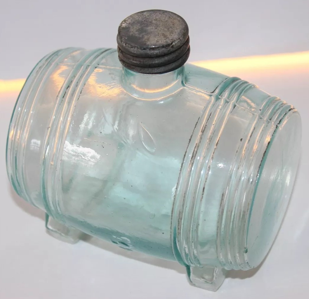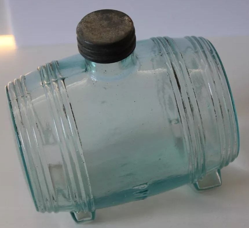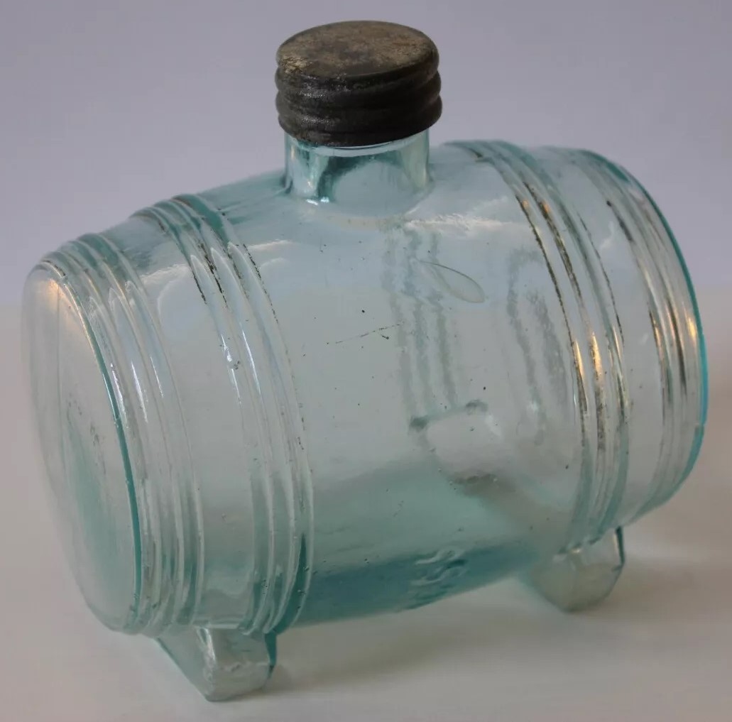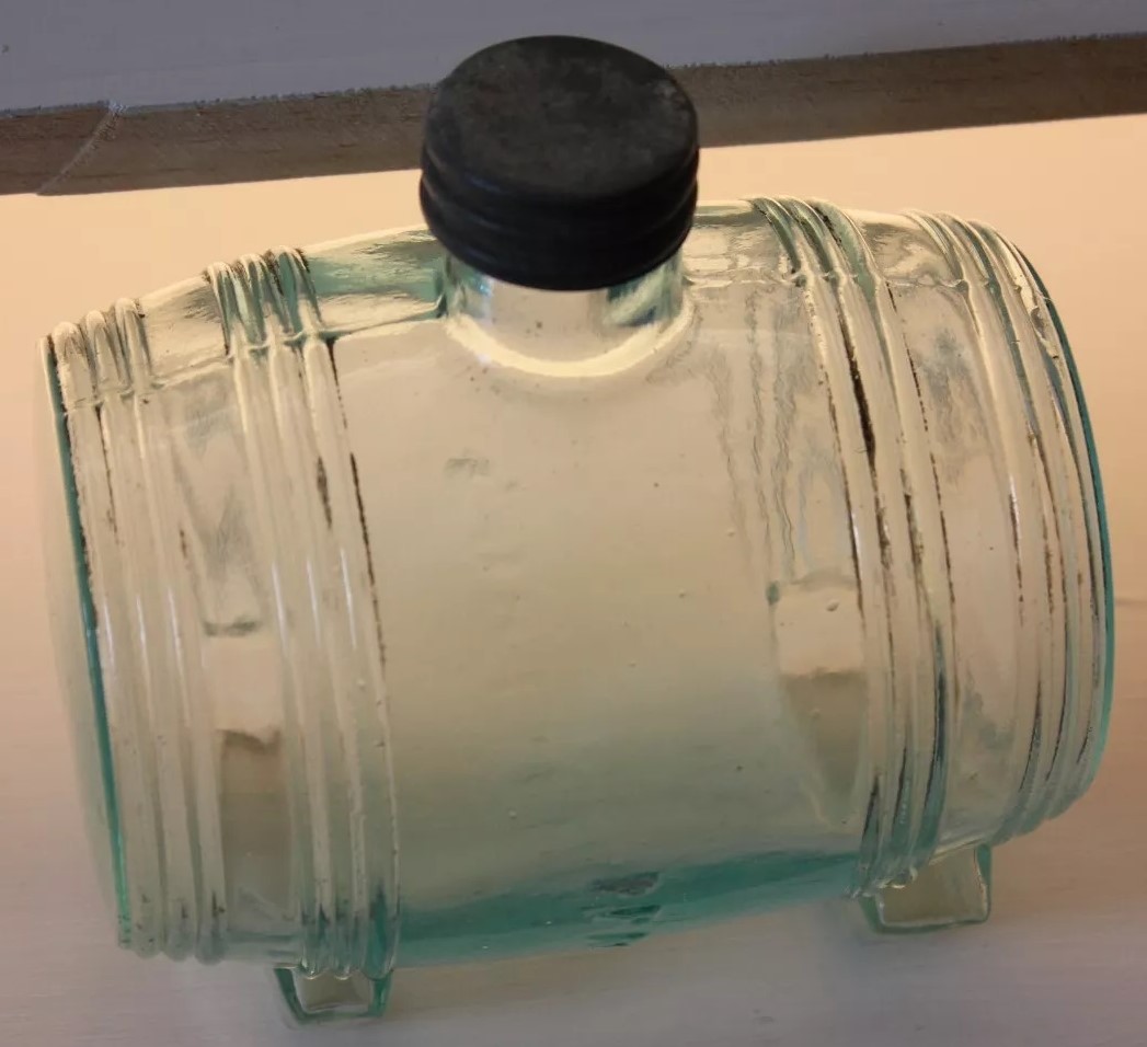 An ink bottle designed to resemble a barrel. It has an aqua color, typical of 19th-century glassware due to the minerals used in the glass-making process. The bottle features horizontal ridges that mimic the staves of a wooden barrel and circular indents on each side representing barrel hoops. The top has a small neck with threading for a screw cap.