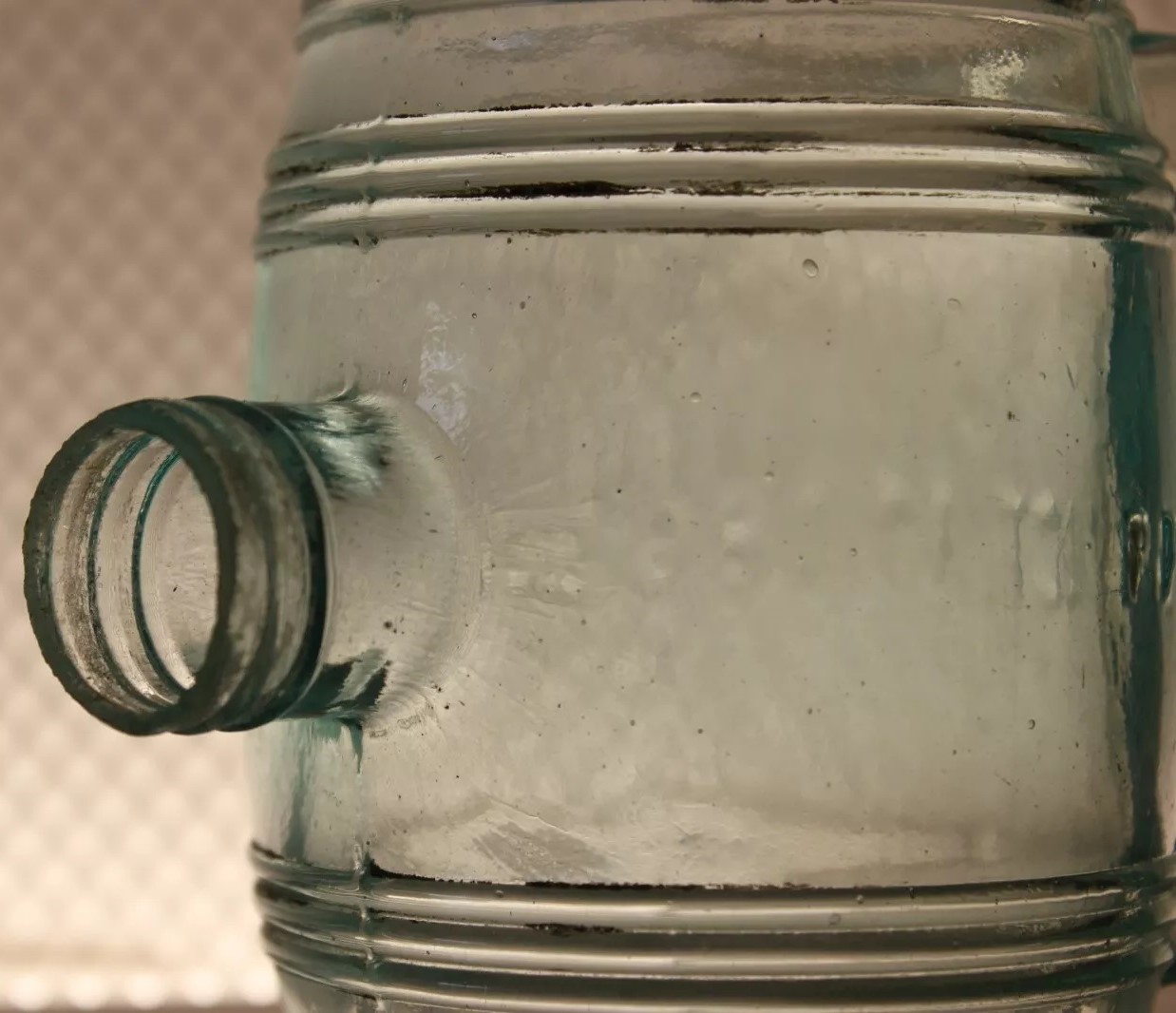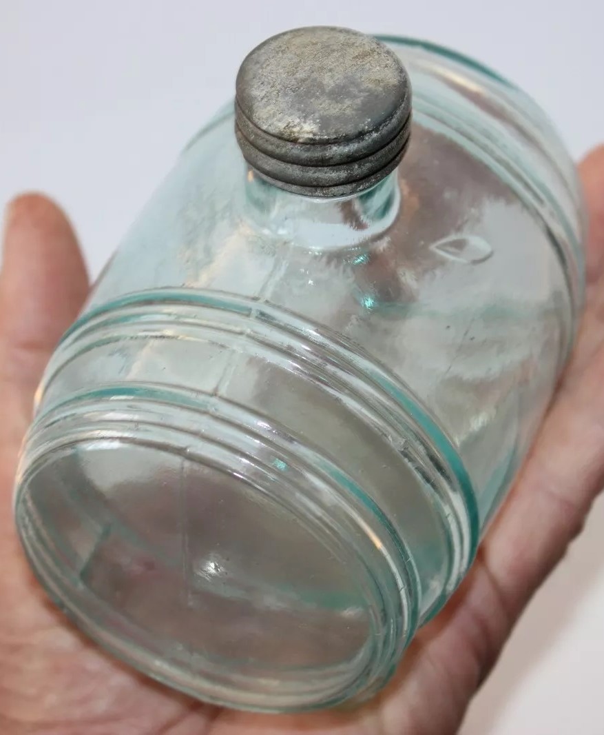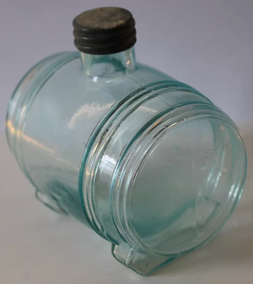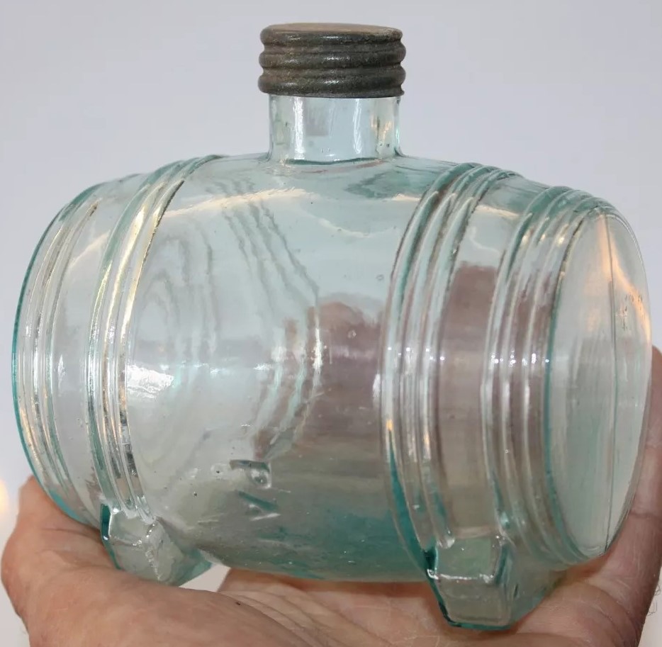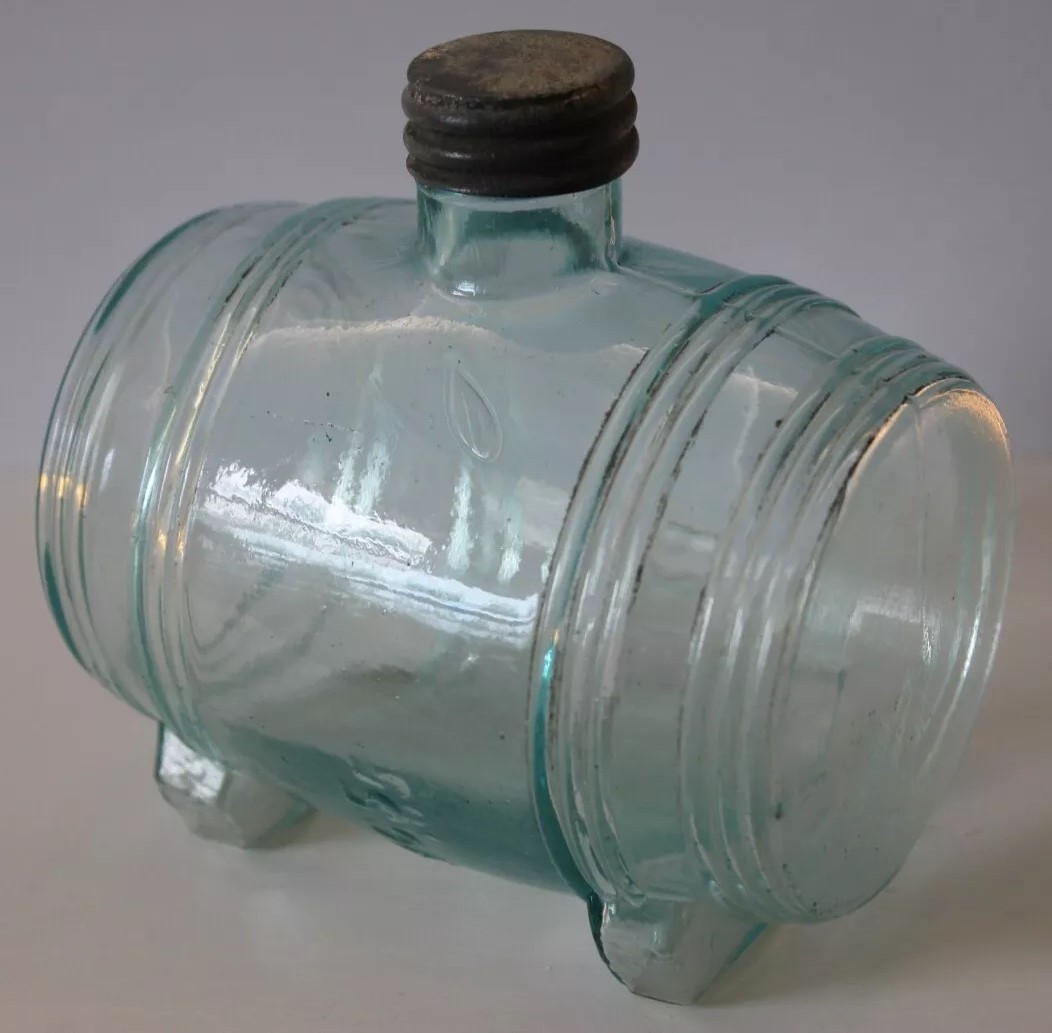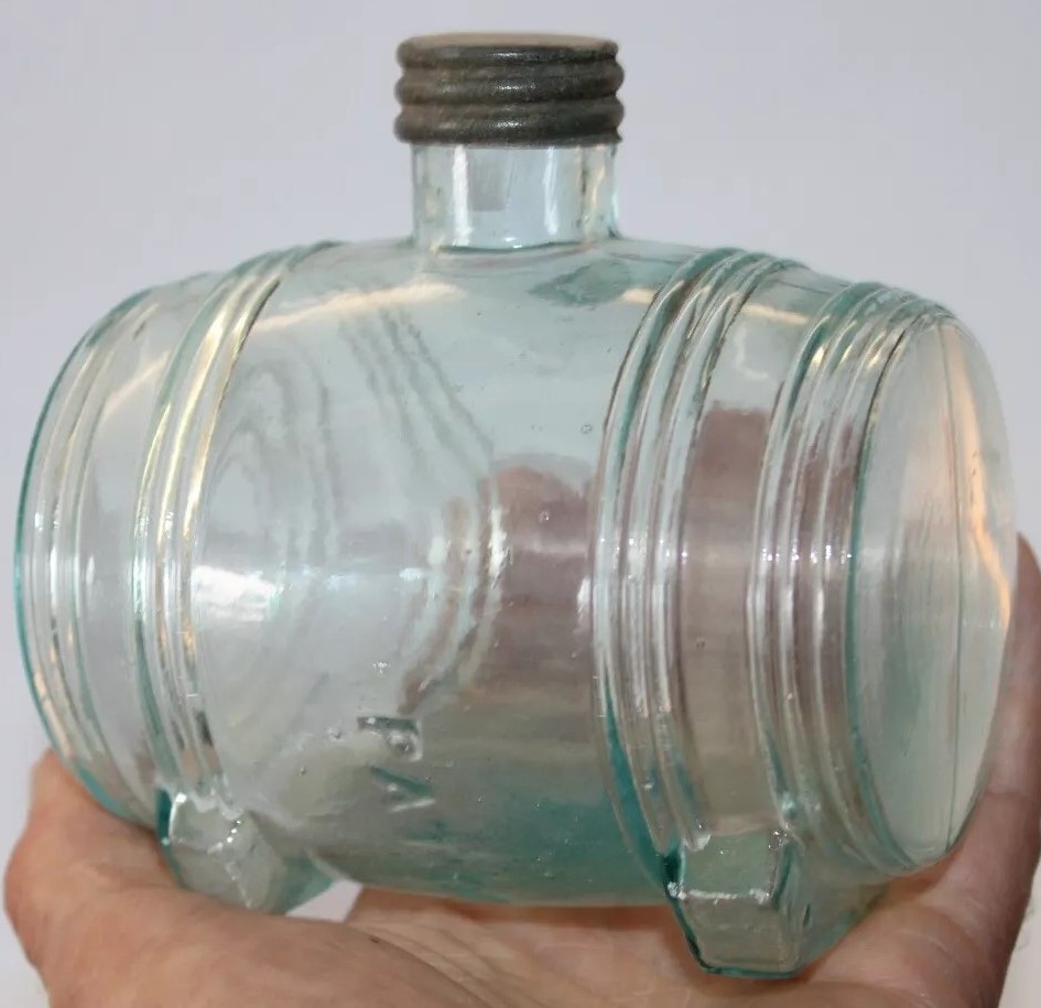 An ink bottle designed to resemble a barrel. It has an aqua color, typical of 19th-century glassware due to the minerals used in the glass-making process. The bottle features horizontal ridges that mimic the staves of a wooden barrel and circular indents on each side representing barrel hoops. The top has a small neck with threading for a screw cap.