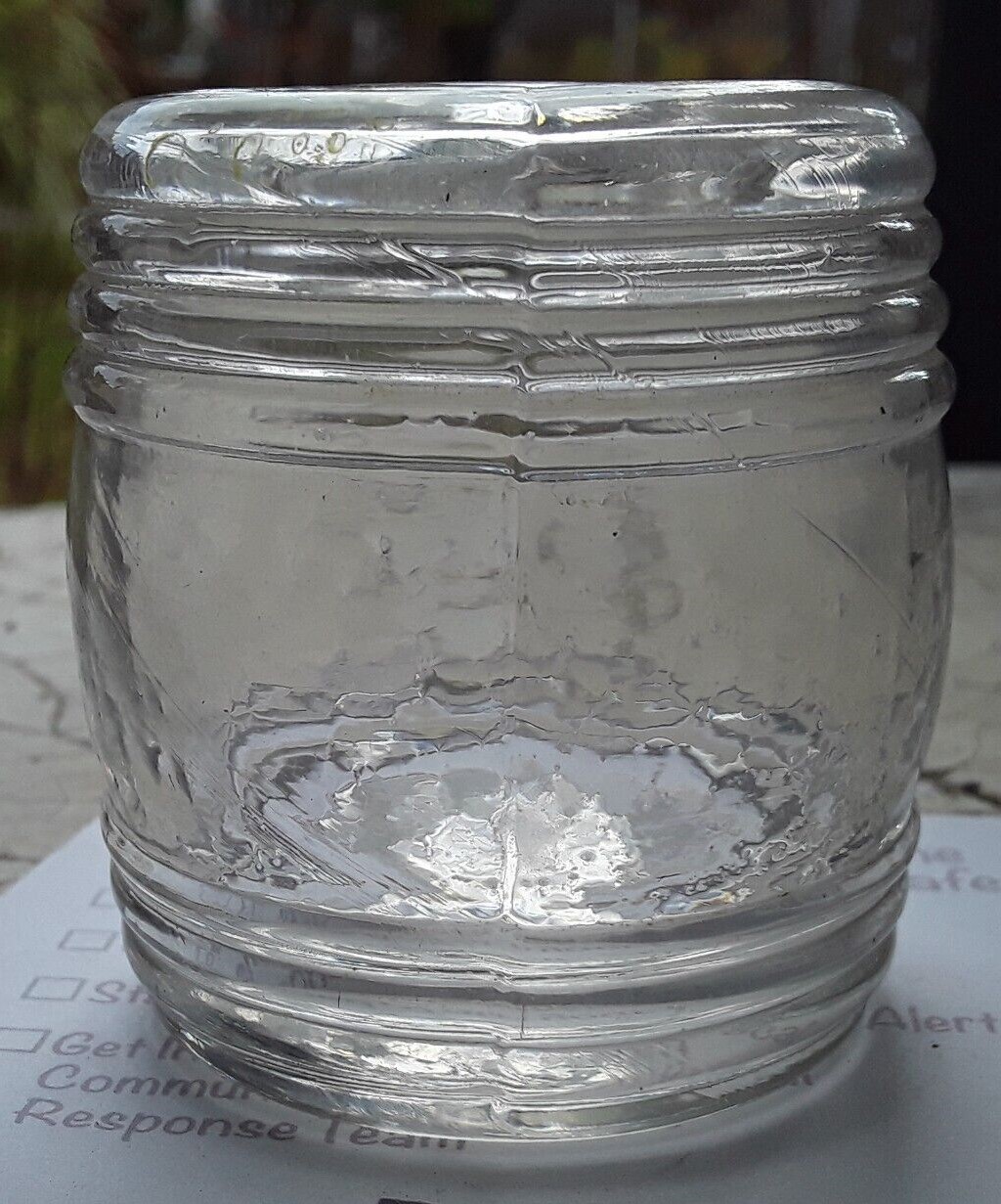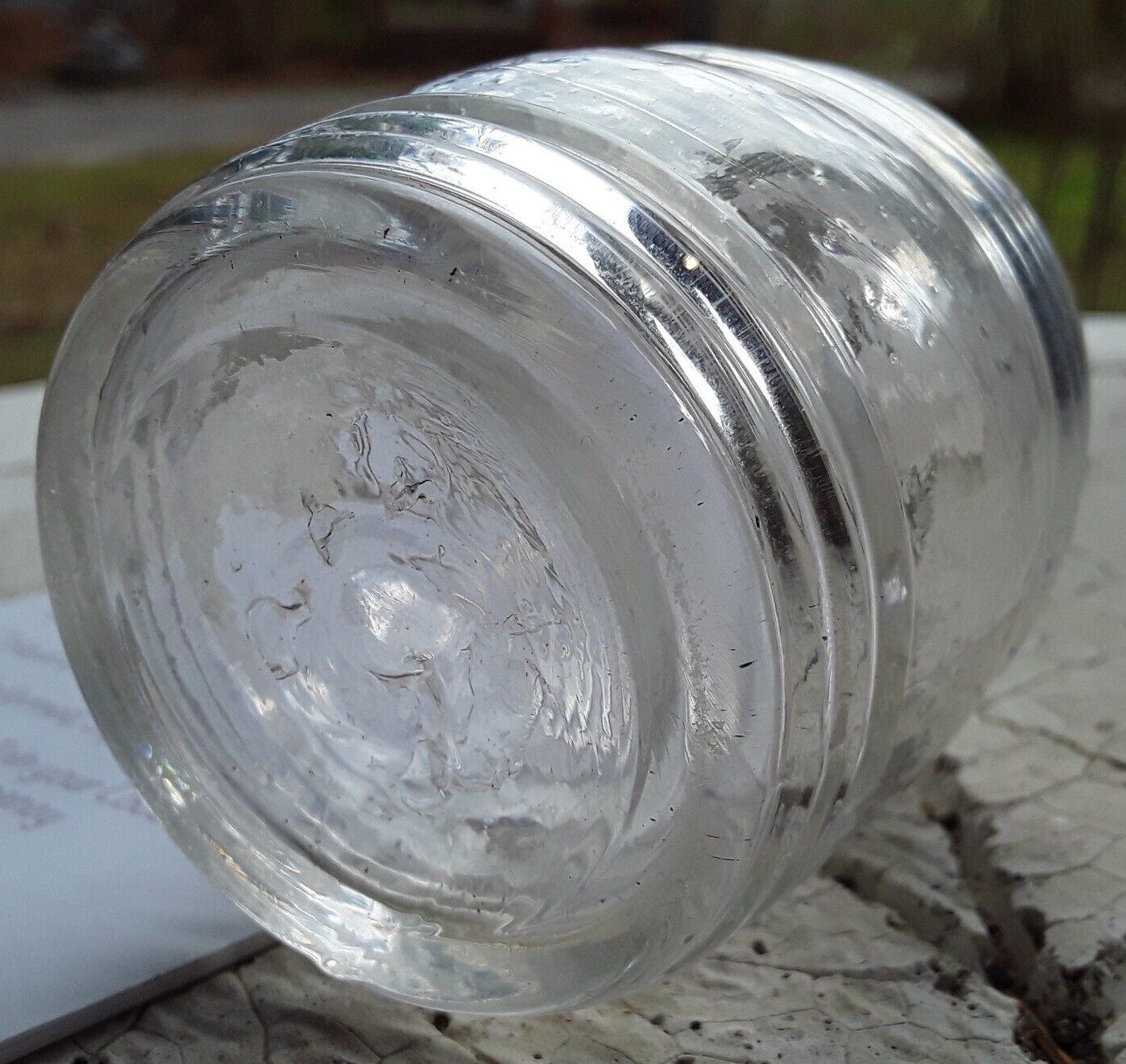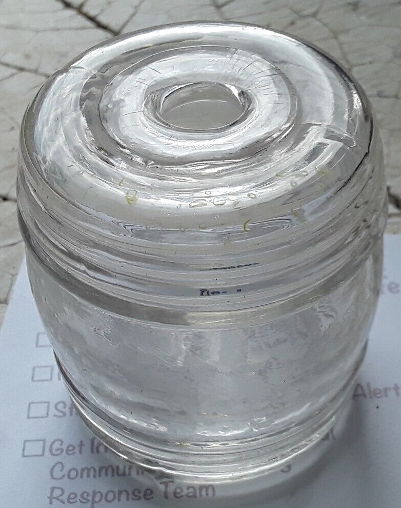 This barrel-shaped ink bottle has three horizontal ribs along the base and four ribs along the top. Made of clear flint glass in a two part mold, having a solid glass pontil. Its disc-type opening is similar to the Keene geometric and Coventry ink bottles of the 1830’s.