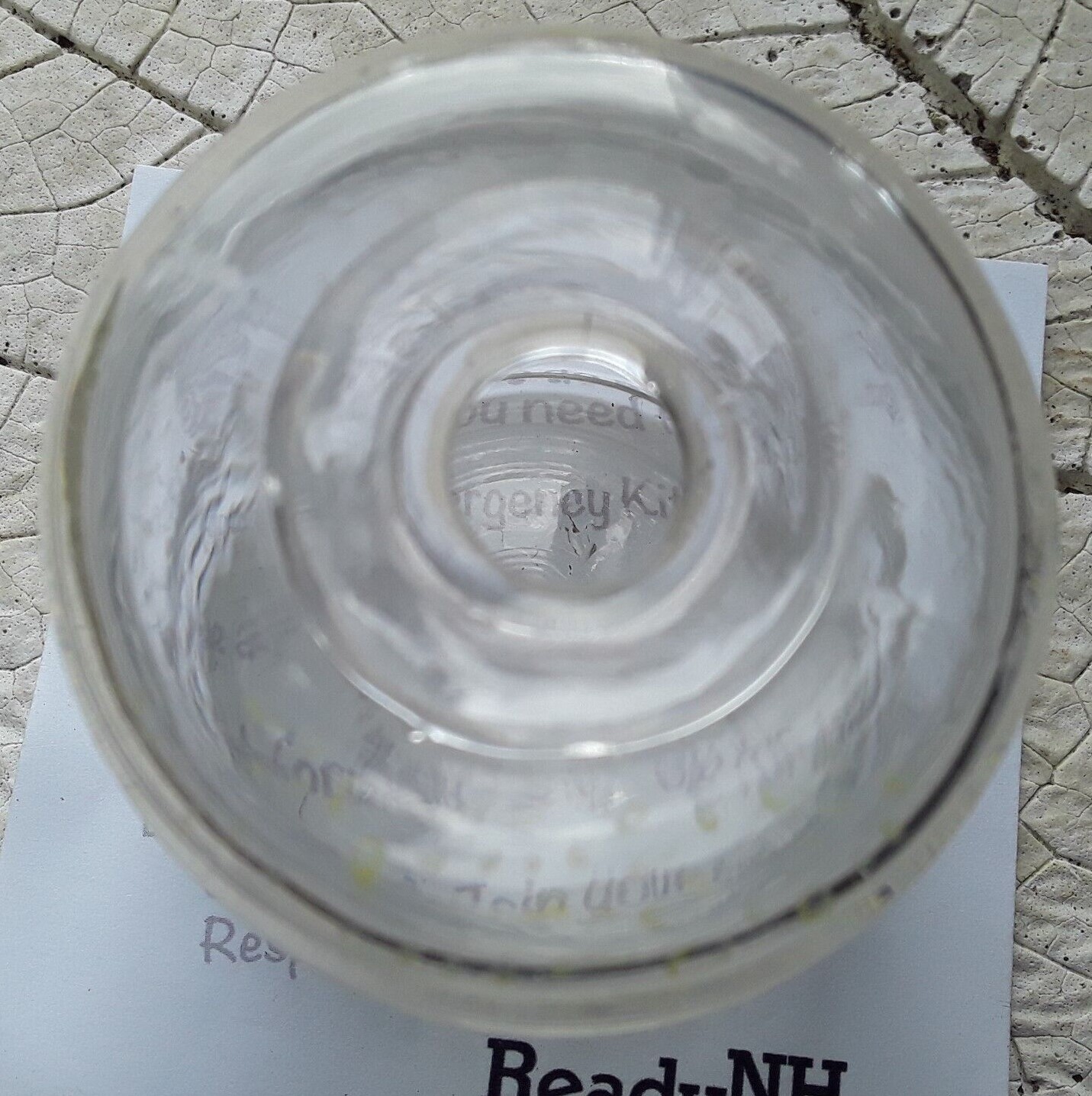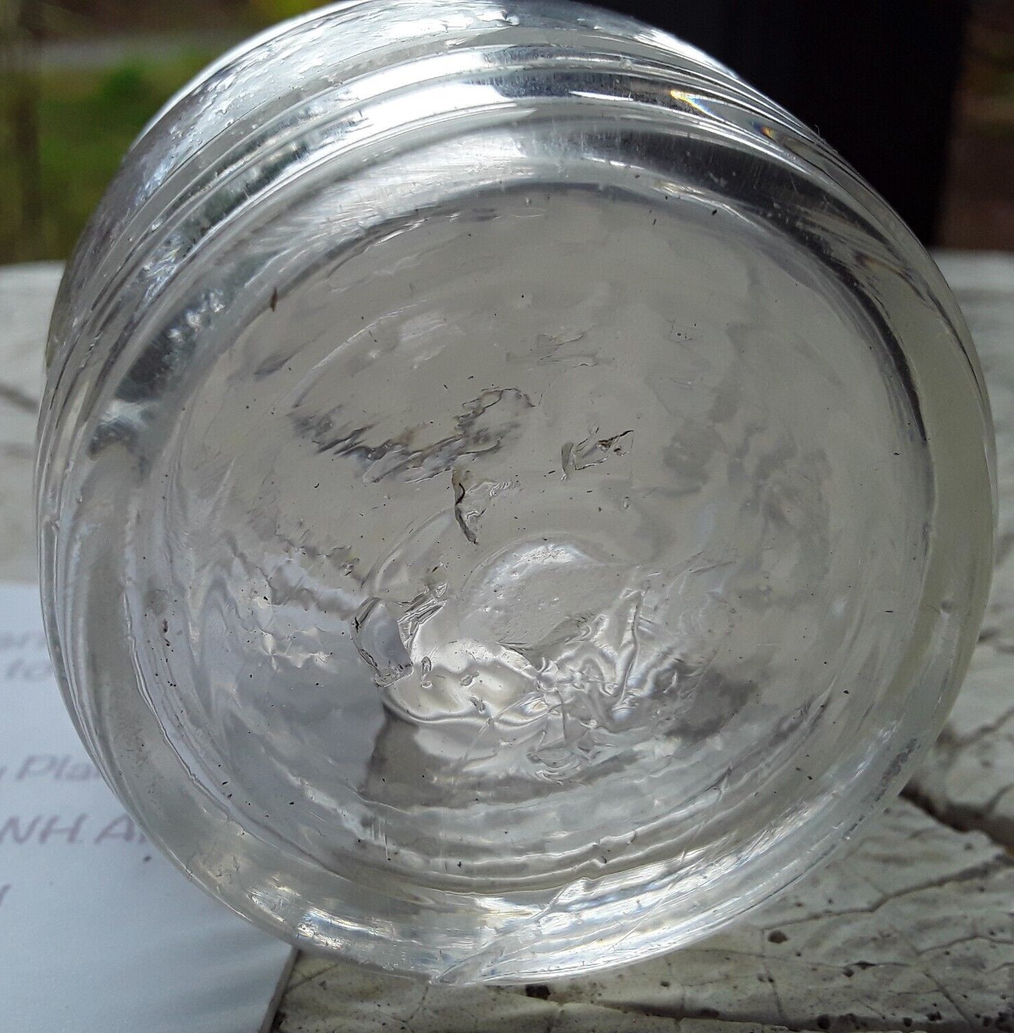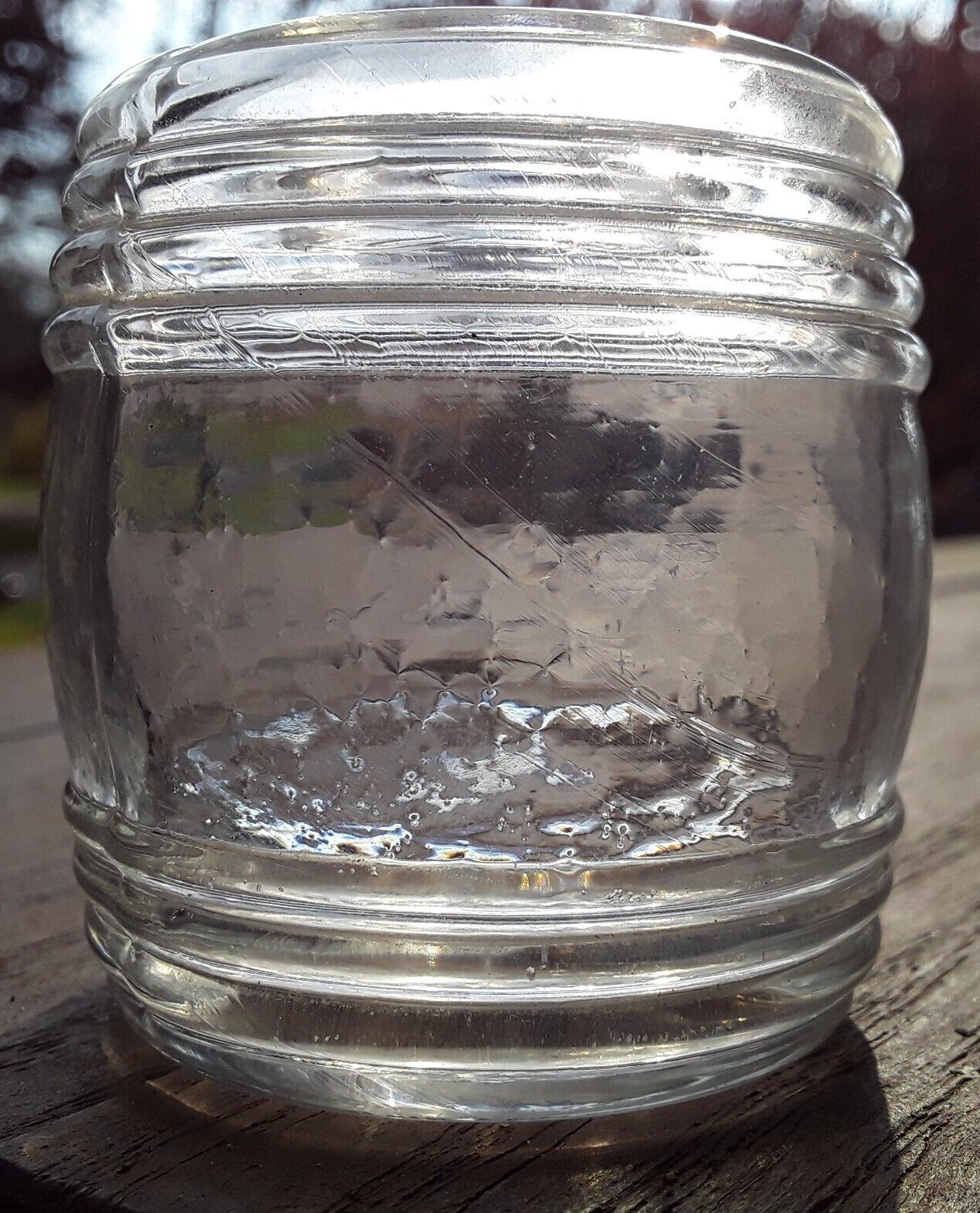 This barrel-shaped ink bottle has three horizontal ribs along the base and four ribs along the top. Made of clear flint glass in a two part mold, having a solid glass pontil. Its disc-type opening is similar to the Keene geometric and Coventry ink bottles of the 1830’s.