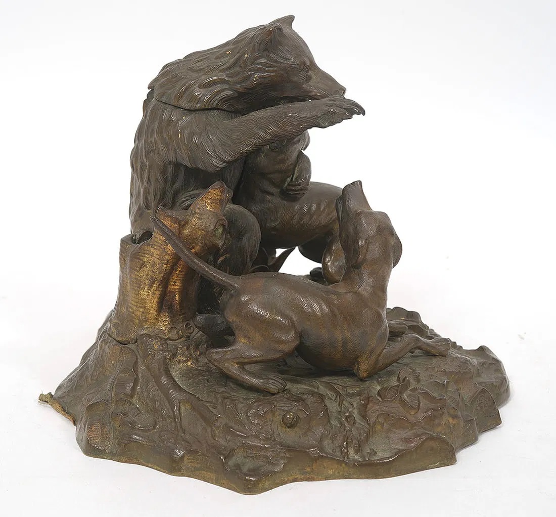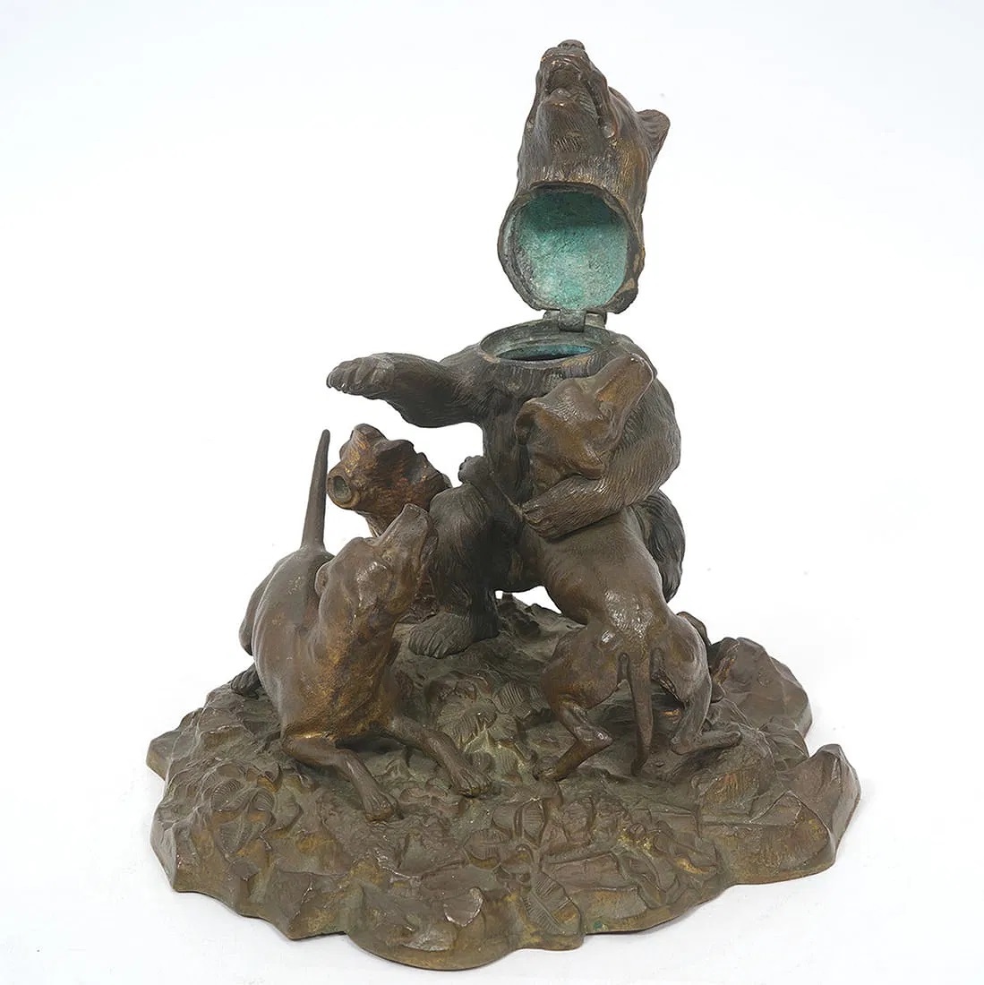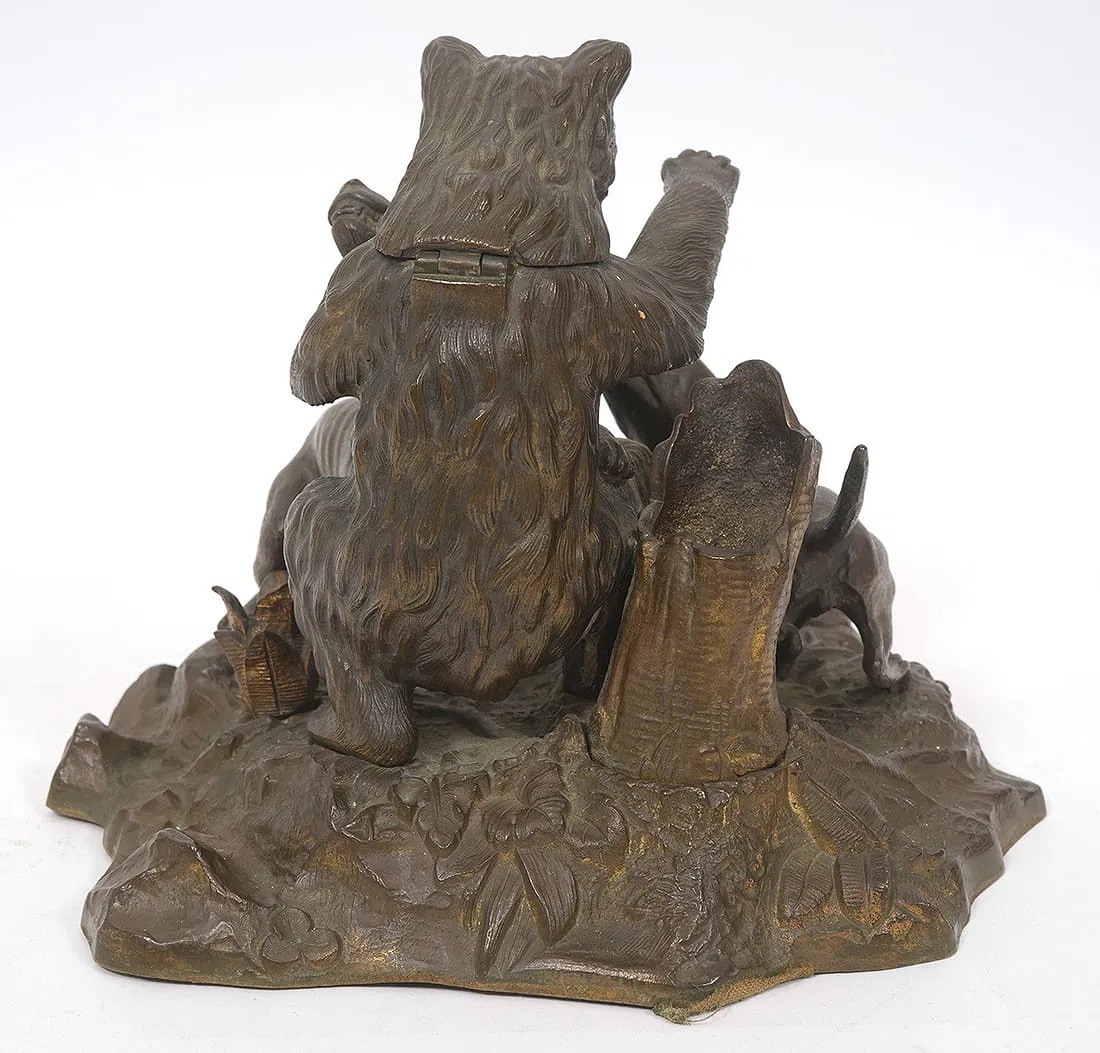 A closer inspection reveals functional elements: the bear’s head is hinged at the neck and opens to the rear, revealing a concealed compartment that once held an inkpot insert—indicating the piece also served as a desk accessory. Additionally, beneath the base is a spring mechanism connected to the rear feet of the upper left dog, suggesting it originally rocked up and down, adding a mechanical element of movement to the composition.