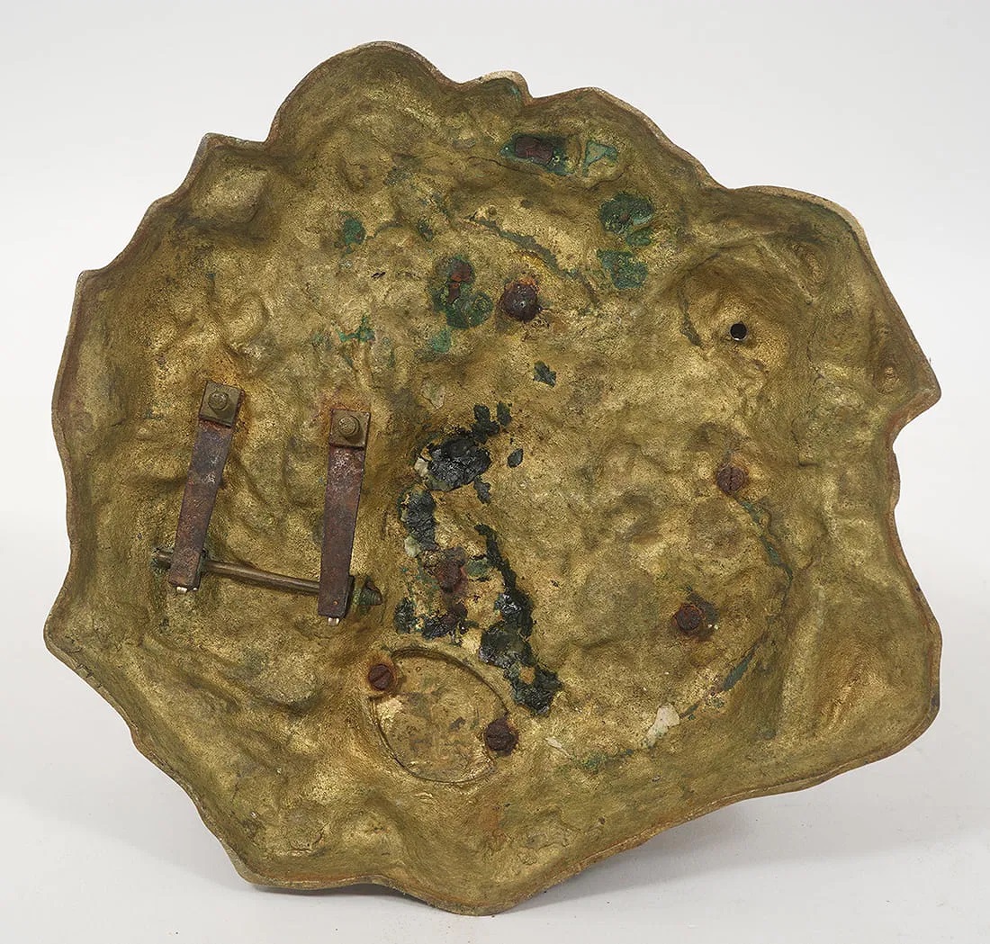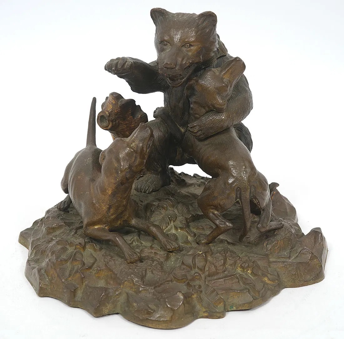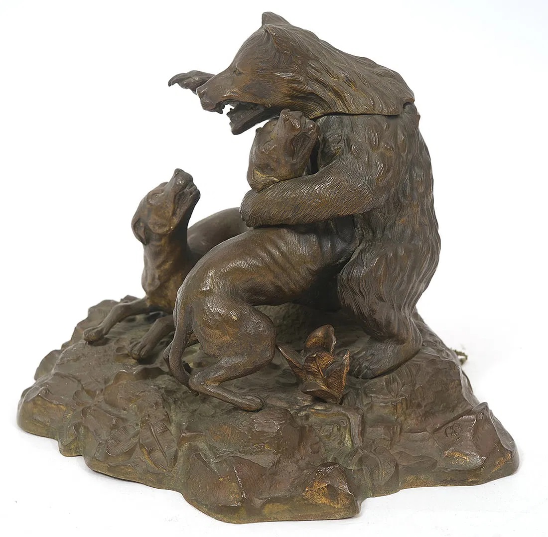 A closer inspection reveals functional elements: the bear’s head is hinged at the neck and opens to the rear, revealing a concealed compartment that once held an inkpot insert—indicating the piece also served as a desk accessory. Additionally, beneath the base is a spring mechanism connected to the rear feet of the upper left dog, suggesting it originally rocked up and down, adding a mechanical element of movement to the composition.