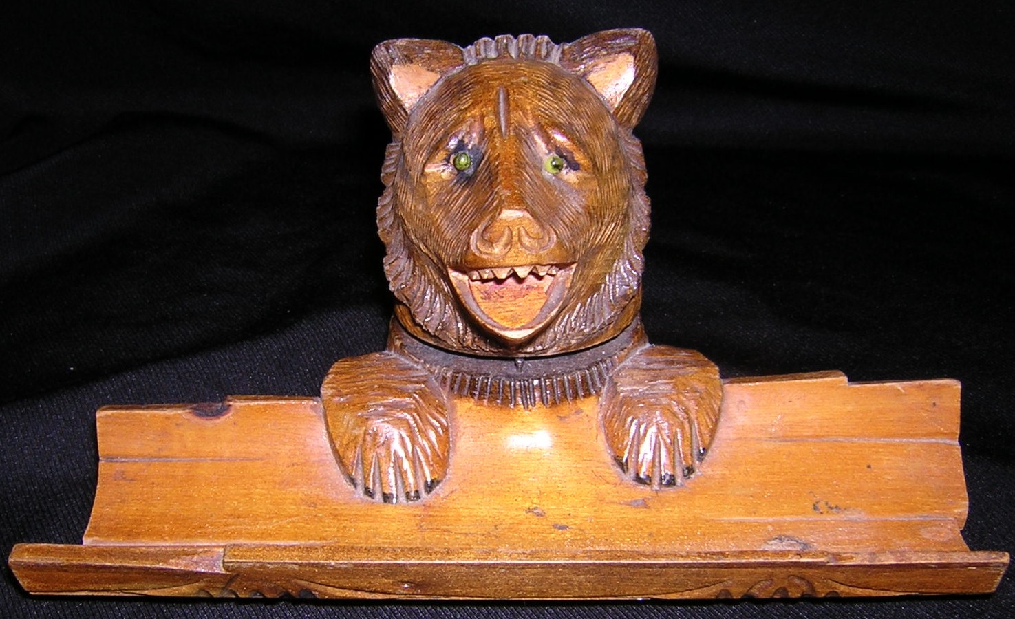 Carved Black Forest inkwell in the shape of a bear’s head peering over a hollowed-out log (pen tray). His head is hinged to allow access to the inkpot. He has small glass eyes and a painted mouth.