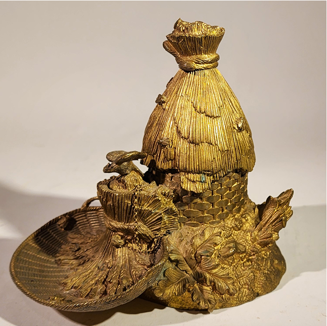 Rare patent mechanical (pump) inkwell shaped as a beehive with bees around. The tray in front is adorned with wheat/hay & top with a well which is lined with ceramic and an eagle perched on top as a stopper. The ceramic weight pushes the ink to the well by turning the top. All in guilded bronze with ceramic inside.