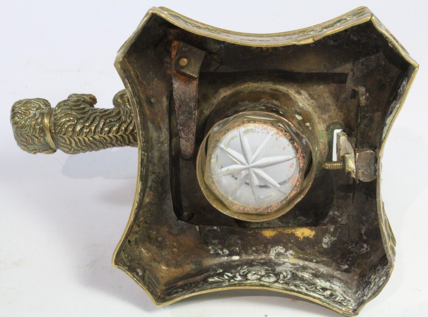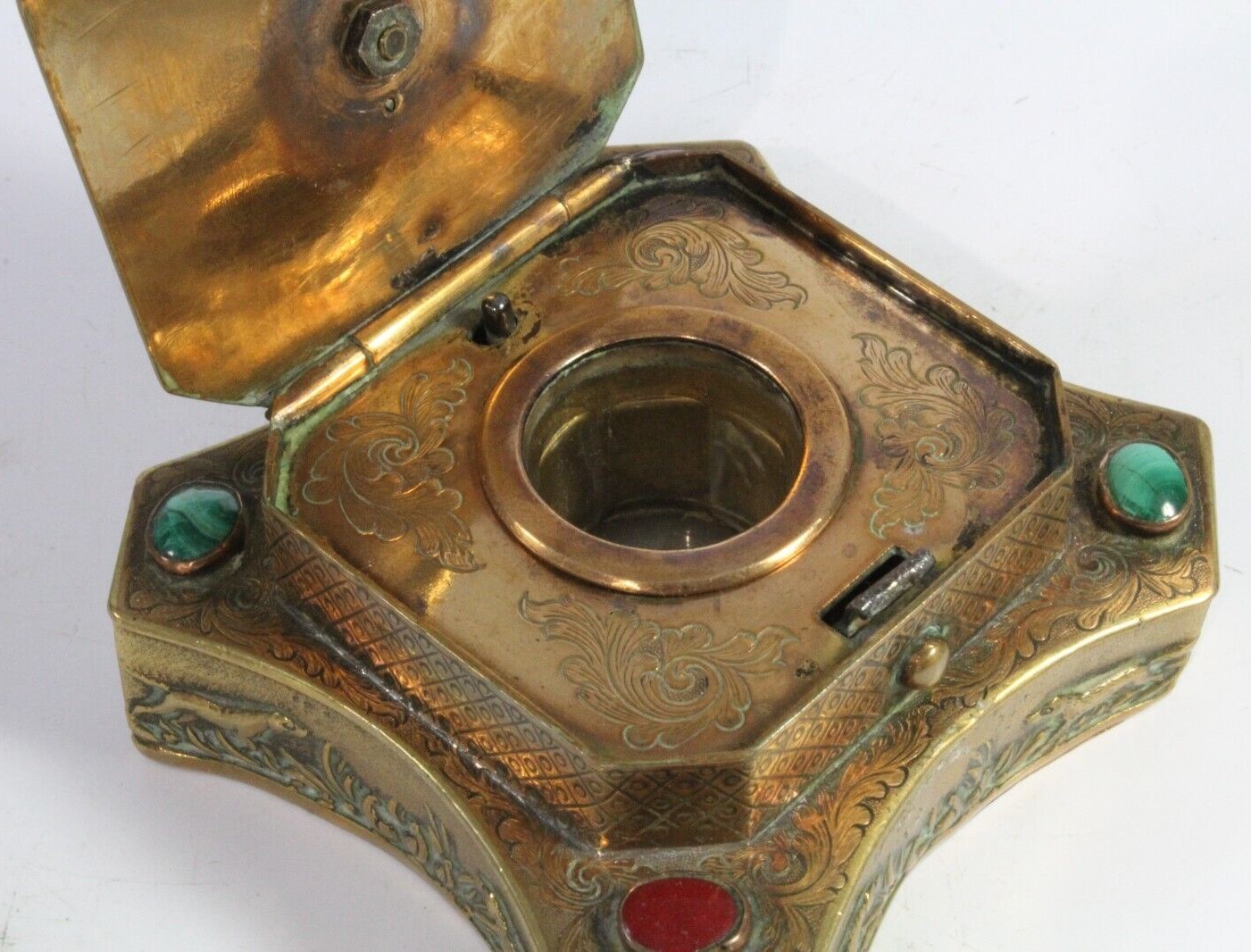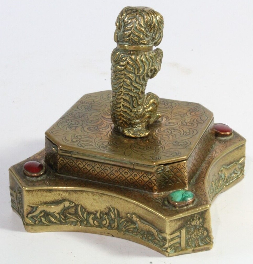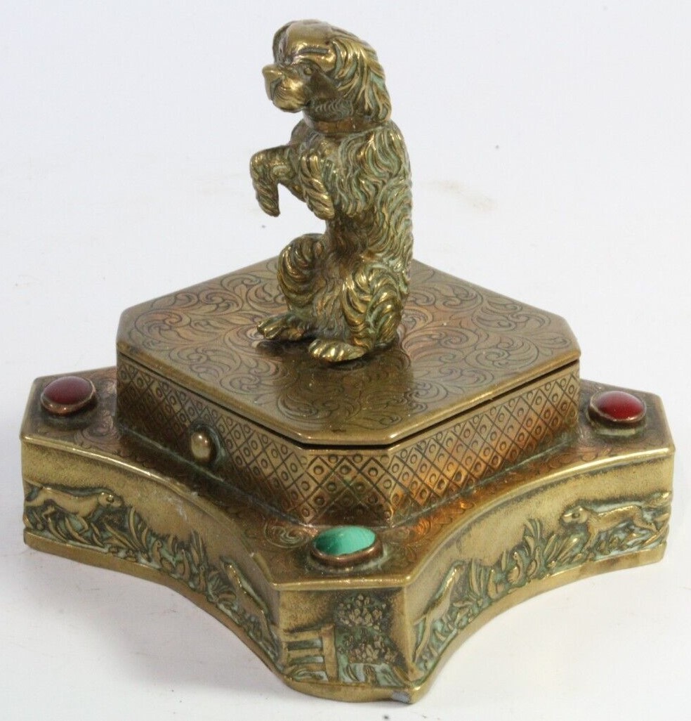 A gilded brass inkstand mounted with a begging spaniel. Engraved on the base surround are dogs, plants, and fencing. The inkstand is set with malachite and jasper cabochons. There is a push-button latch to open the lid to access the inkwell.