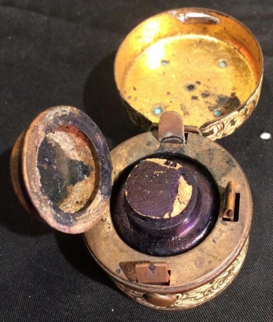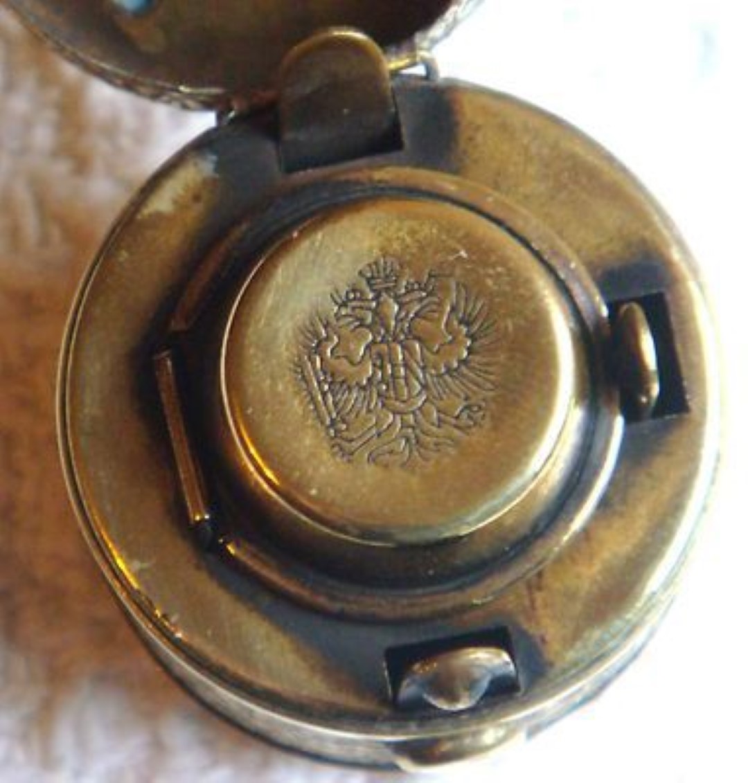 A tiny traveling inkwell with floral embossed brass casing allover, and embellished with four turquoise cabochons and a ruby glass centerpiece on the top of the lid. Press the button and the outer lid flips up. Release the inner catch and the inkwell lid flips up. There is a double headed eagle emblem engraved on the inner lid.