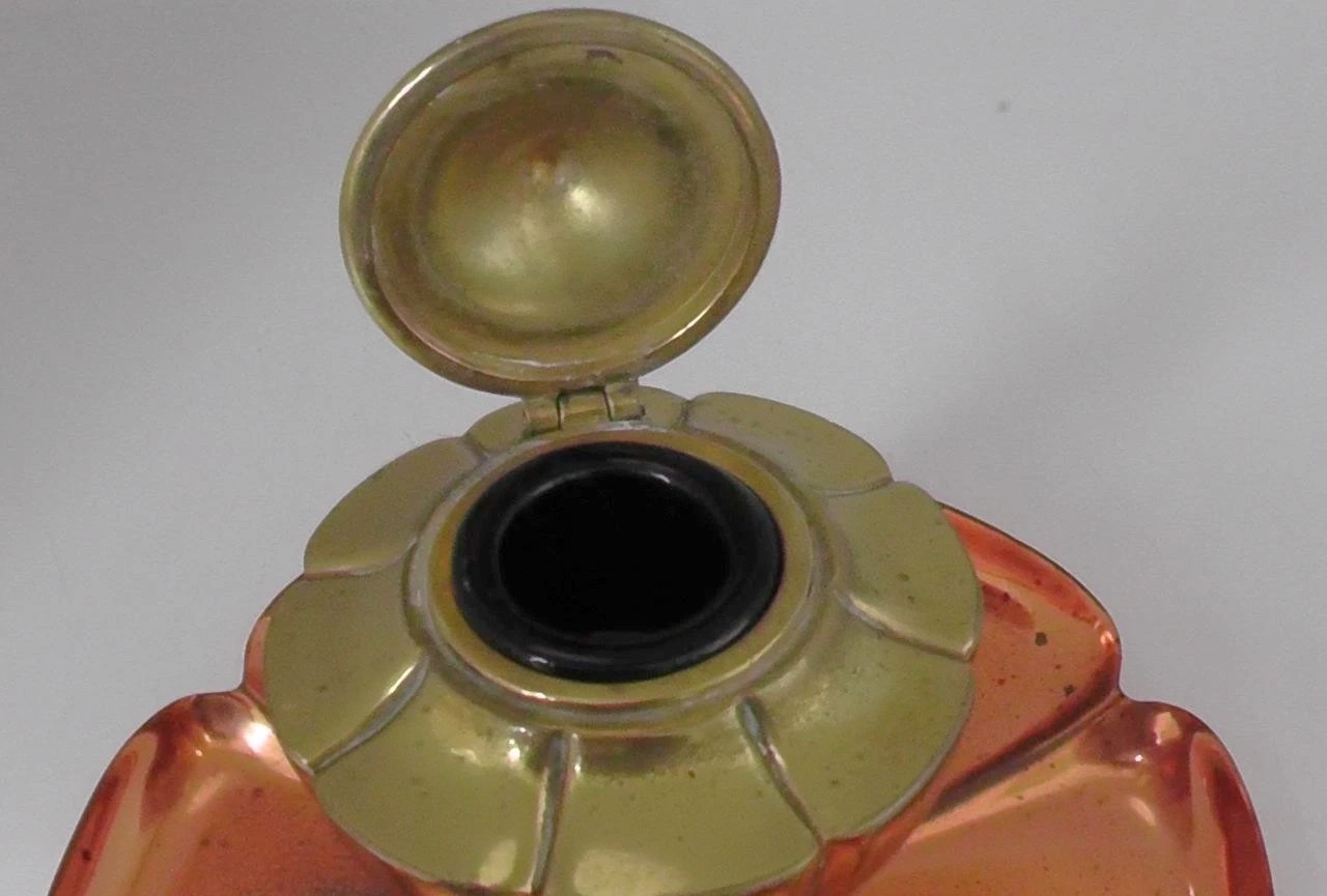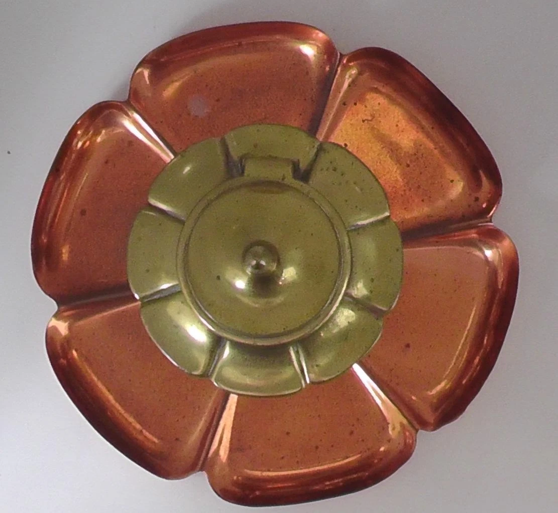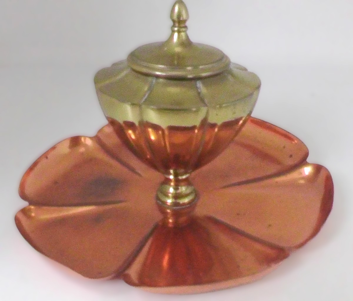 - The Base: A warm copper tray fashioned in a six-petaled floral motif, resembling a lotus or poppy. The “petals” are slightly concave, which would have served as a convenient resting place for a dip pen or writing supplies.