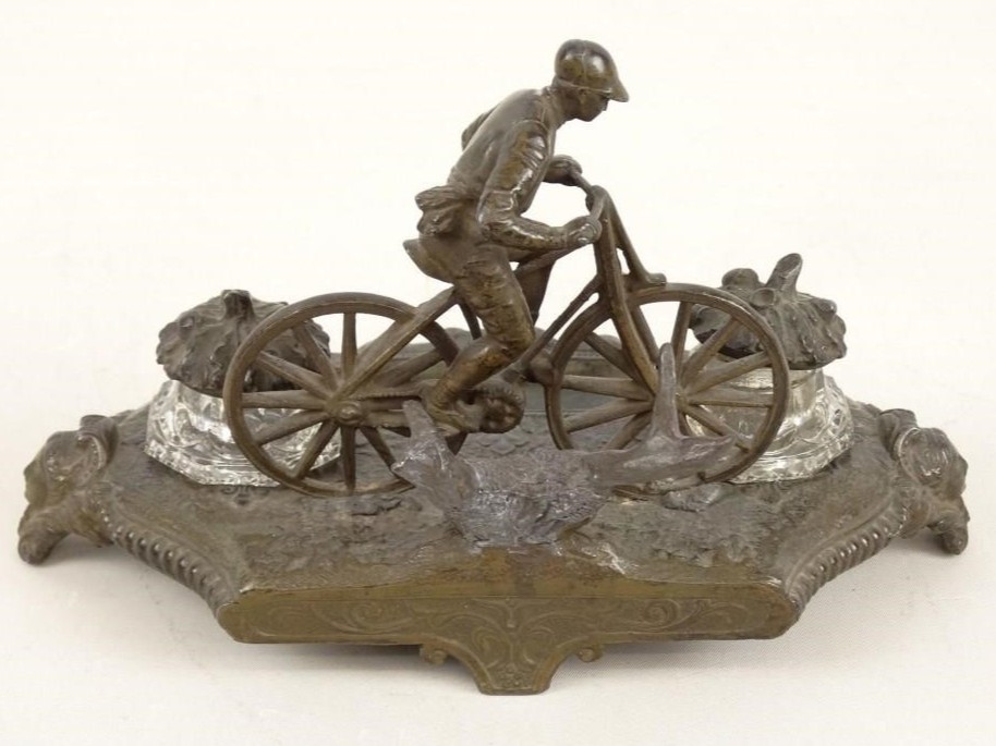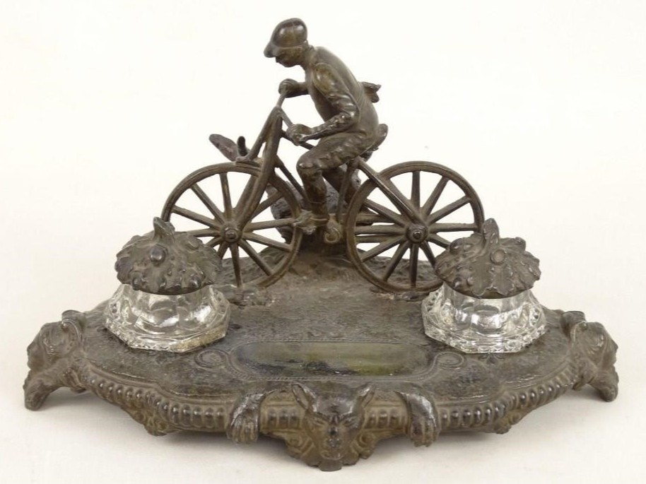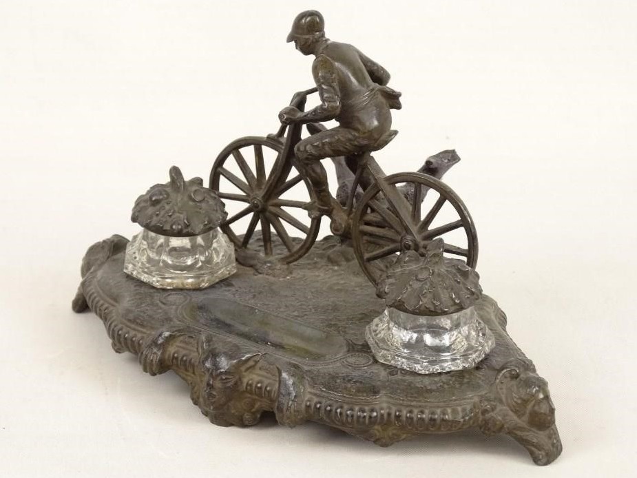 - The Inkwells: Flanking the cyclist are two clear glass inkwells. The metal lids are cast in the shape of acorns or oak leaves.