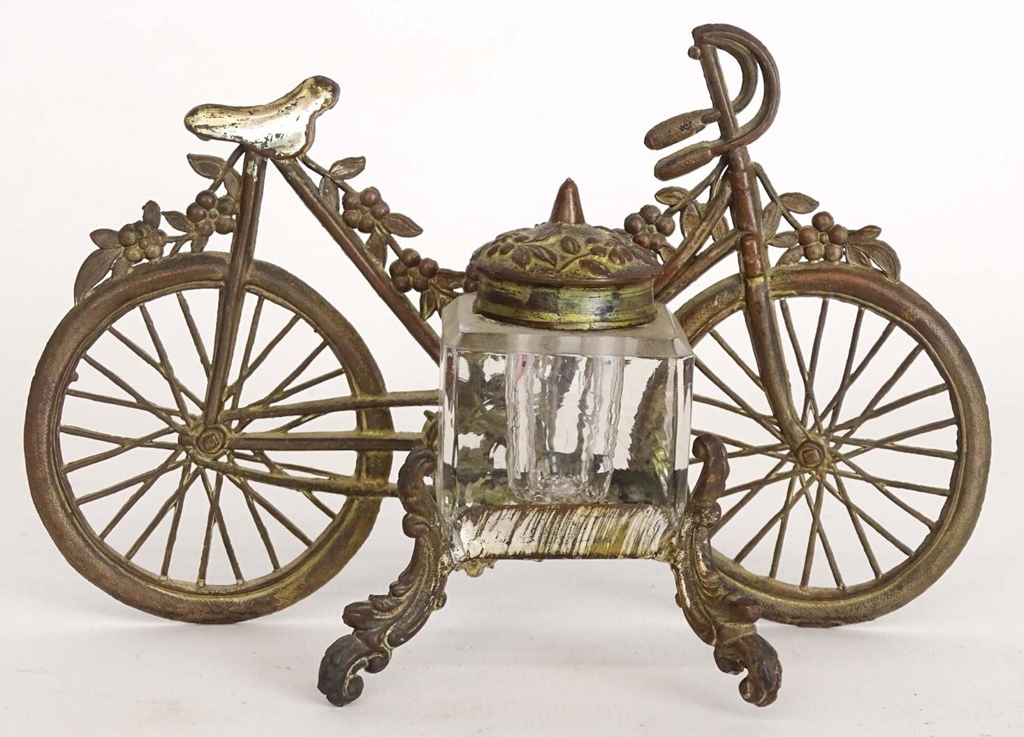 - The Inkwell: The central reservoir is a heavy, cubic clear glass insert with a stepped neck. It sits within an ornate four-legged metal stand with rococo-style scroll feet, which provides the stability needed for the narrow bicycle frame to stand upright on a desk.