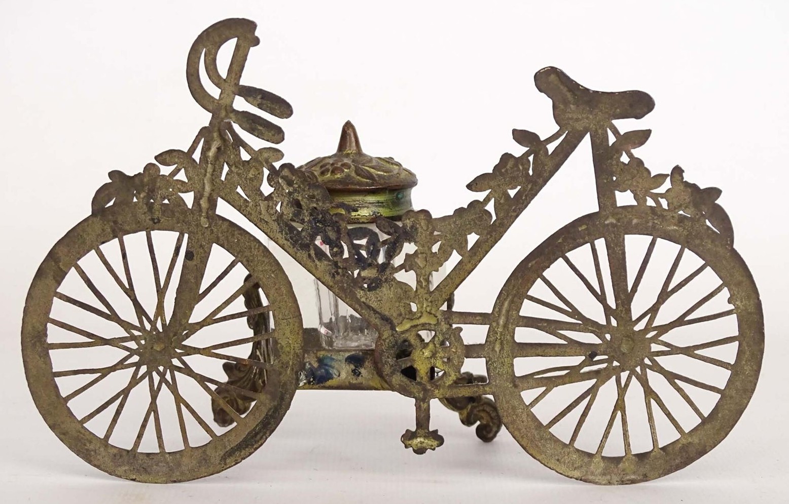 This is an ornate safety bicycle figural inkstand, dating to the peak of the “Bicycle Craze” in the late 19th century, approximately 1890–1895.
