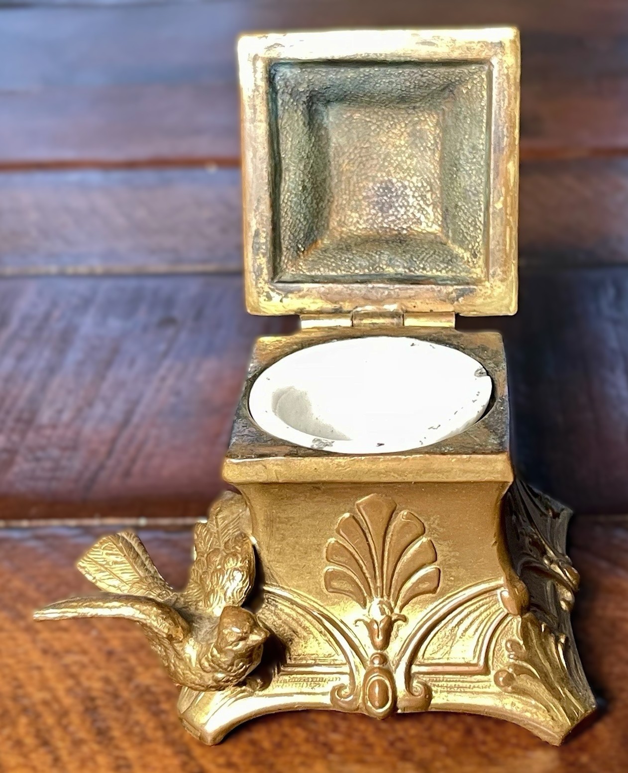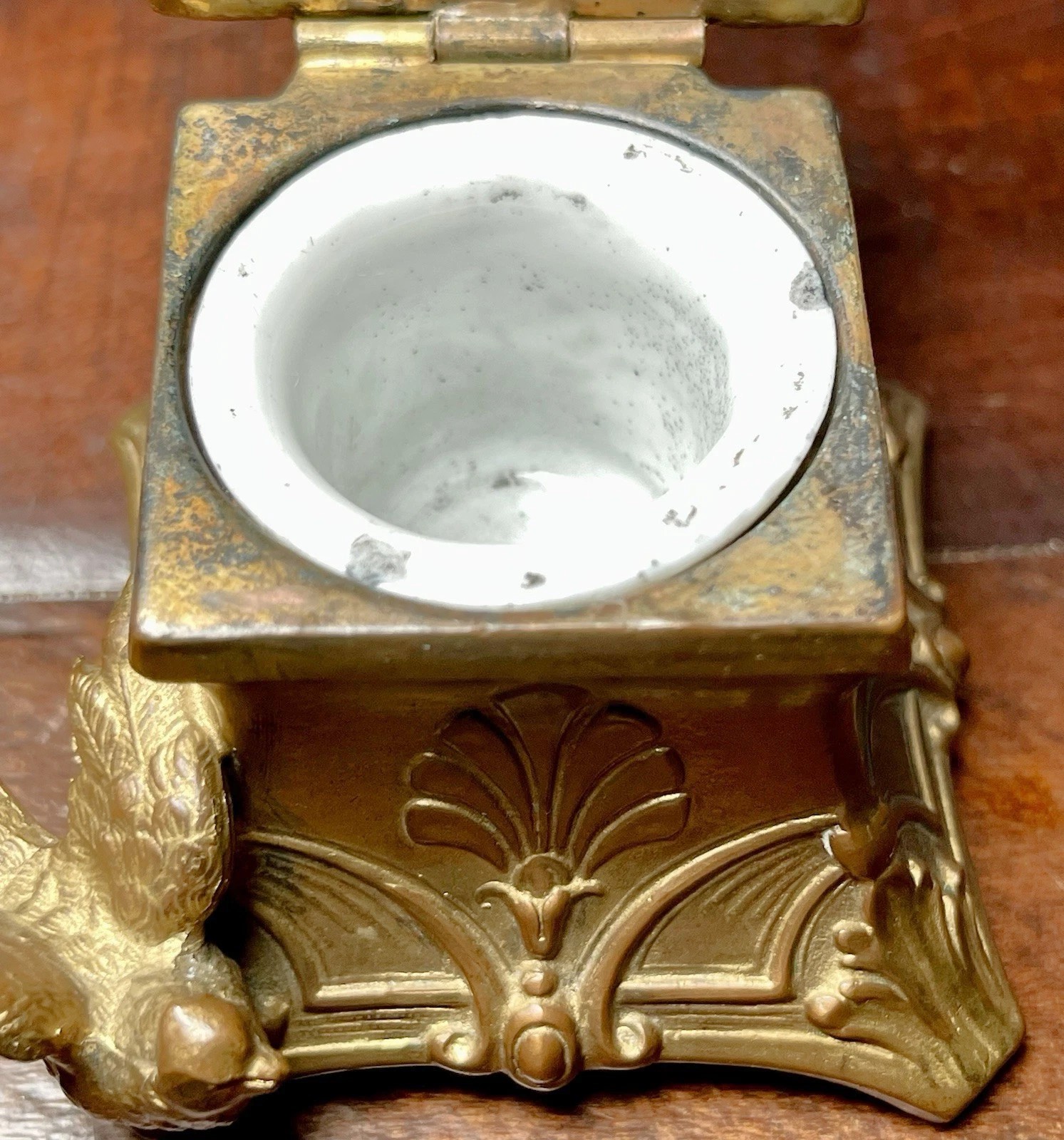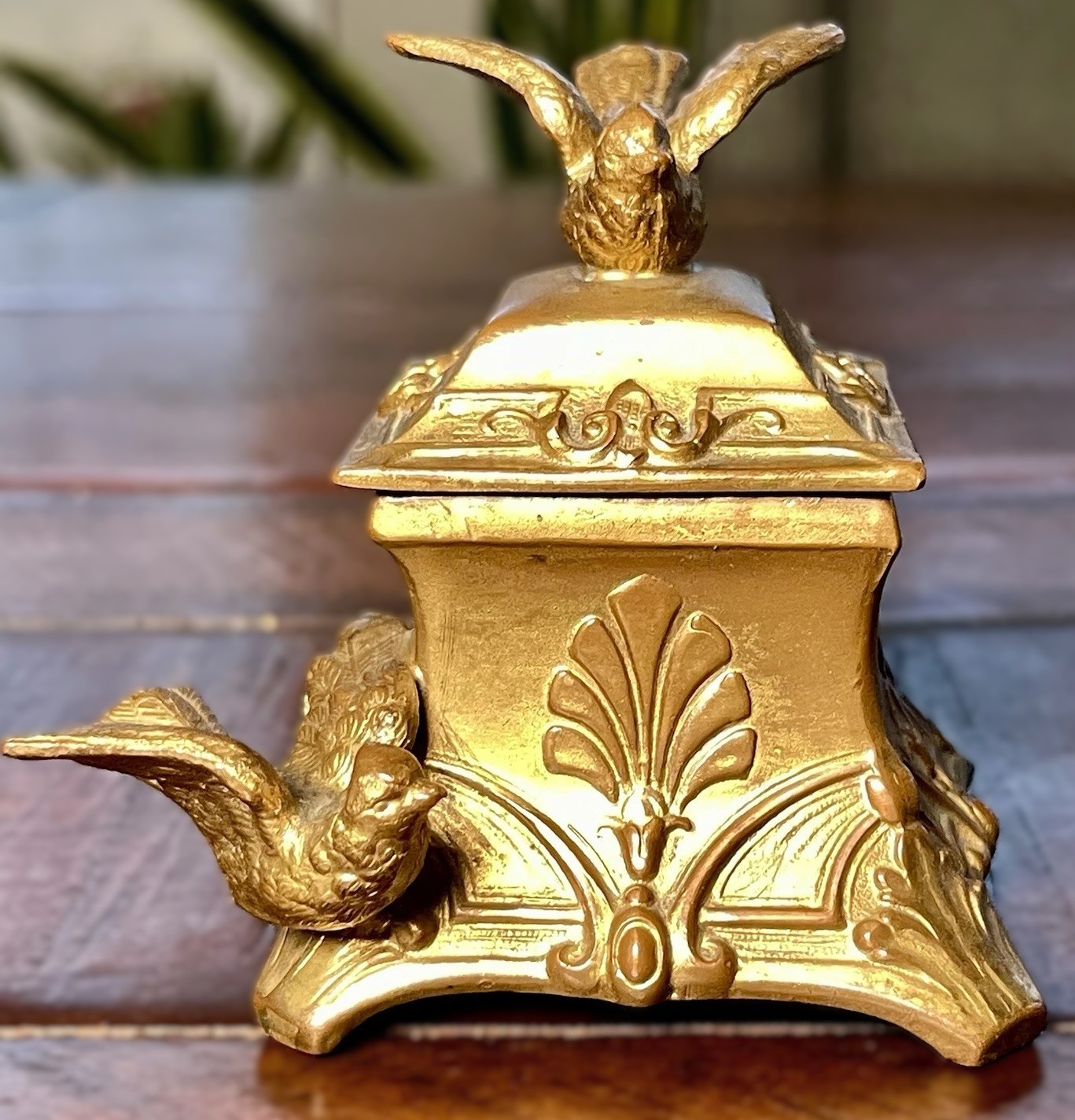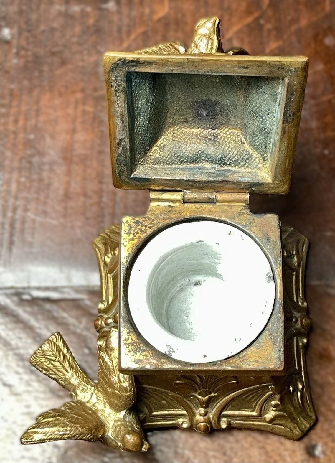 This inkwell, made of gilded spelter metal, features two sculpted birds. One bird is perched on the lid of the inkwell while the other bird is positioned on the base. The inkwell itself is detailed with leaf-like patterns and flowing curved lines.