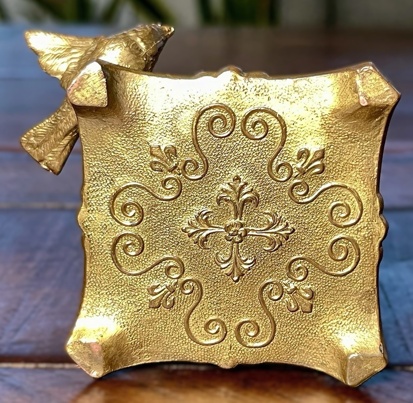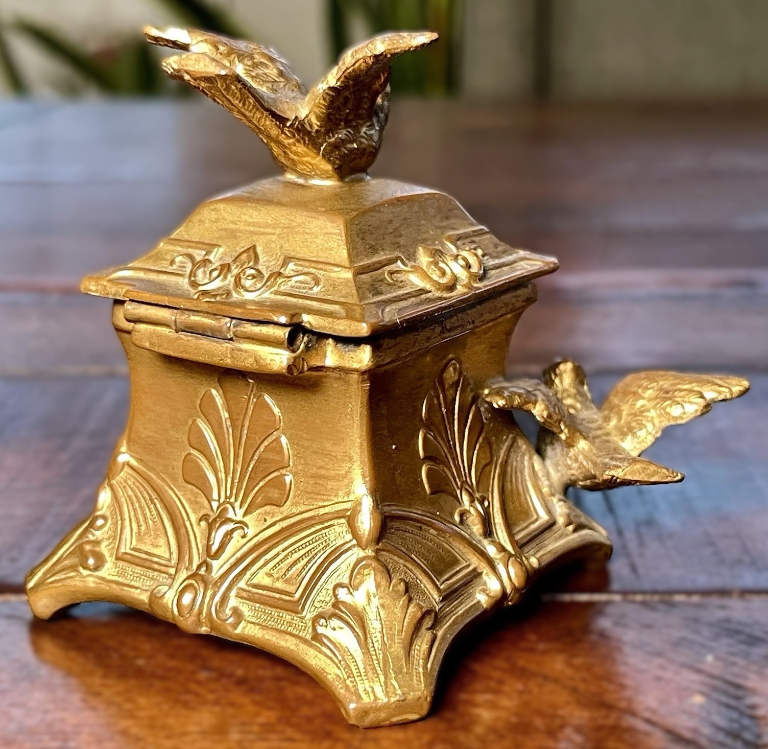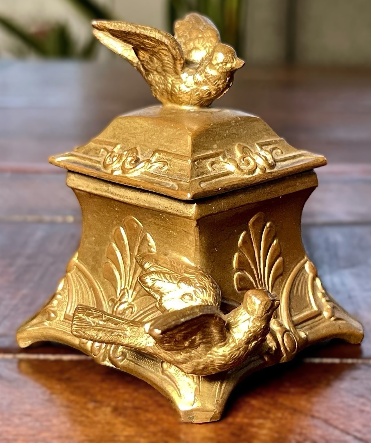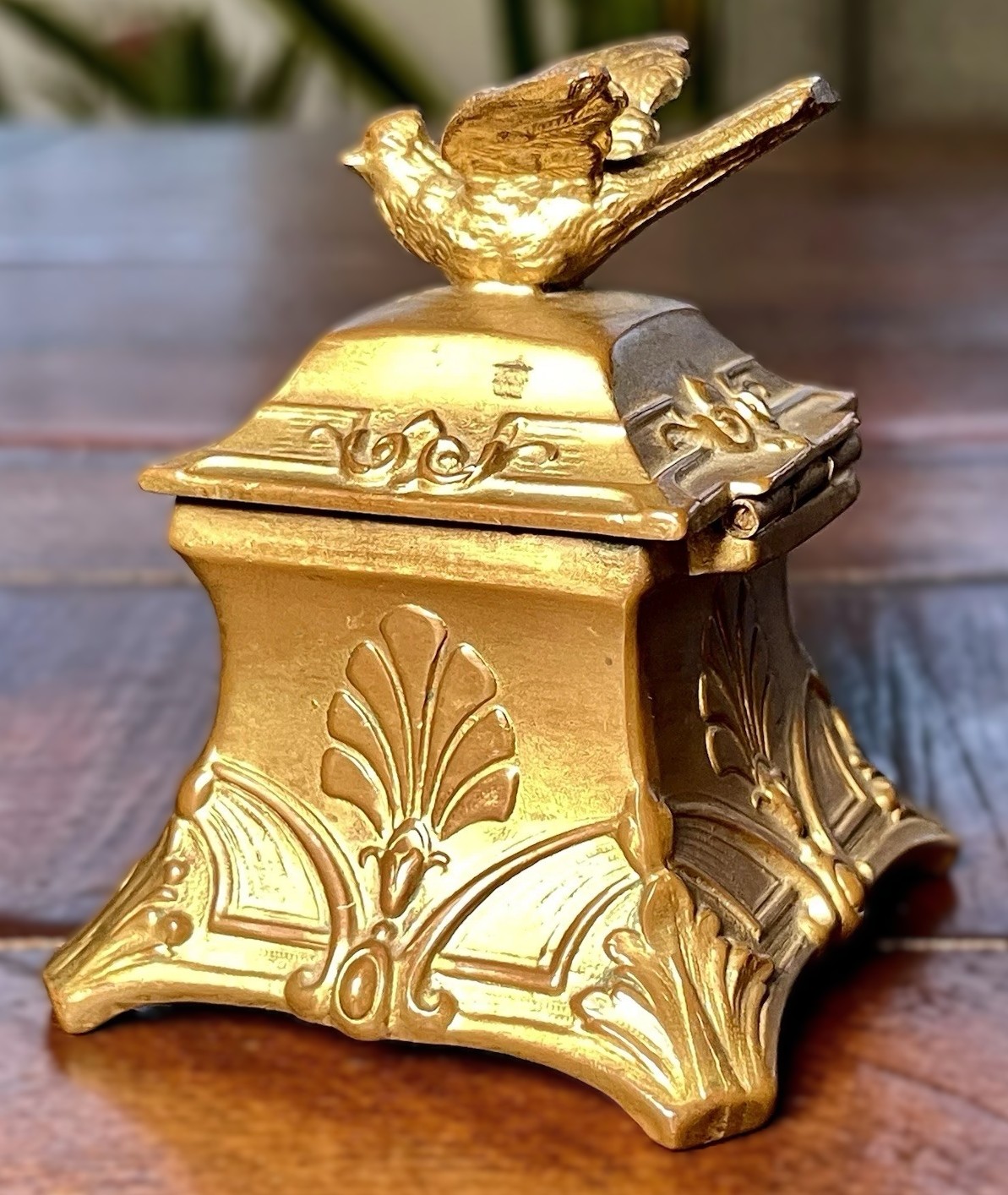 This inkwell, made of gilded spelter metal, features two sculpted birds. One bird is perched on the lid of the inkwell while the other bird is positioned on the base. The inkwell itself is detailed with leaf-like patterns and flowing curved lines.