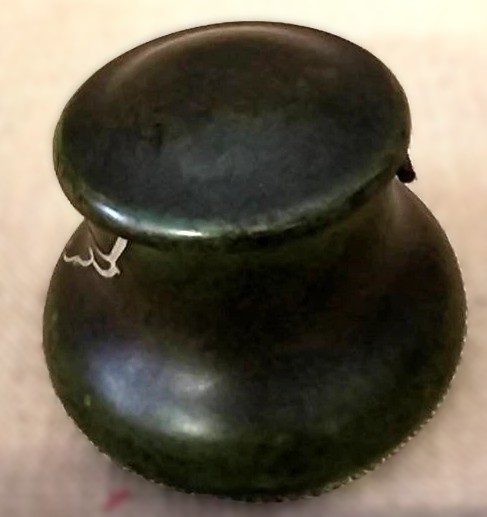 - Form and Material: The body of the inkwell is round and slopes inward towards the top. It is made of bronze with a dark, green “Verde” patina, which provides a nice contrast to the silver overlay.