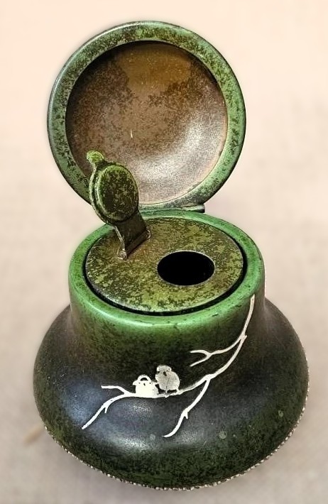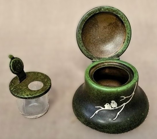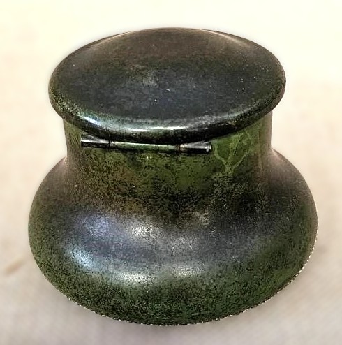 This is an inkwell from the Heintz Art Metal Shop with a distinctive “Verde” green patina finish and sterling silver overlay.