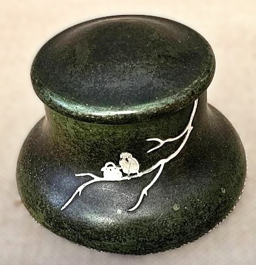 - Design: The sides of the inkwell feature a decorative sterling silver overlay in the form of two small birds perched on a branch with leaves.