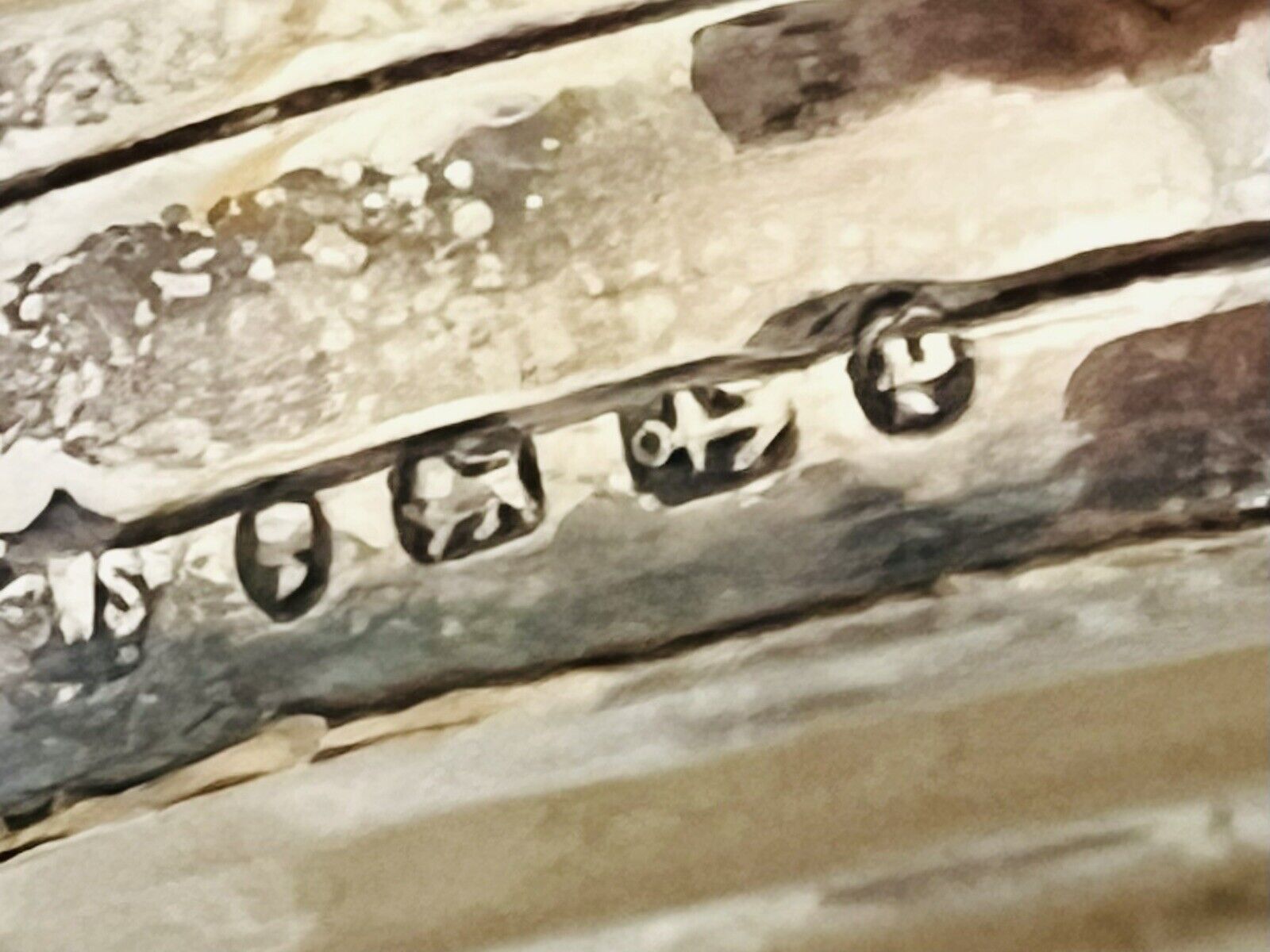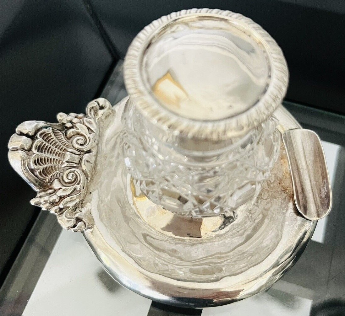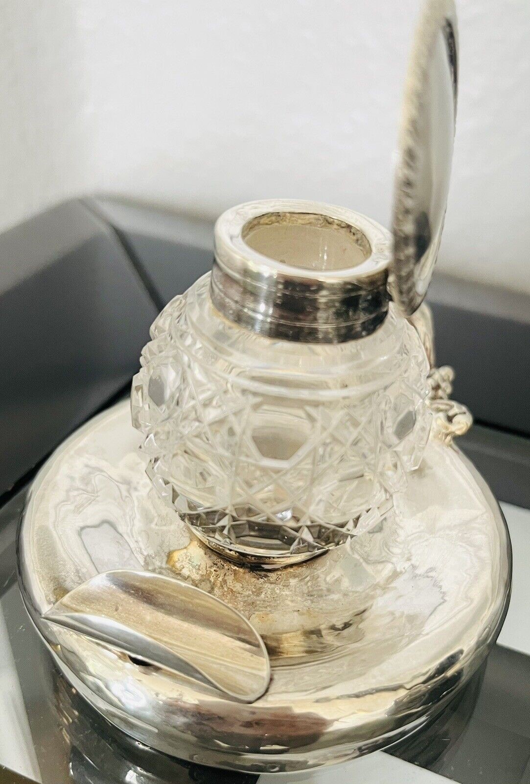 Cut crystal inkwell with sterling silver hinged lid marked for Birmingham circa 1889 resting on a silver base with handle and pen holder.