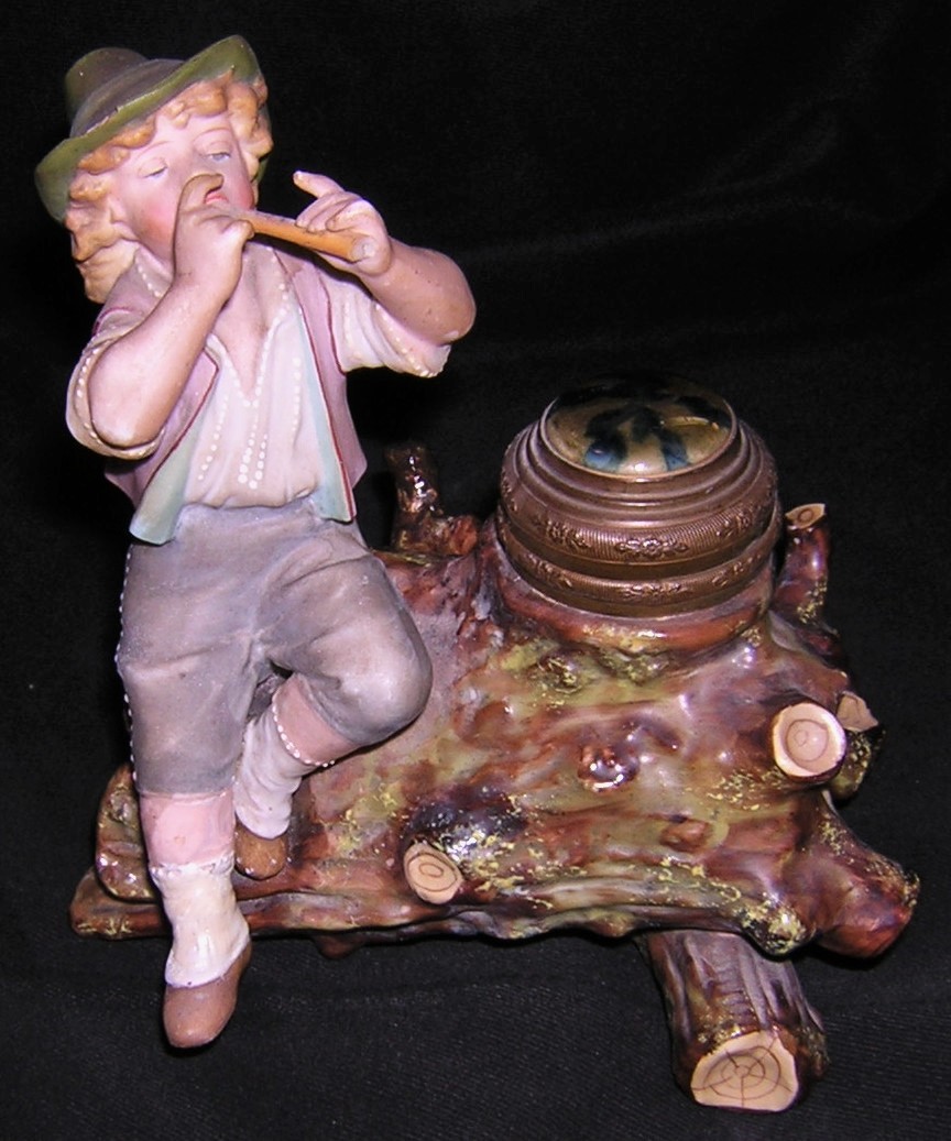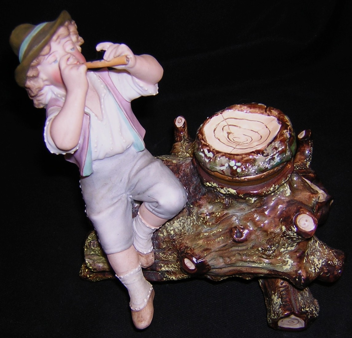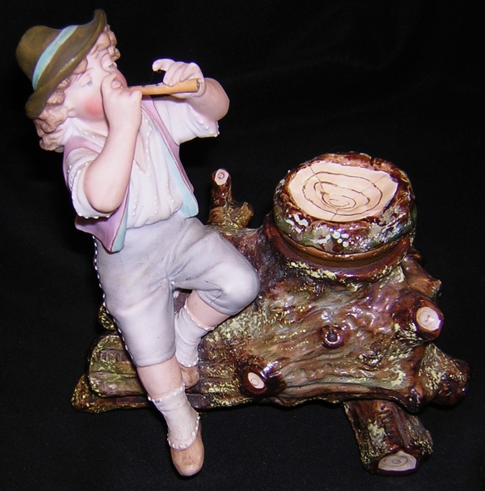 Porcelain boy figure in European peasant clothing playing the flute, hinged brass mount with polished stone top on one, porcelain lid on the second piece.