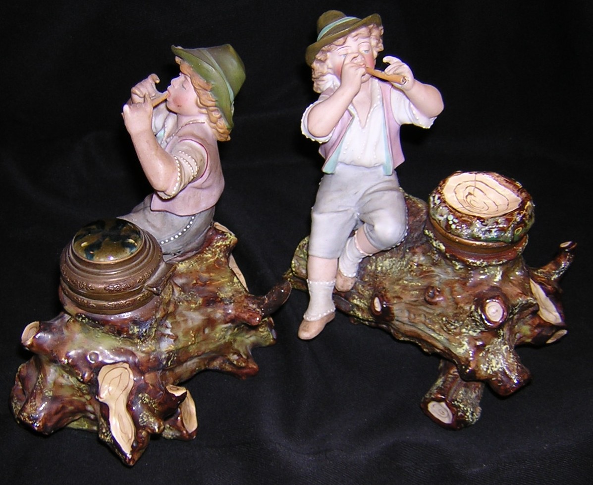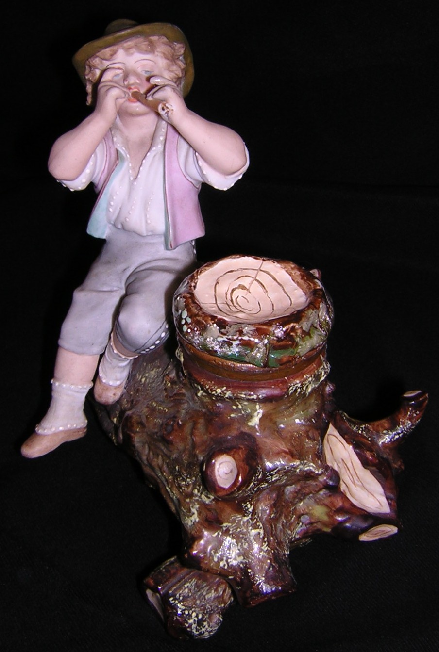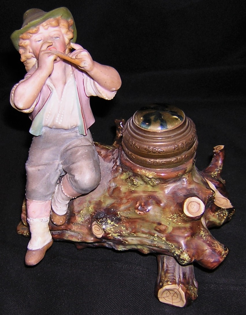 Porcelain boy figure in European peasant clothing playing the flute, hinged brass mount with polished stone top on one, porcelain lid on the second piece.