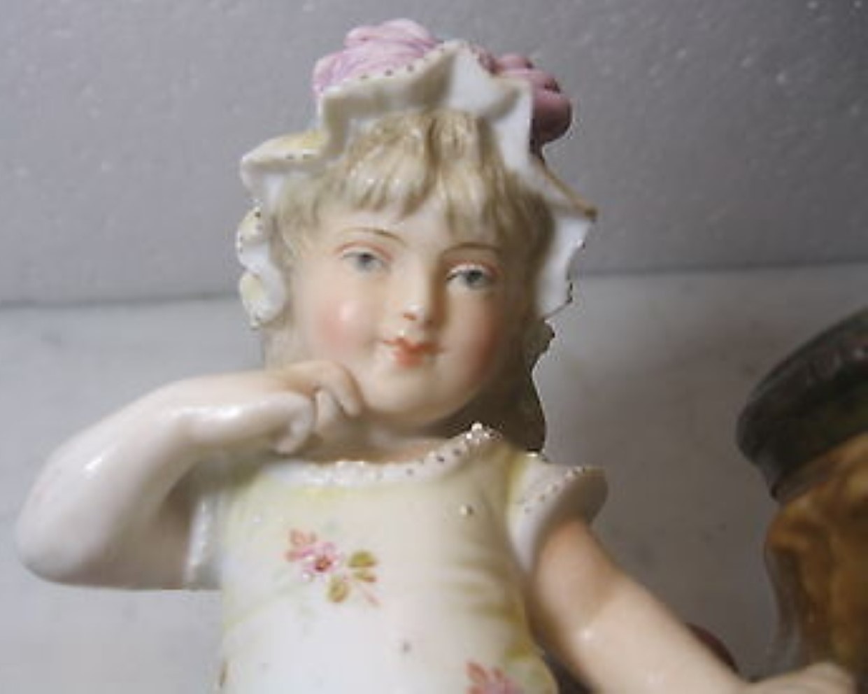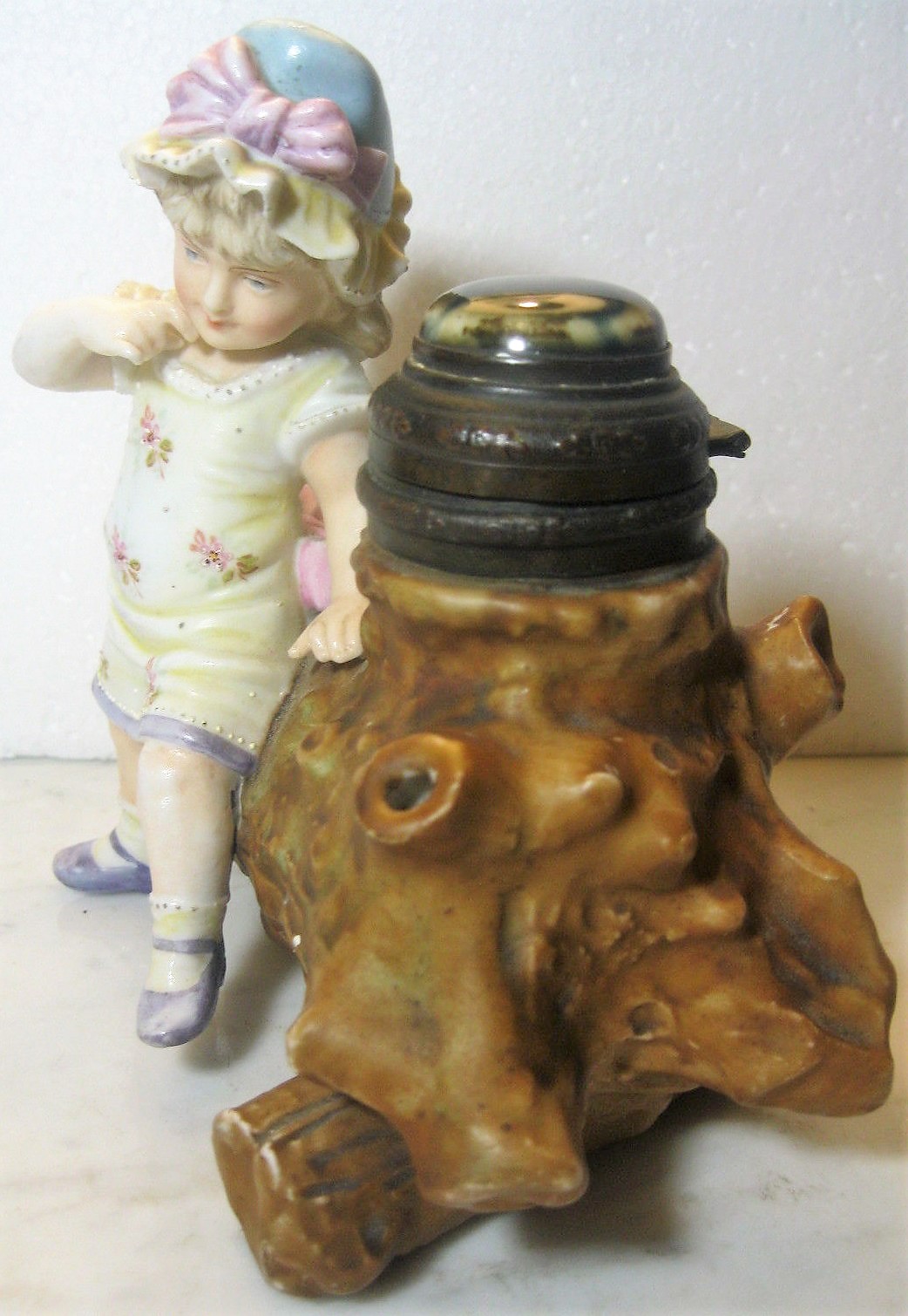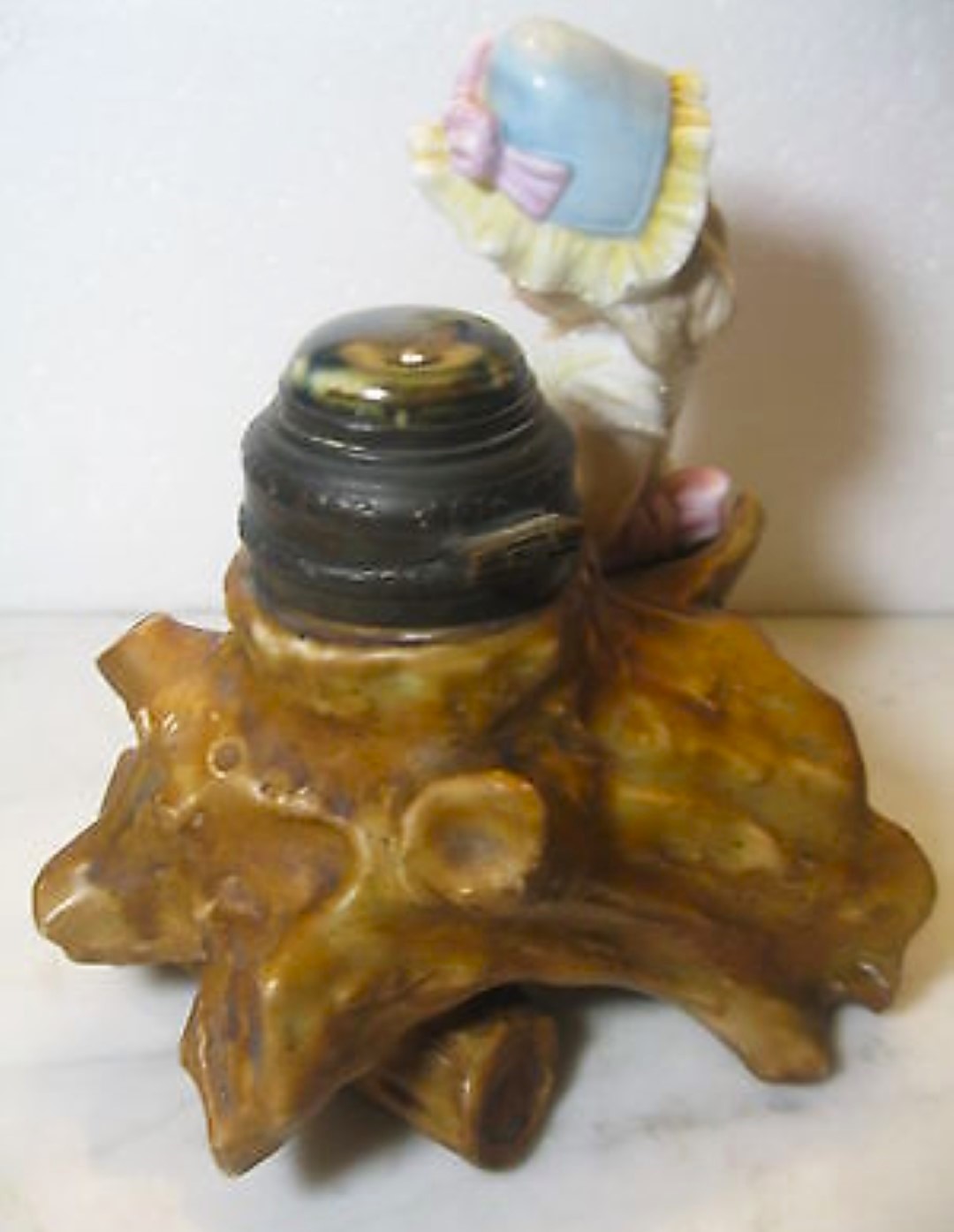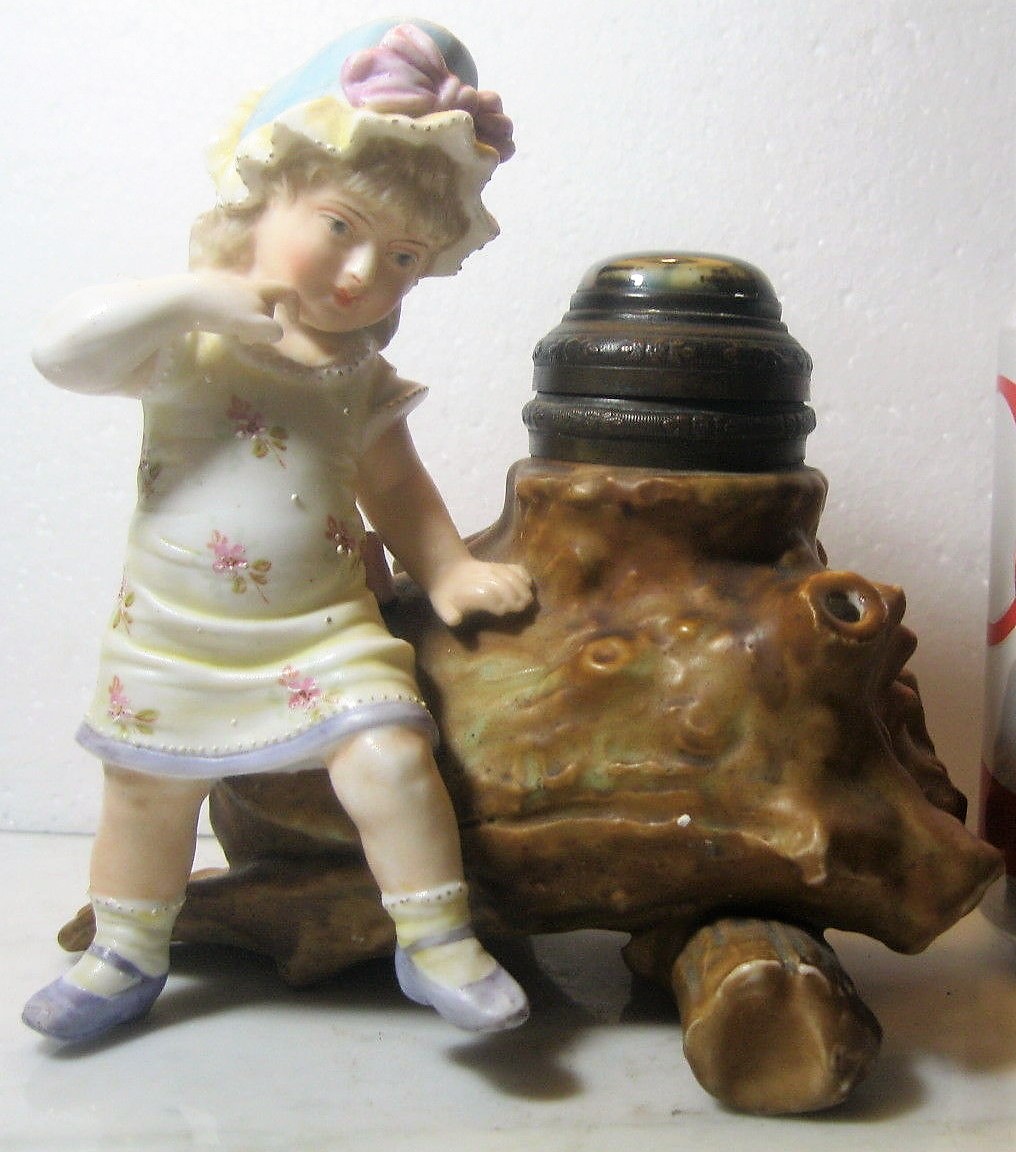 Porcelain girl figure in flowered dress and bonnet, hinged brass mount with polished stone top holds the inkwell.