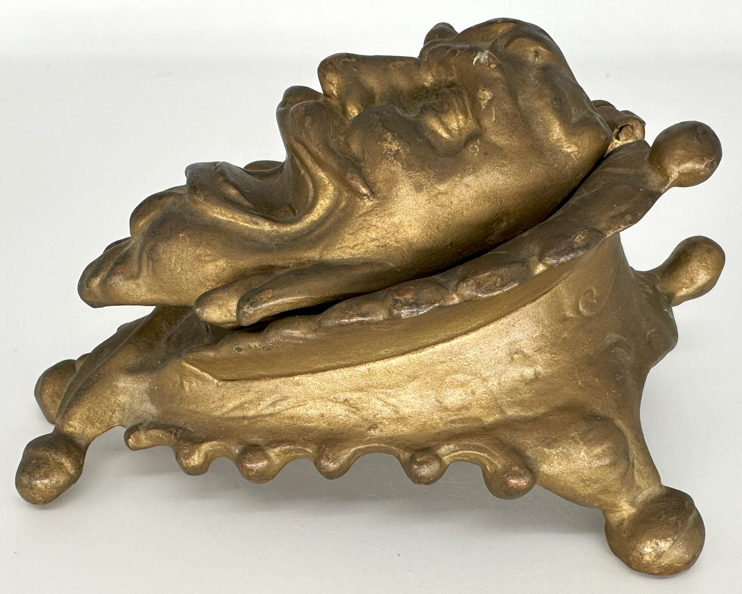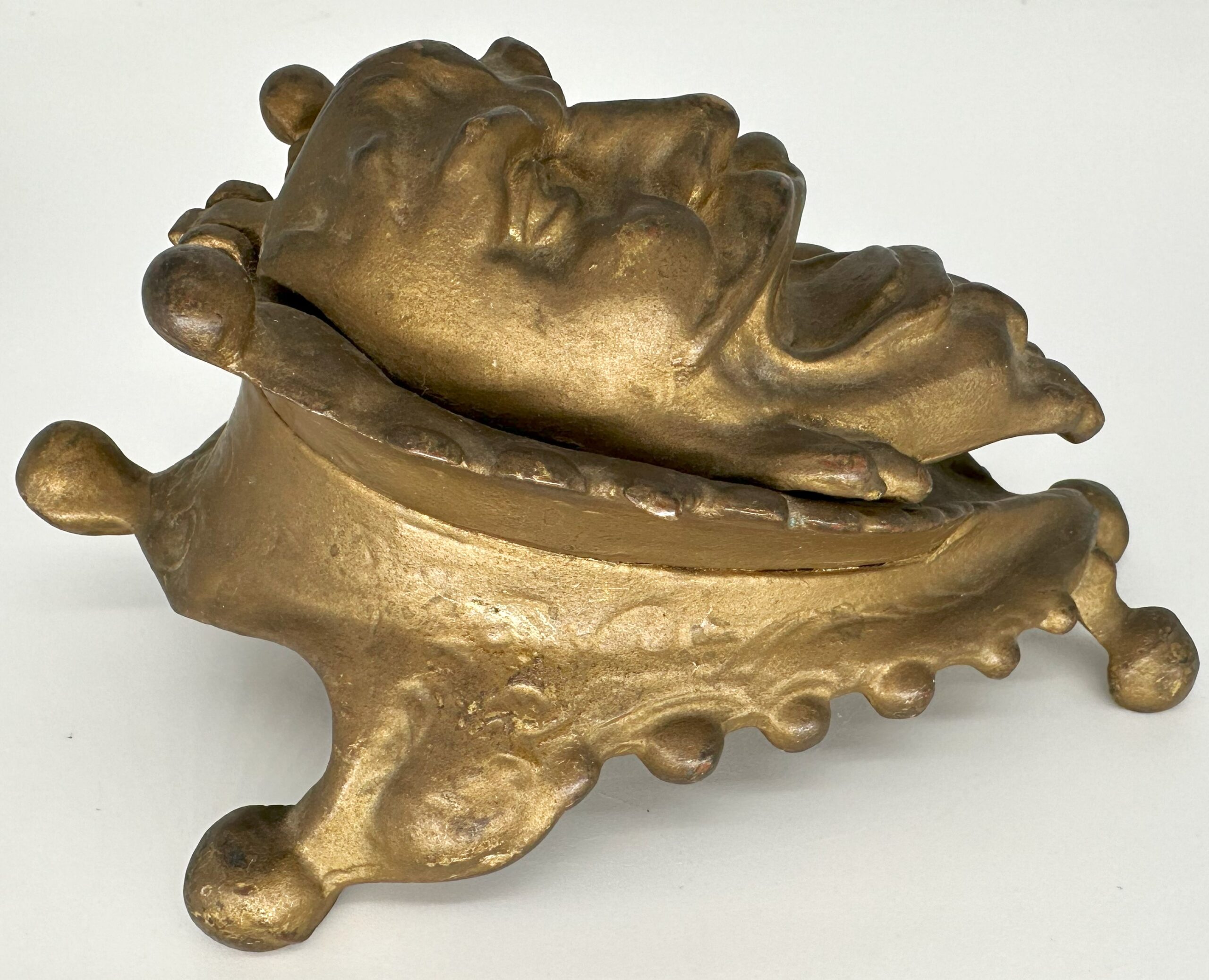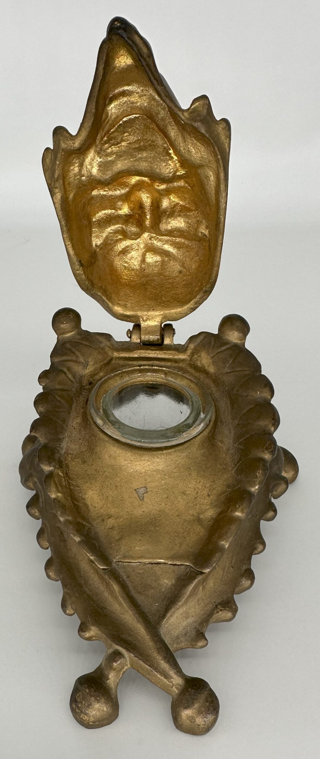 The bizarre face of a laughing man is framed with a scalloped collar that terminates in round balls. The lid is hinged at the top. With the pointed beard and the sinister look, could it be…Satan?