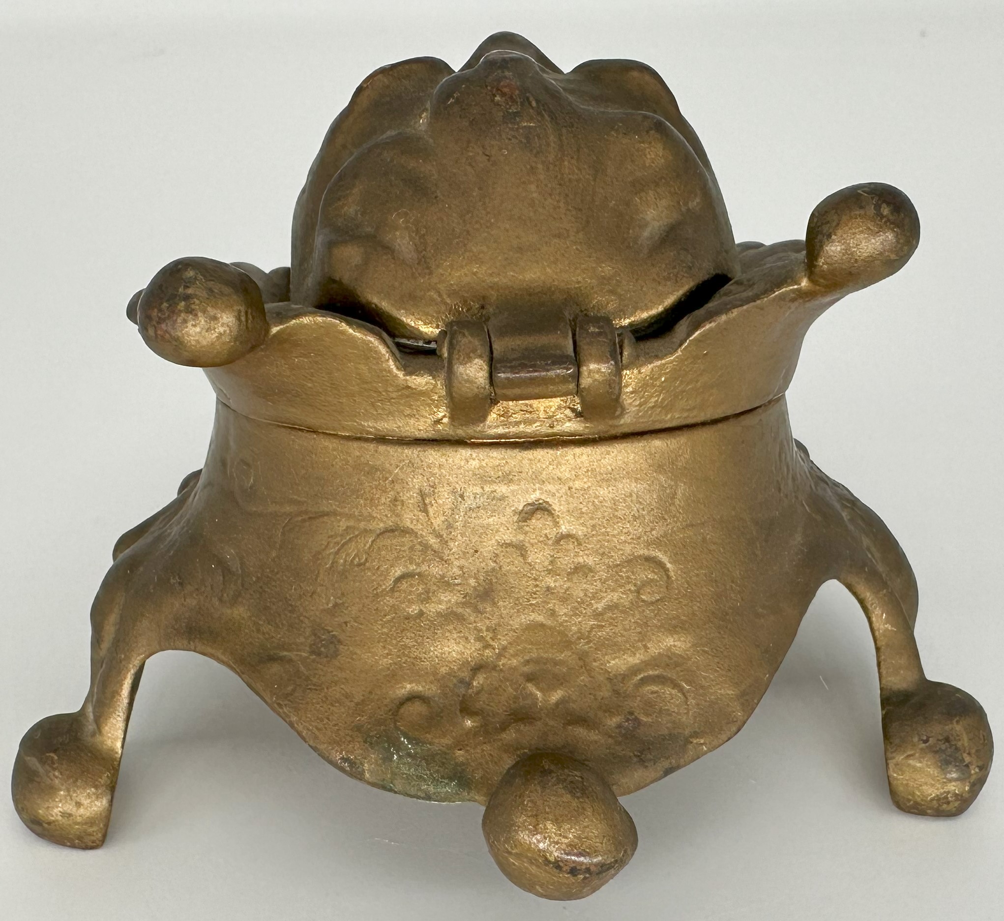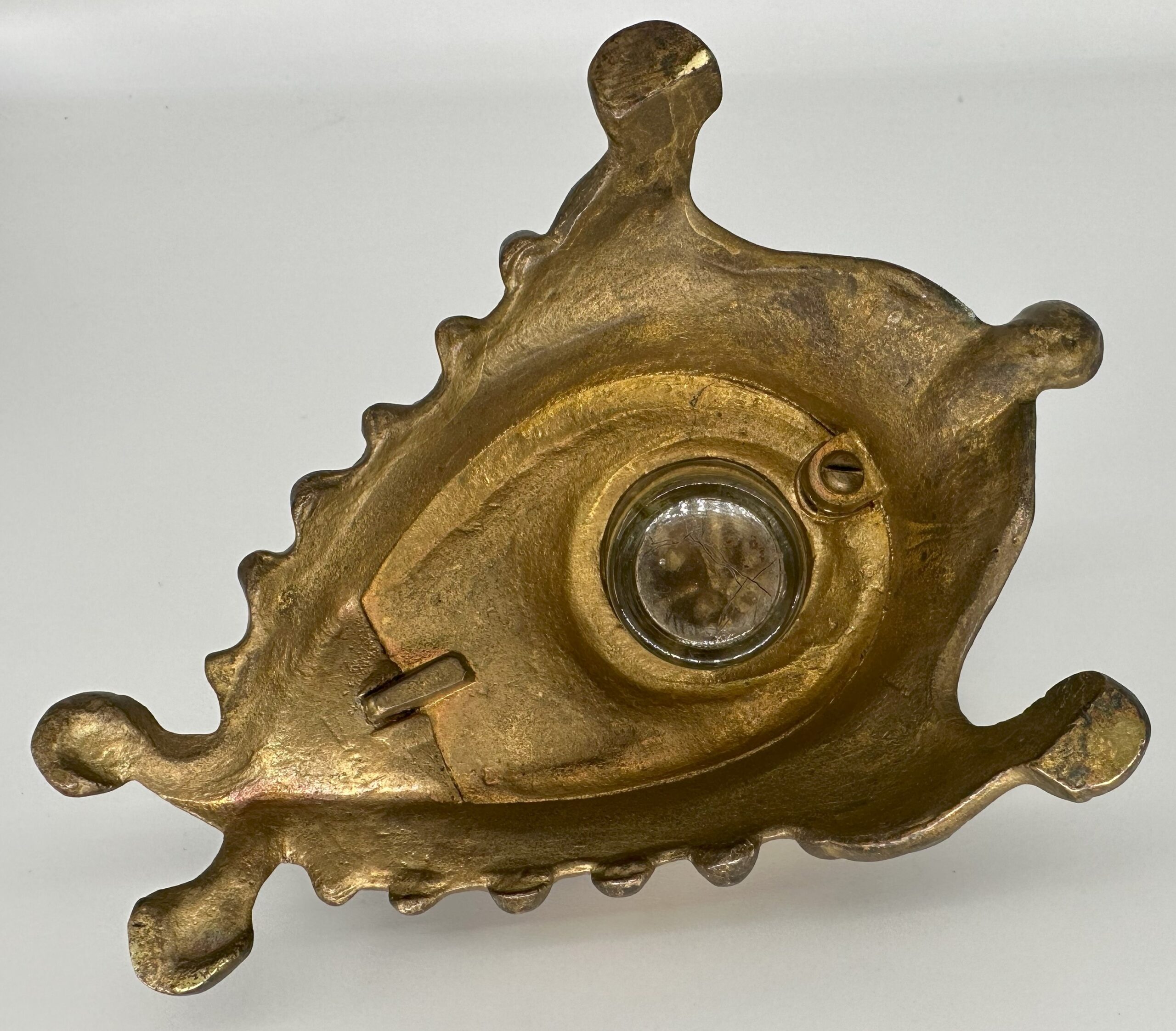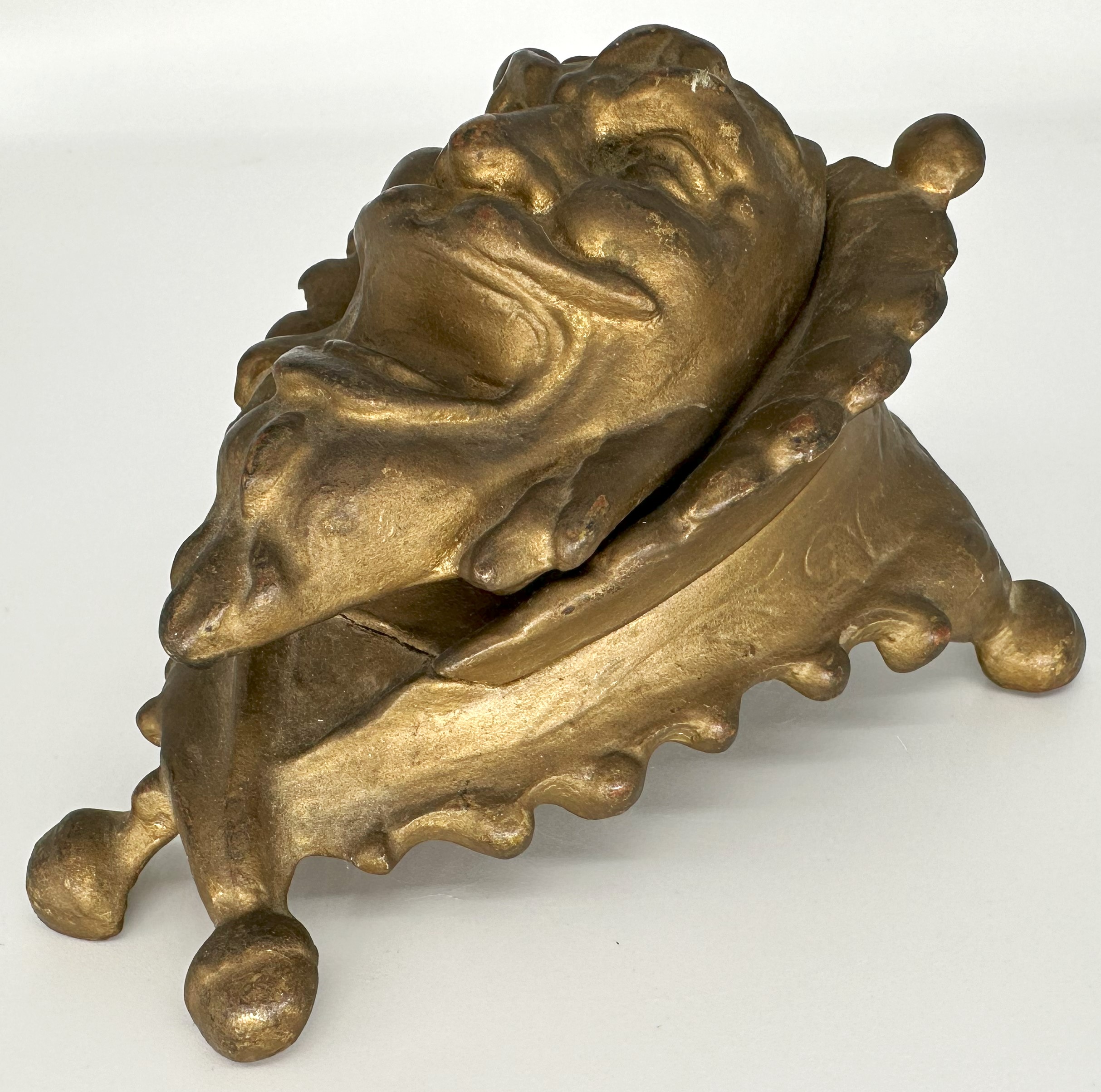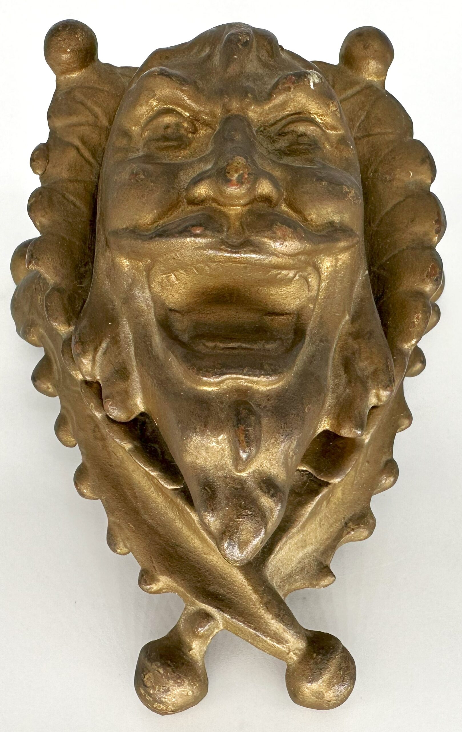 The bizarre face of a laughing man is framed with a scalloped collar that terminates in round balls. The lid is hinged at the top. With the pointed beard and the sinister look, could it be…Satan?