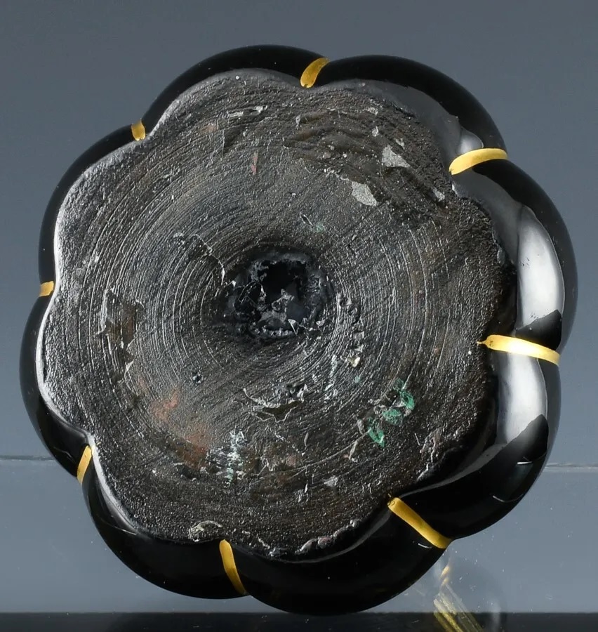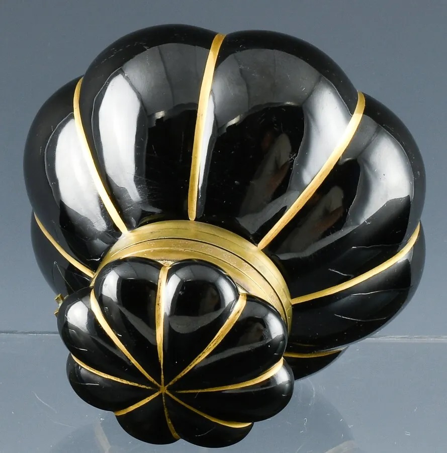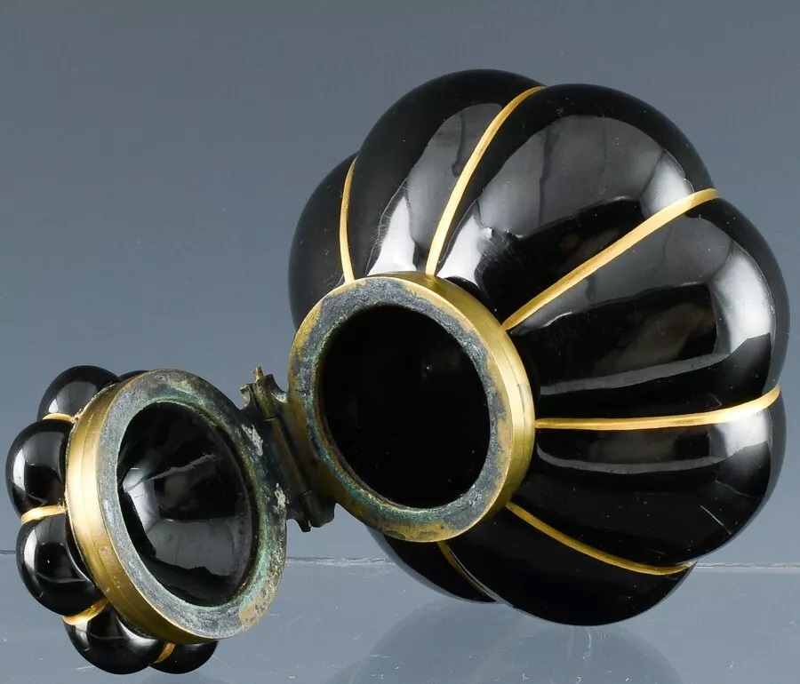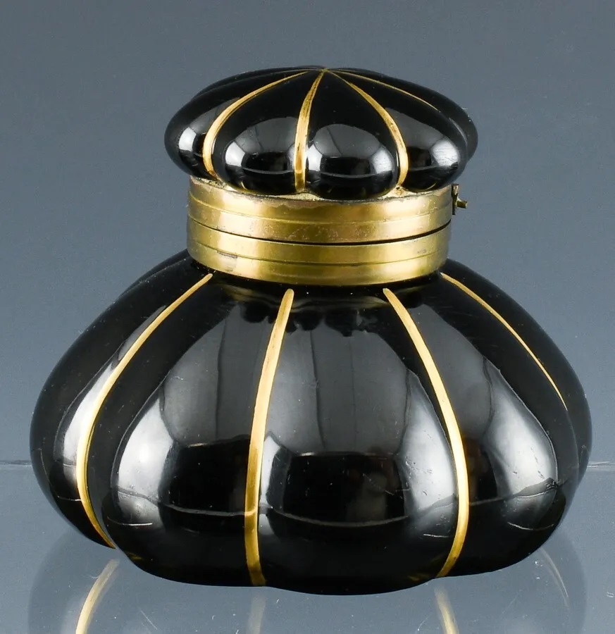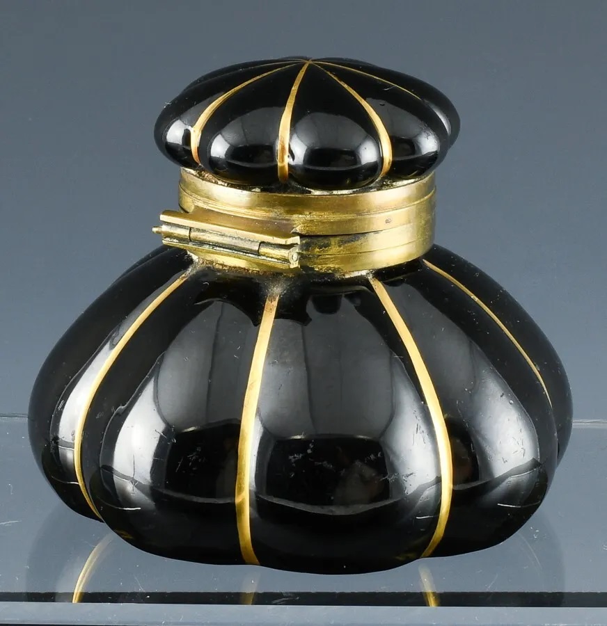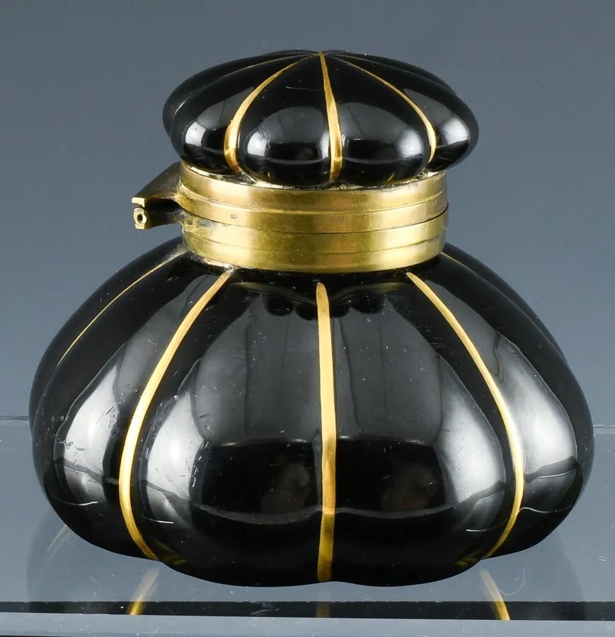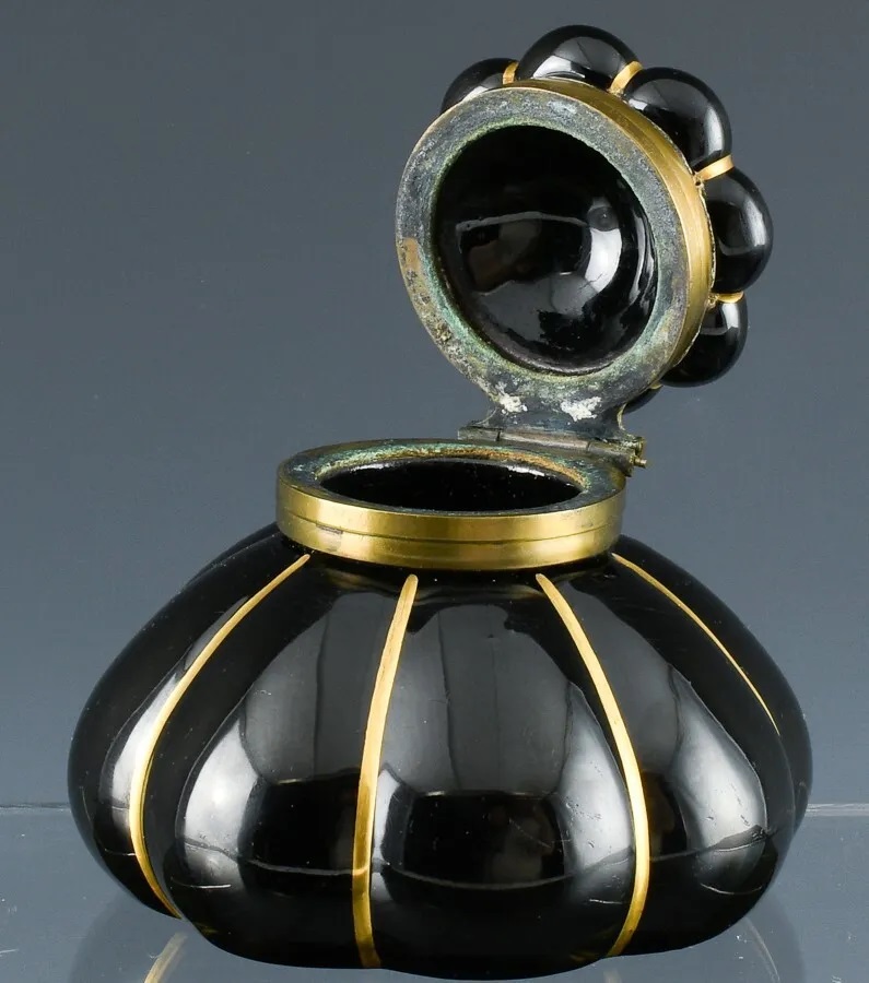 This inkwell crafted from black amethyst glass has a bulbous shape with striped golden accents. The matching lid is hinged and mounted with brass fittings.