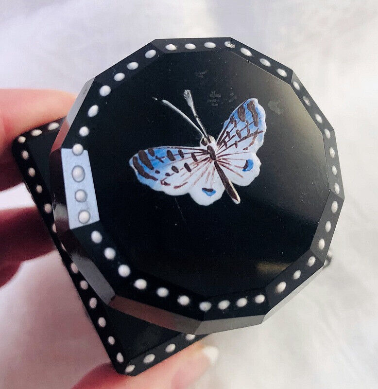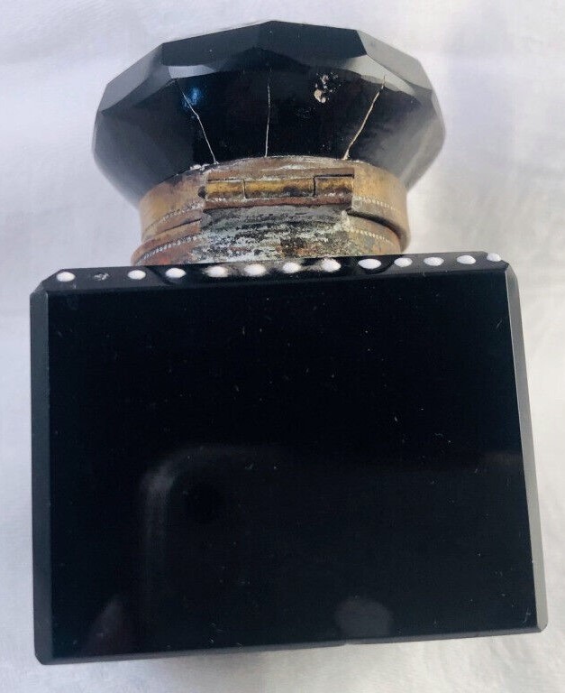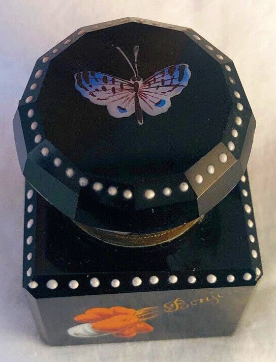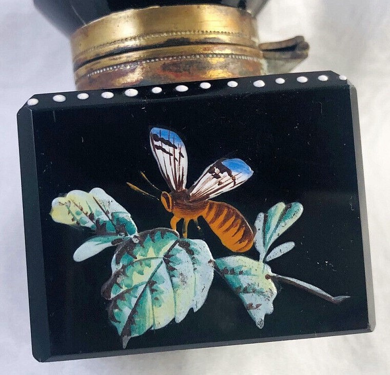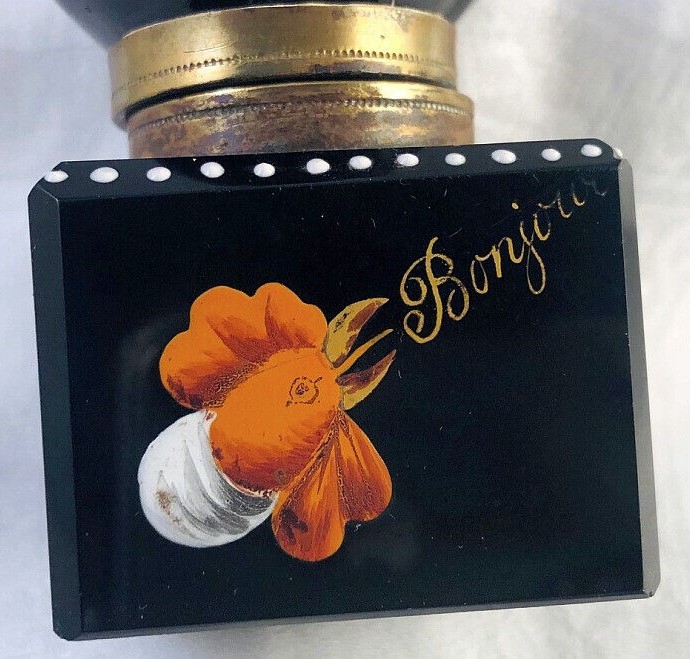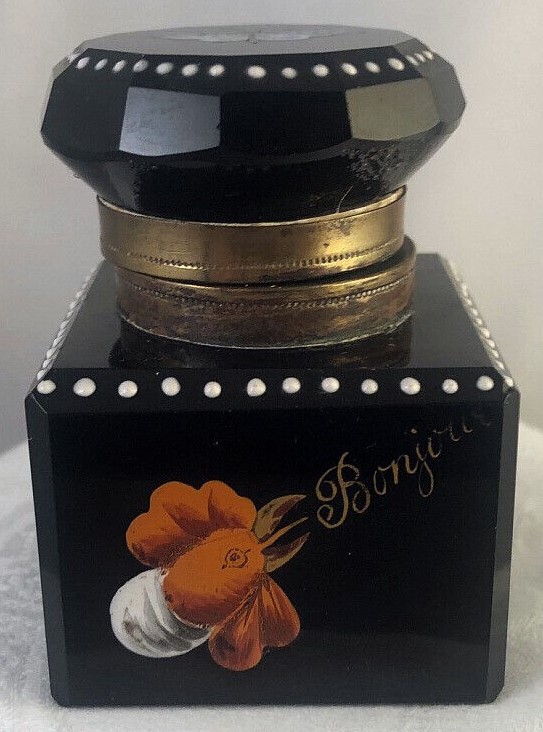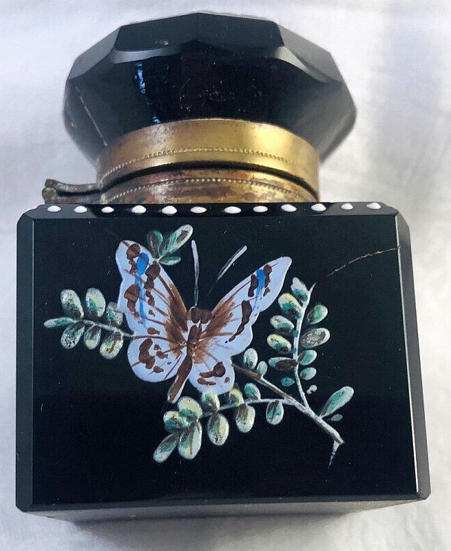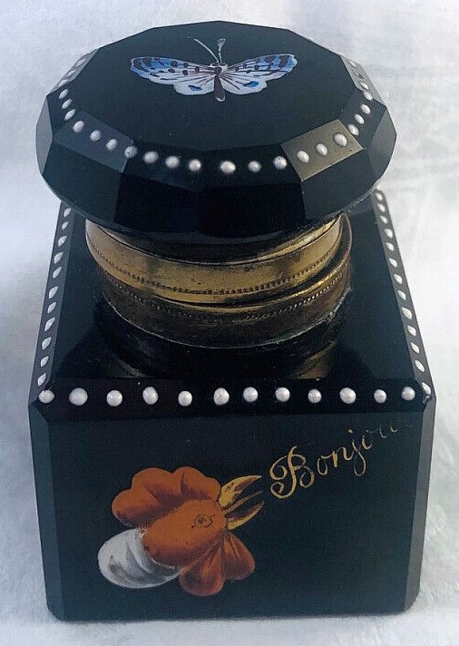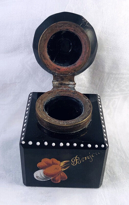 This black cut glass inkwell with beveled edges and corners and a faceted round top is hand painted on the lid, and on three of the four sides. The front has a red rooster head crowing “Bonjour”. The left side has a butterfly on a leafy green branch. The right side has a bee on a leafy branch. The top of the lid repeats the butterfly motif. Small white enameled dots circle the lid and upper body. The neck and lower lid are banded in brass.