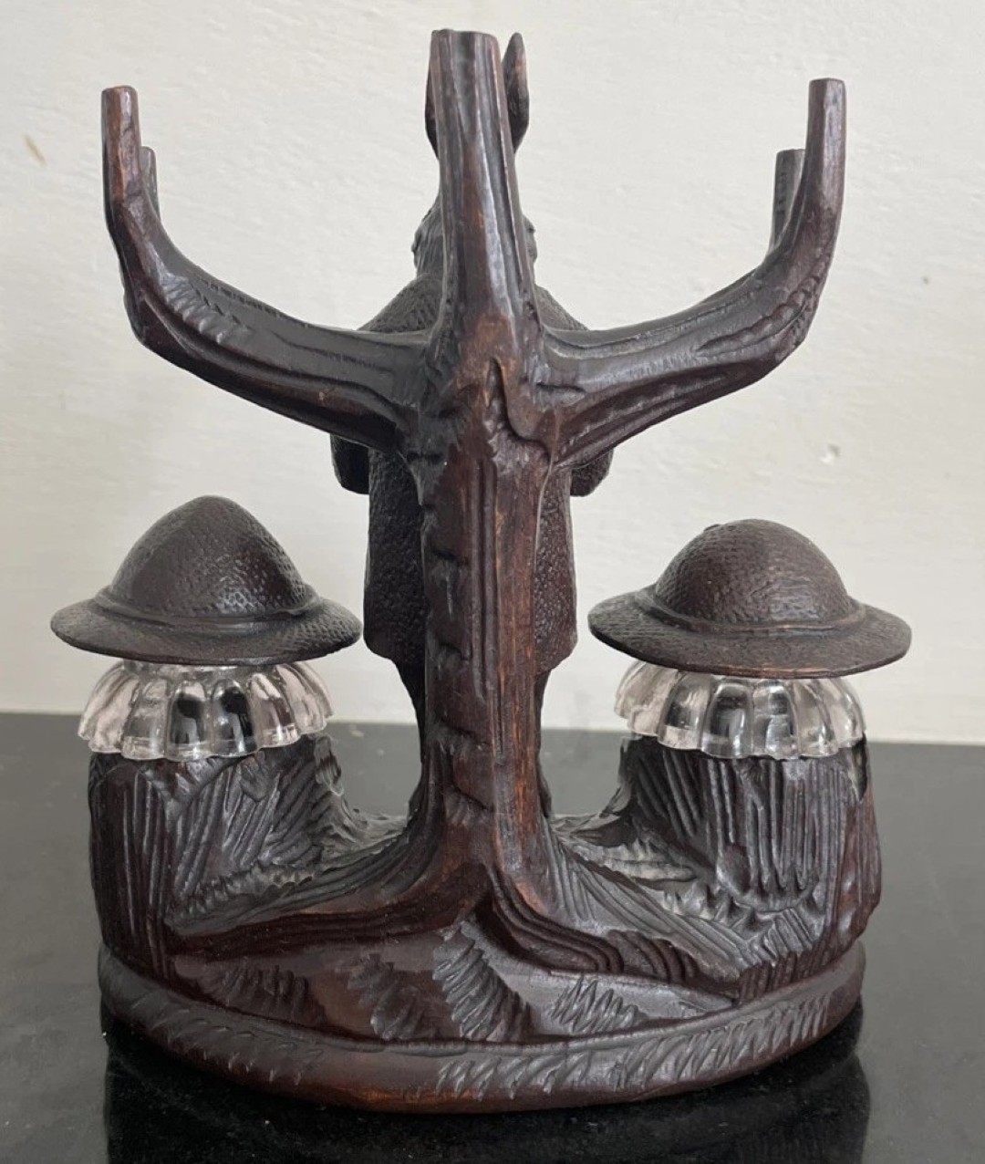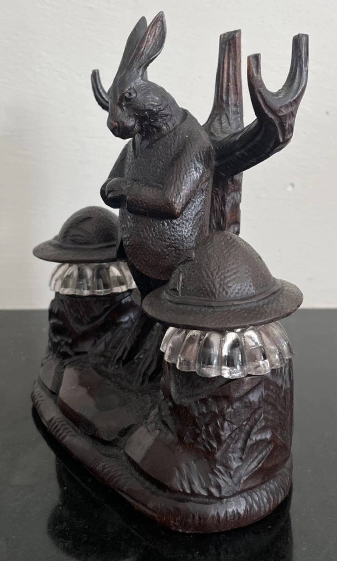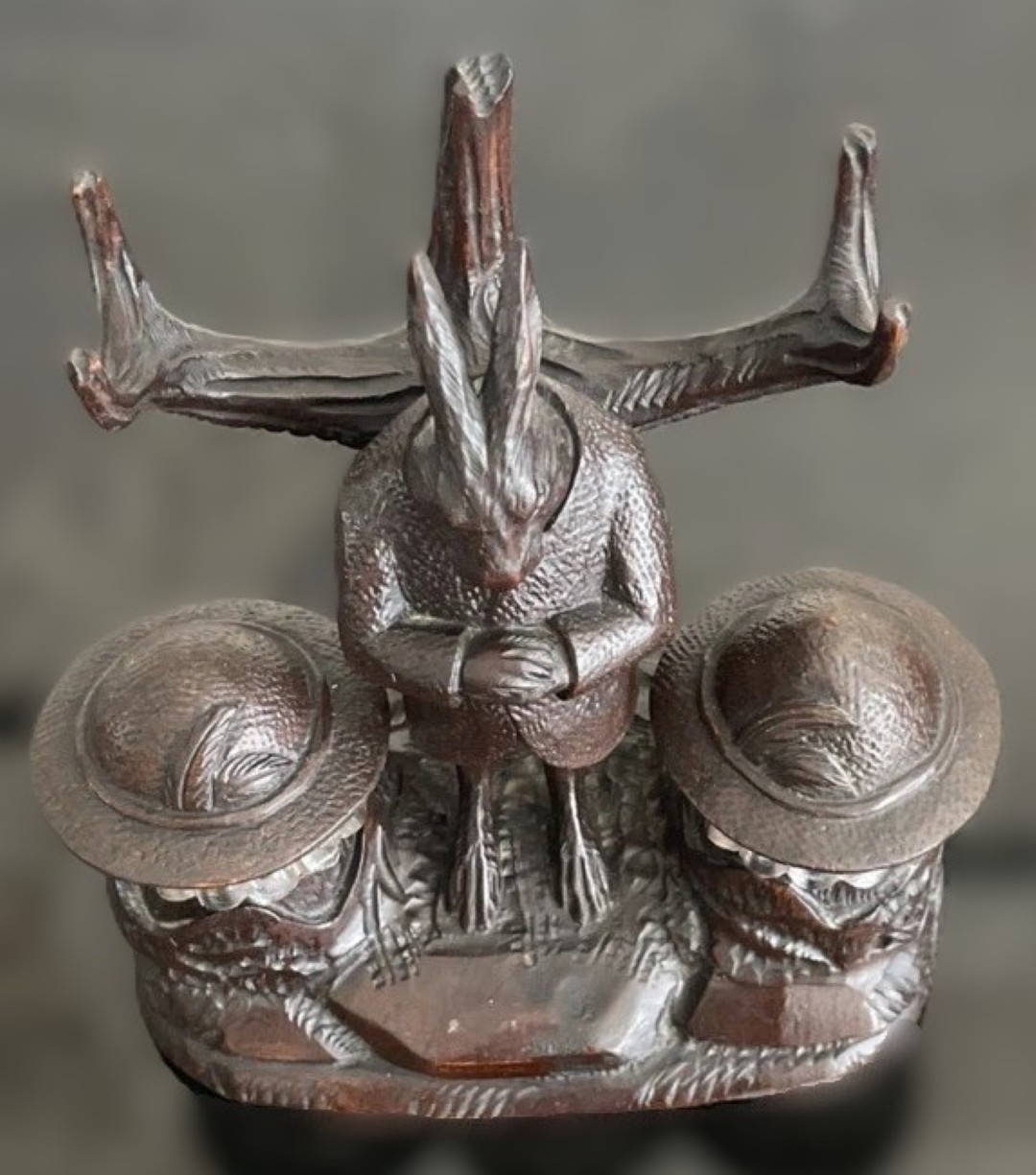 Flanking the rabbit are two glass inkwells, each topped with a hand-carved wooden lid shaped like a Tyrolean hat—complete with feather or brim detailing. These hats not only serve as lids but also reinforce the Alpine character of the piece, nodding to regional dress and folklore.