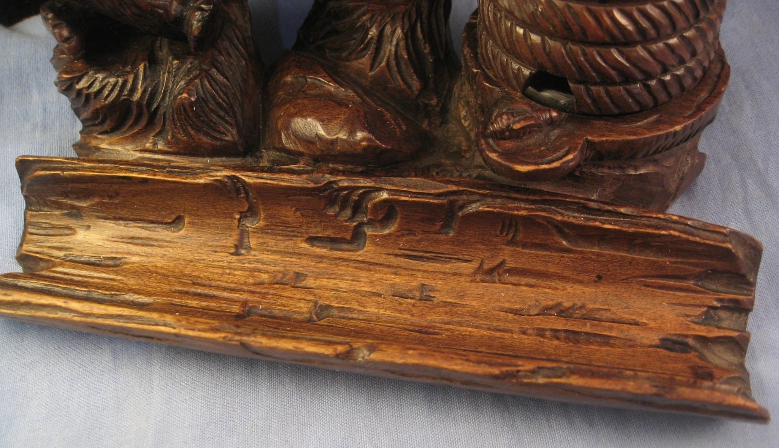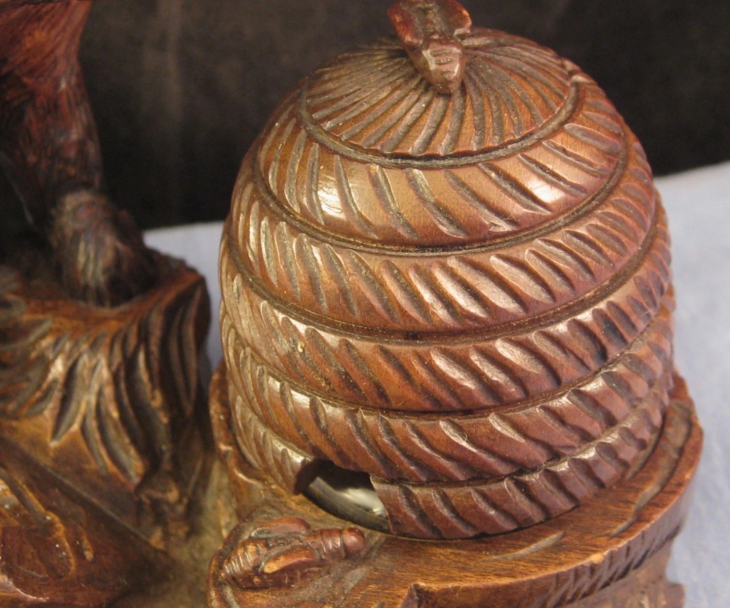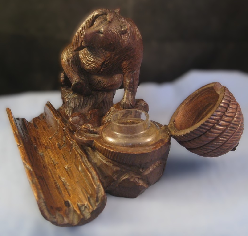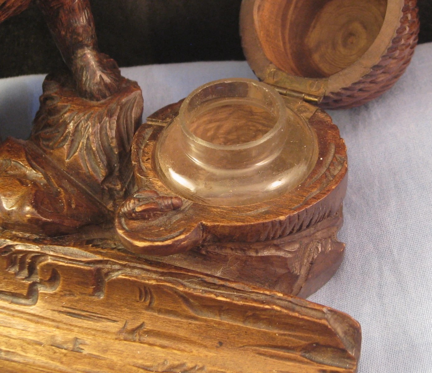 This is a charming example of a Black Forest (Schwarzwald) carved wood inkstand! The humorous subject matter and functional design are characteristic of this popular 19th-century decorative art style.