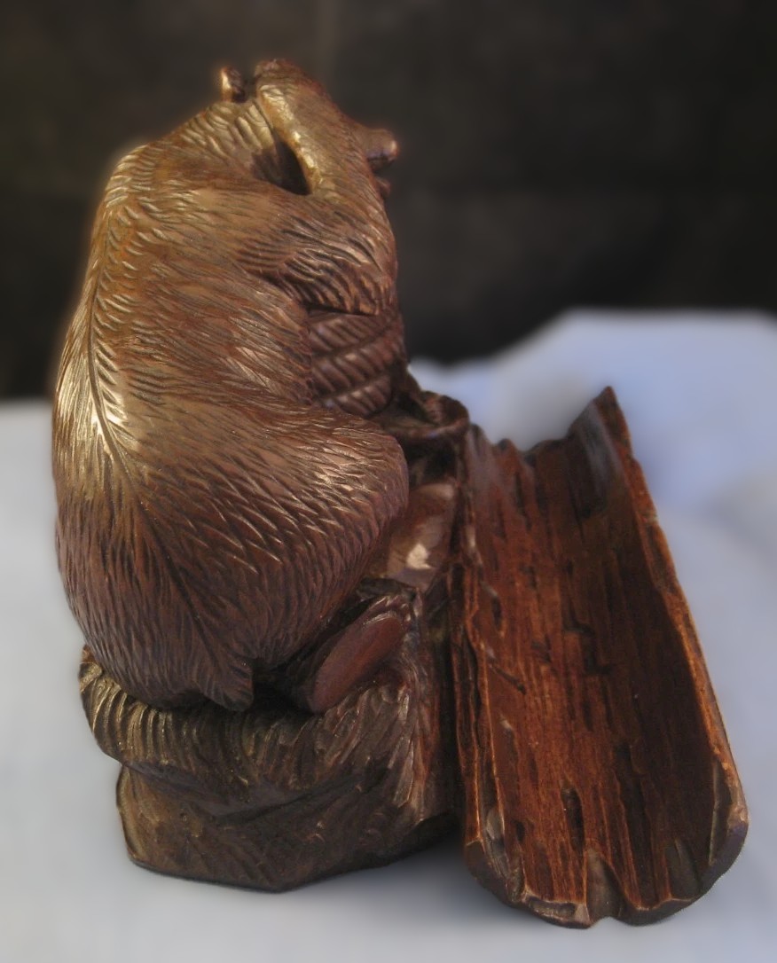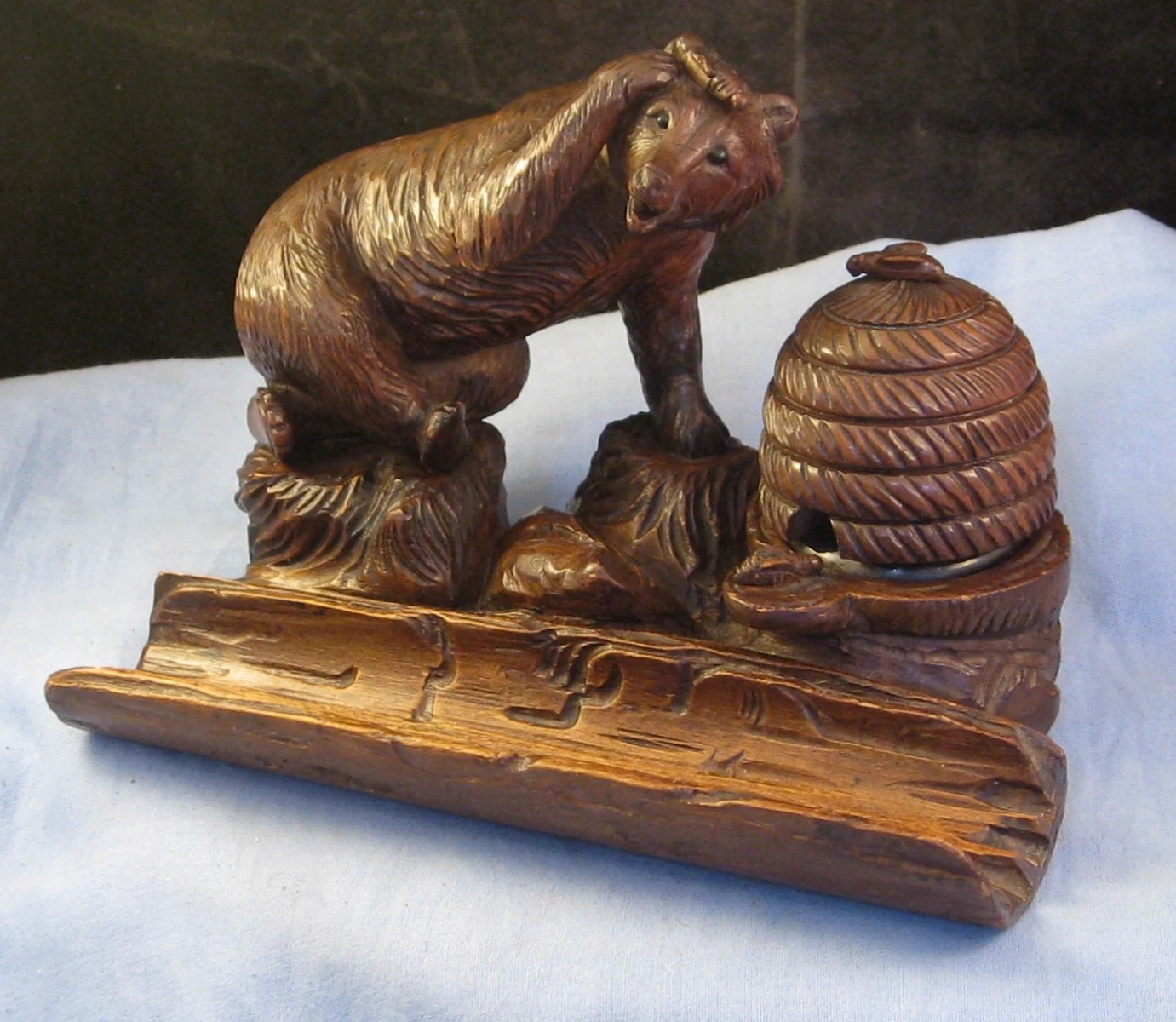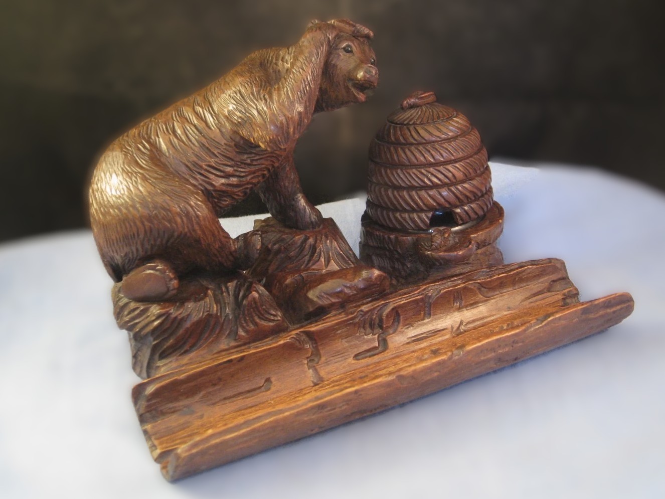 This is a charming example of a Black Forest (Schwarzwald) carved wood inkstand! The humorous subject matter and functional design are characteristic of this popular 19th-century decorative art style.