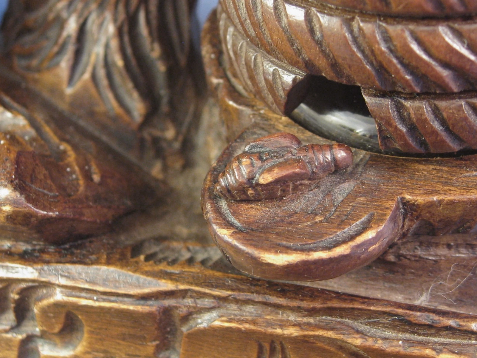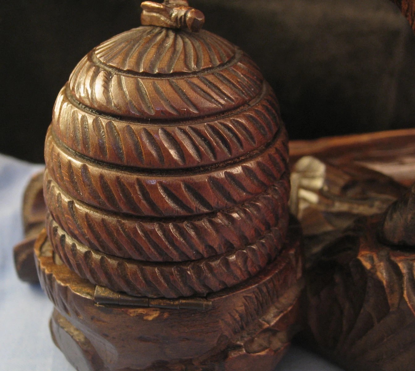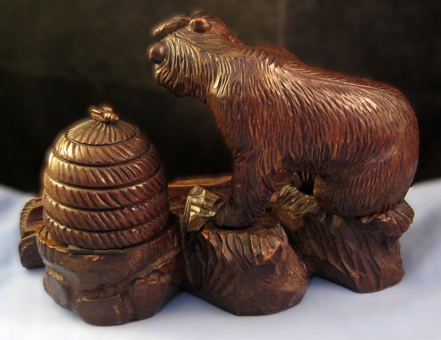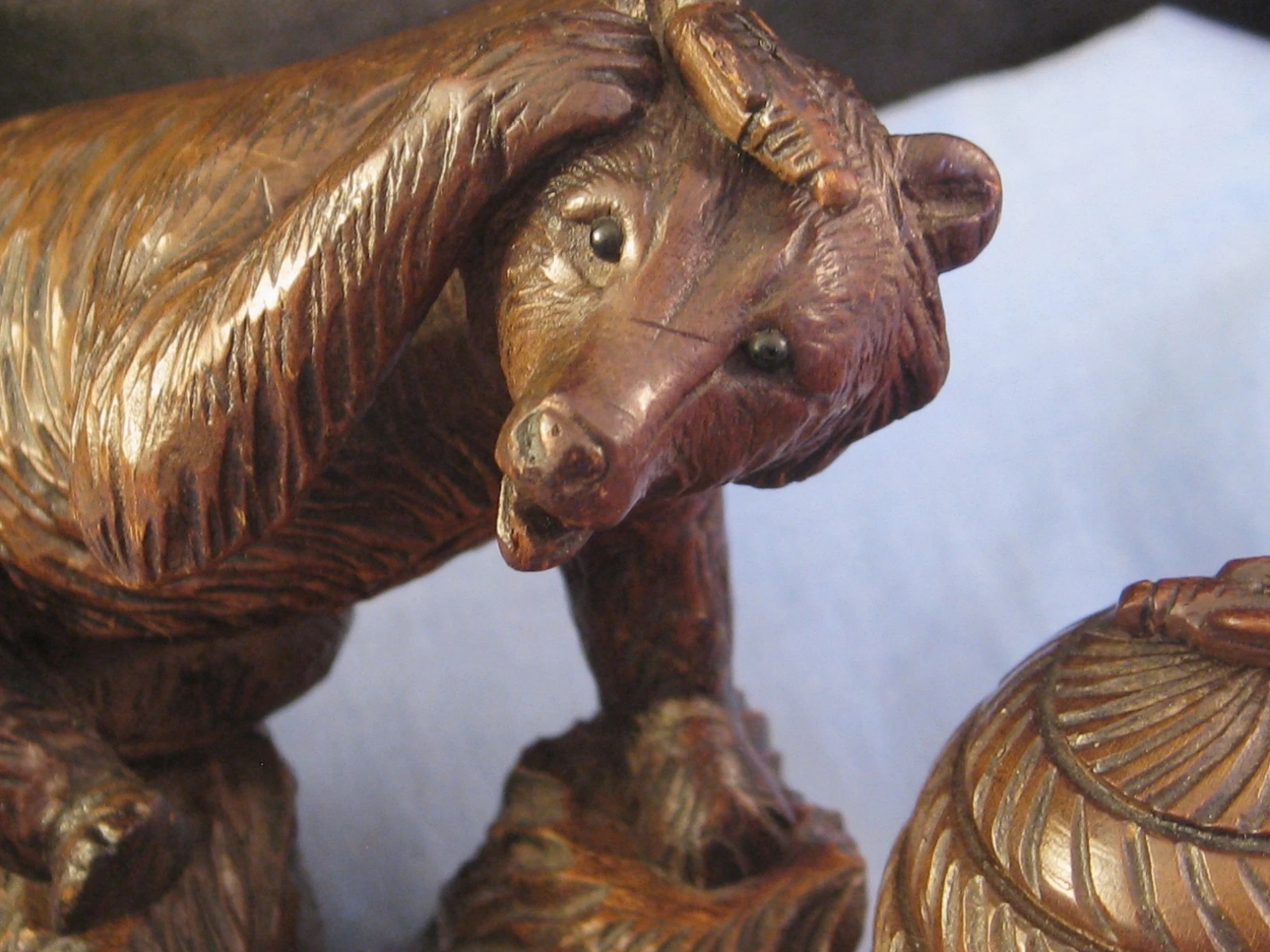 This is a charming example of a Black Forest (Schwarzwald) carved wood inkstand! The humorous subject matter and functional design are characteristic of this popular 19th-century decorative art style.